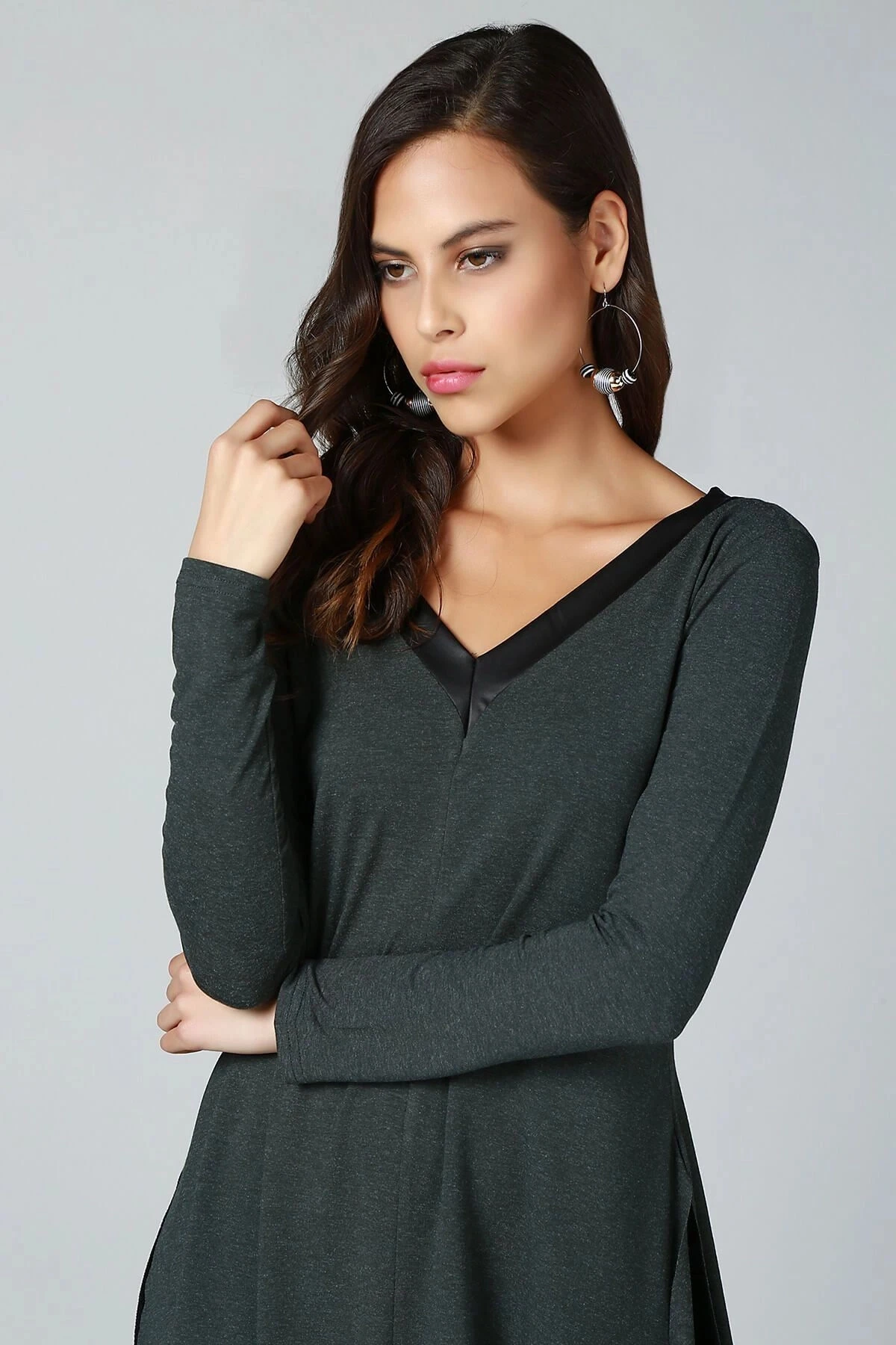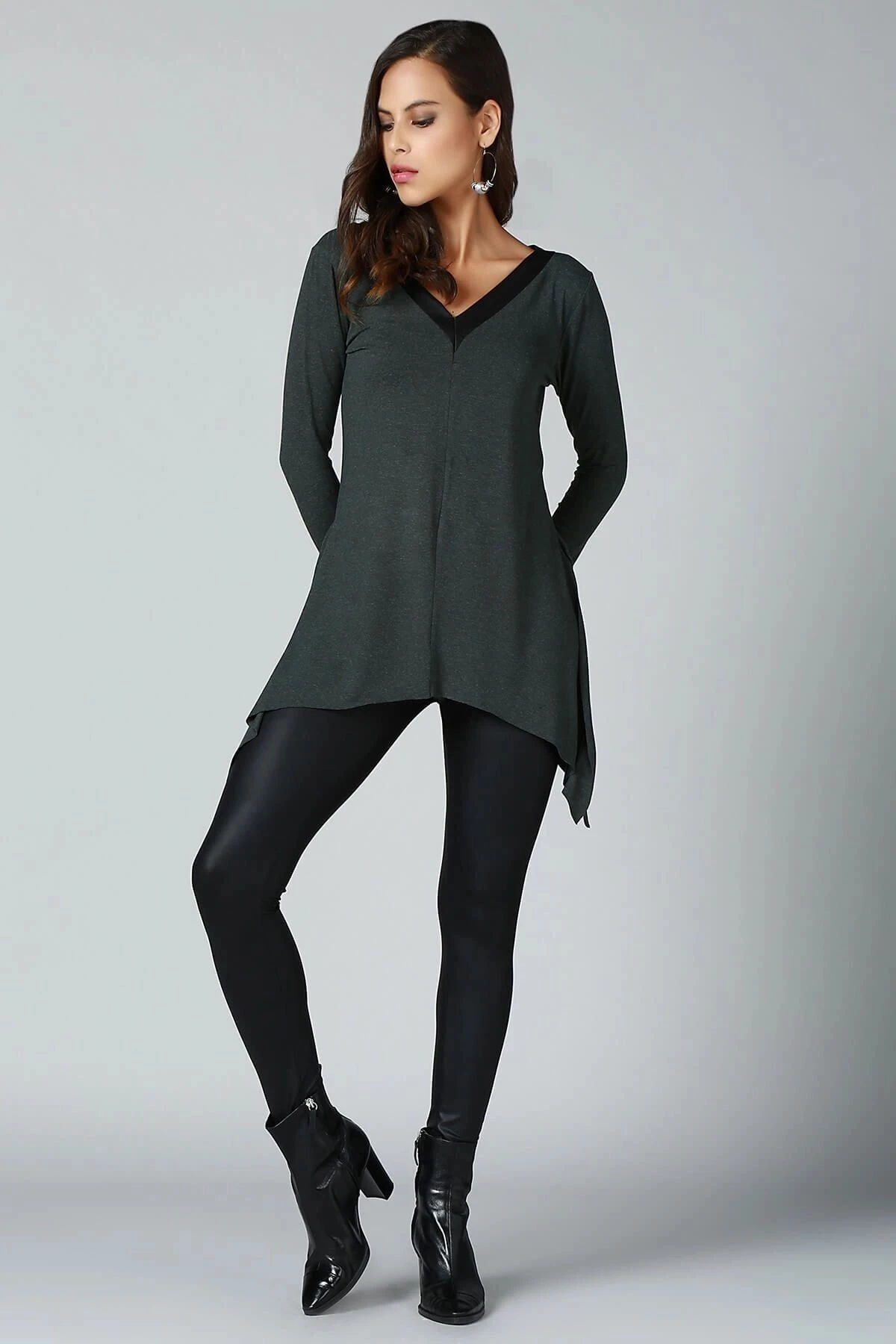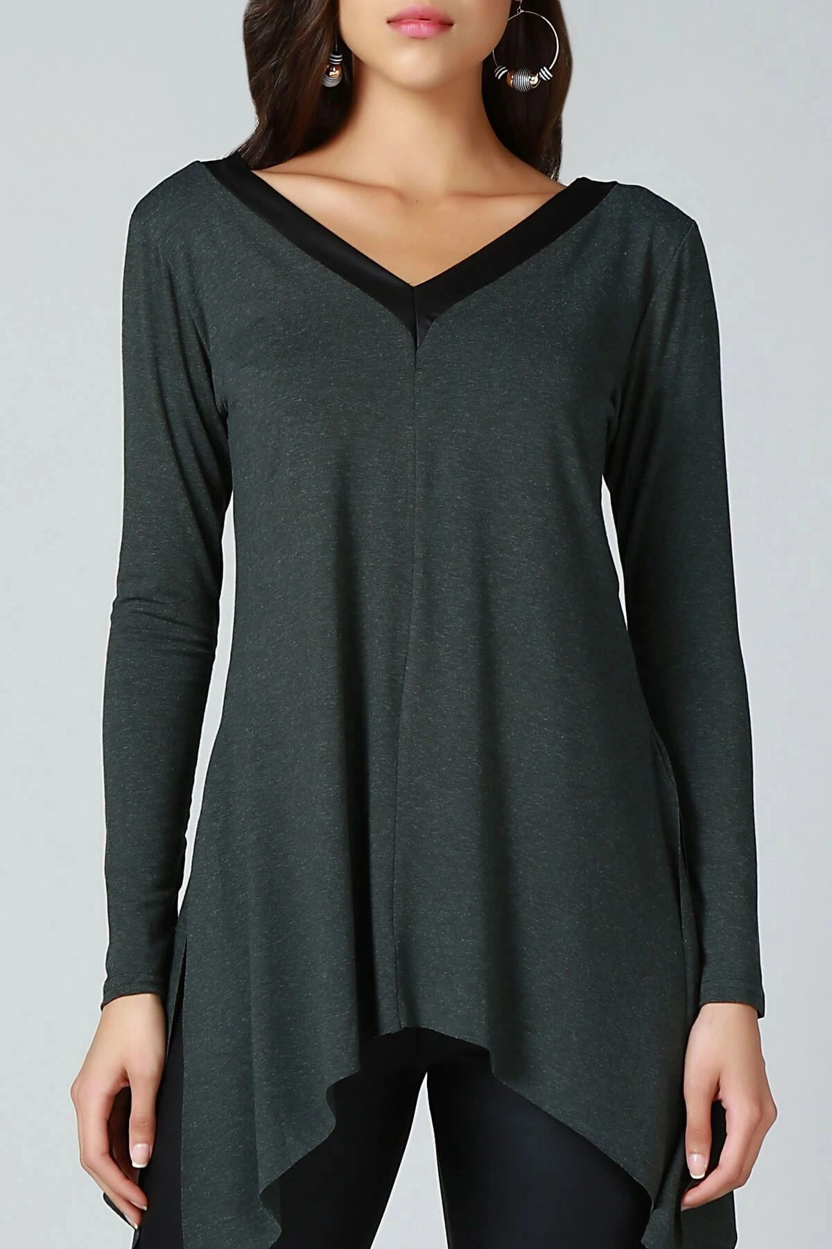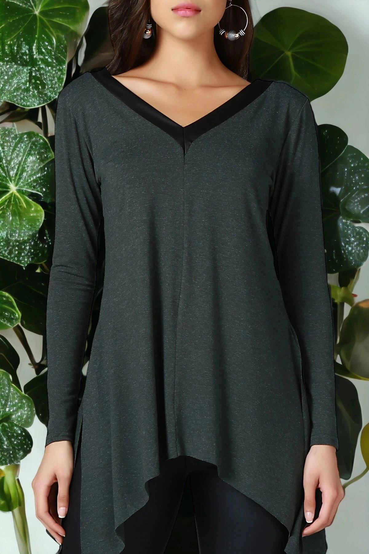 Kadın Haki V Yaka Uzun Kol Asimetrik Kesim Biye Detaylı Kaliteli Kumaş Oversize Kesim Tunik