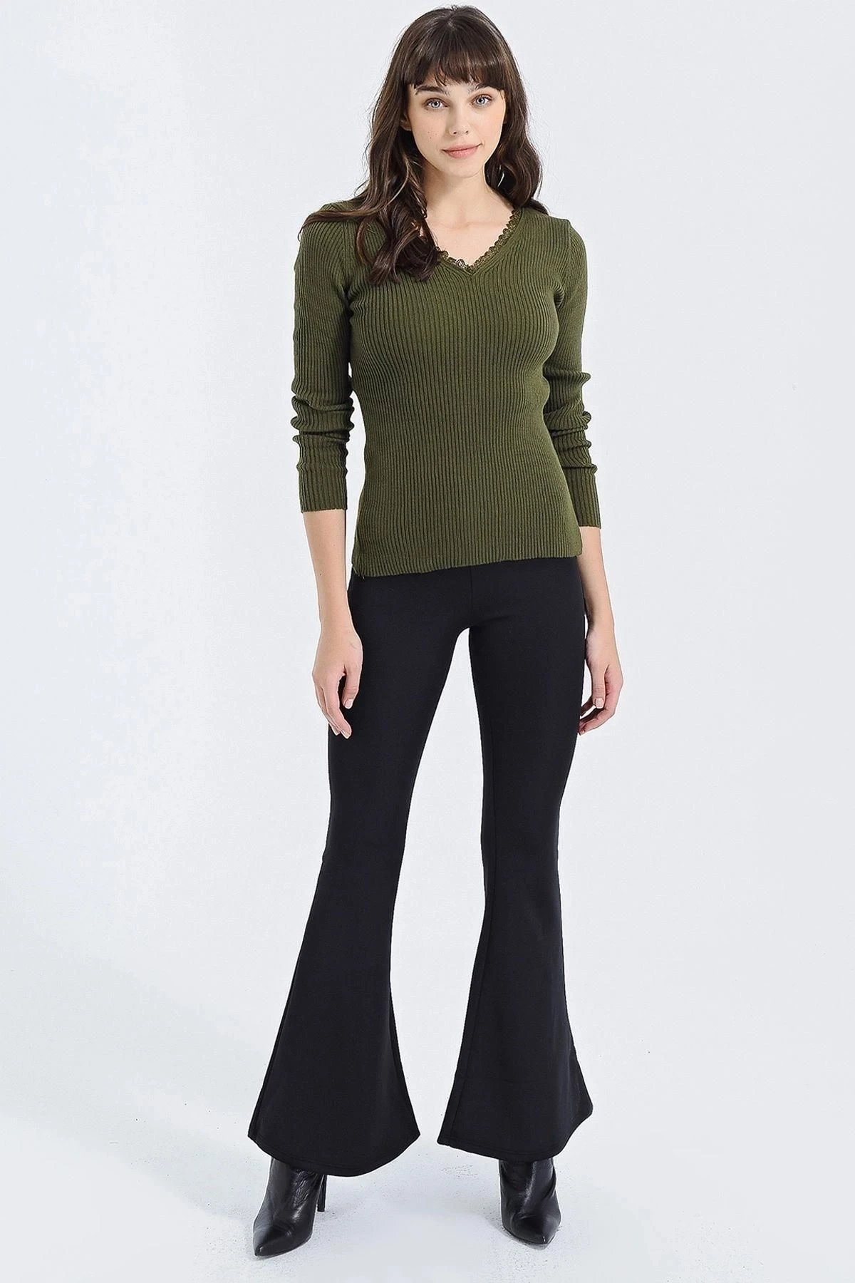 Kadın Haki V Yaka, Uzun Kol, Dantel Detaylı, Regular Kesimli, Standart Boy Triko