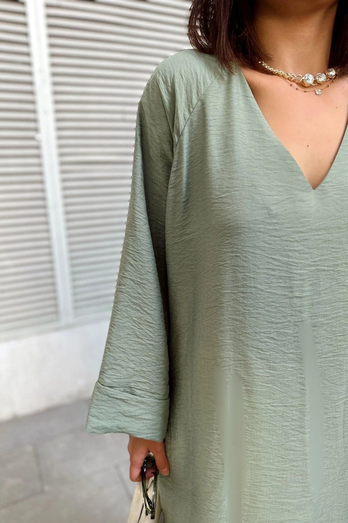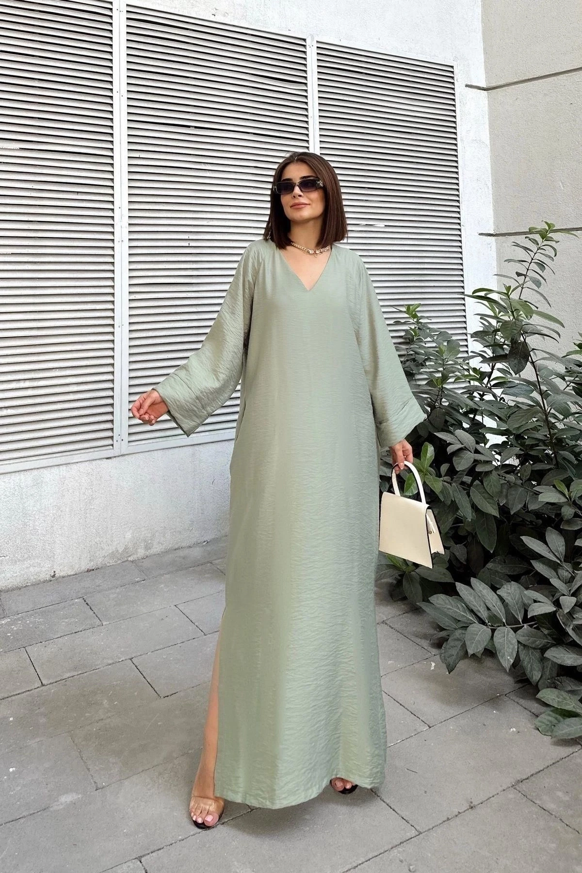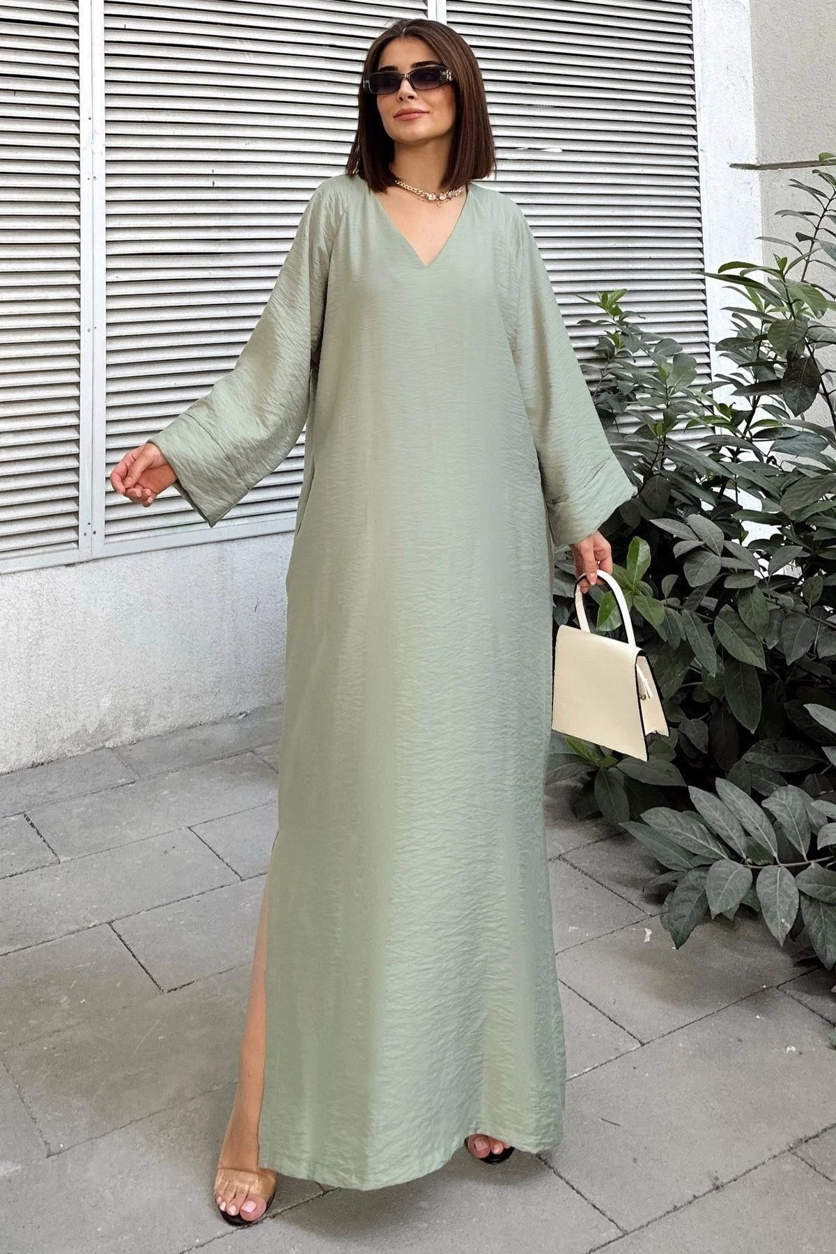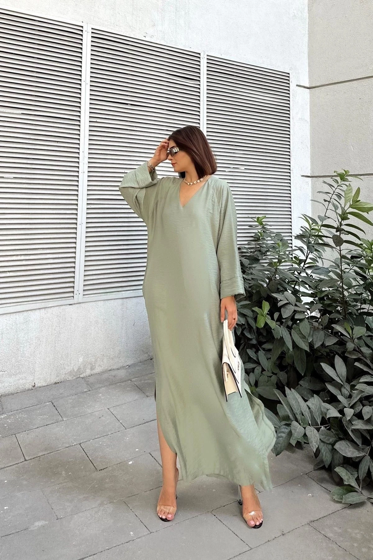 Kadın Haki V Yaka, Uzun Kol, Duble Manşet, Yırtmaçlı, Basic A Kesim, Oversize Uzun Elbise