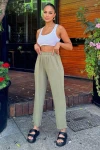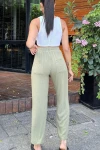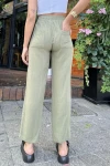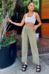 Kadın Haki Yüksek Bel, Cepli, Rahat Kesim, Keten Pantolon