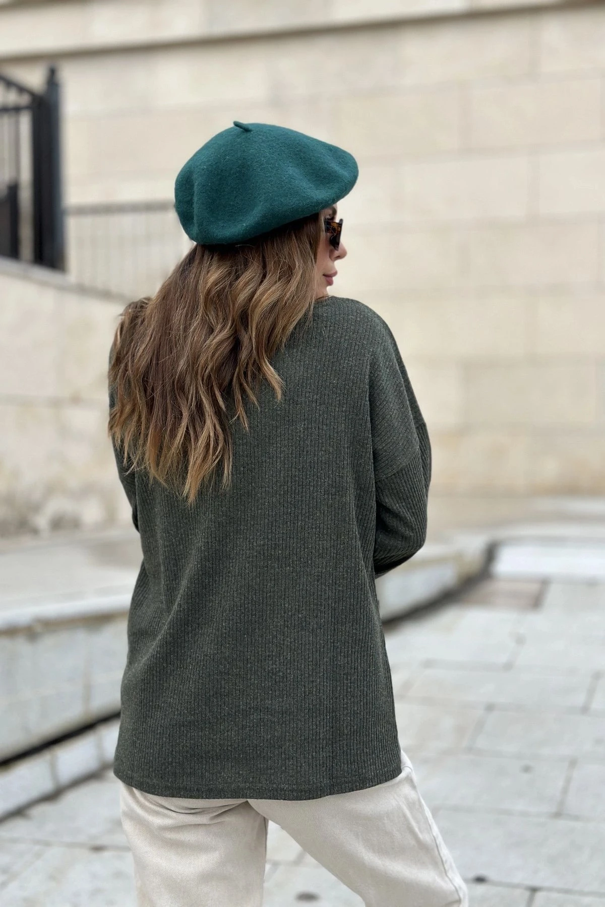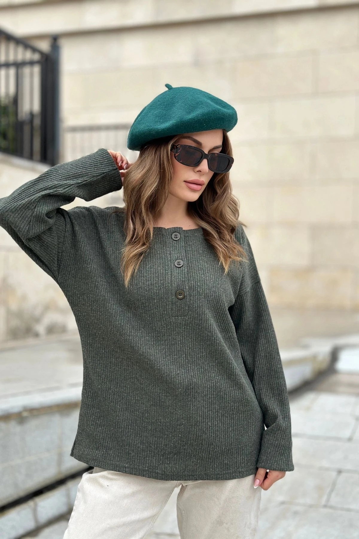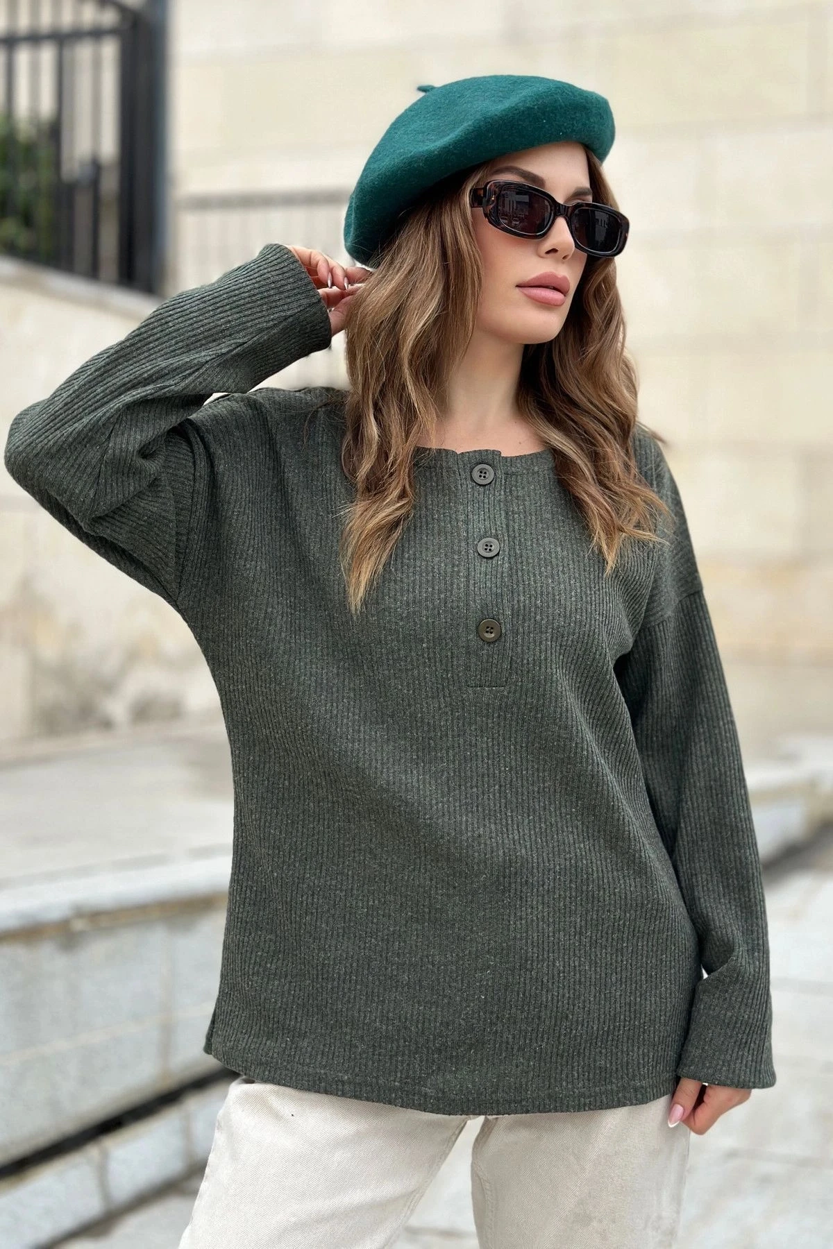 Kadın Haki Yumuşak Dokulu Düğmeli Triko Kazak, Uzun Kol, Regular Kesim, Standart Boy.
