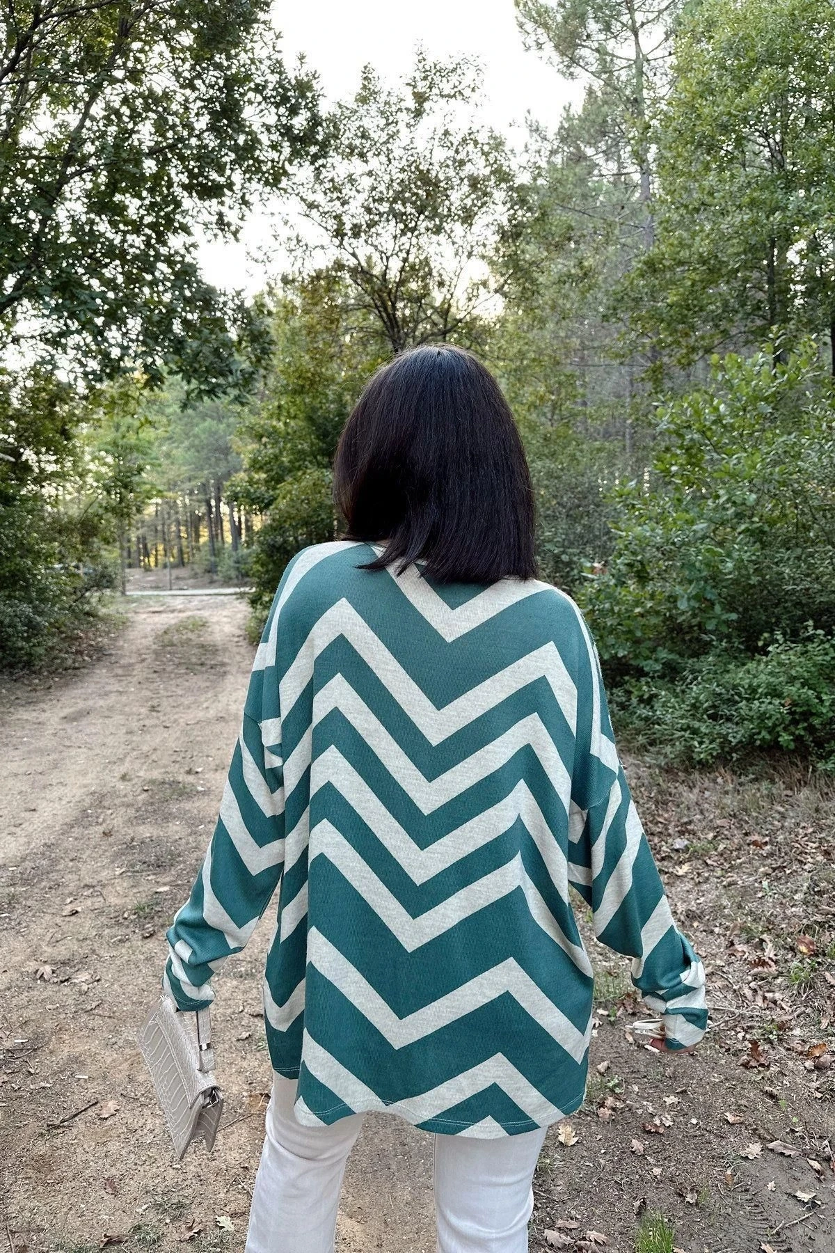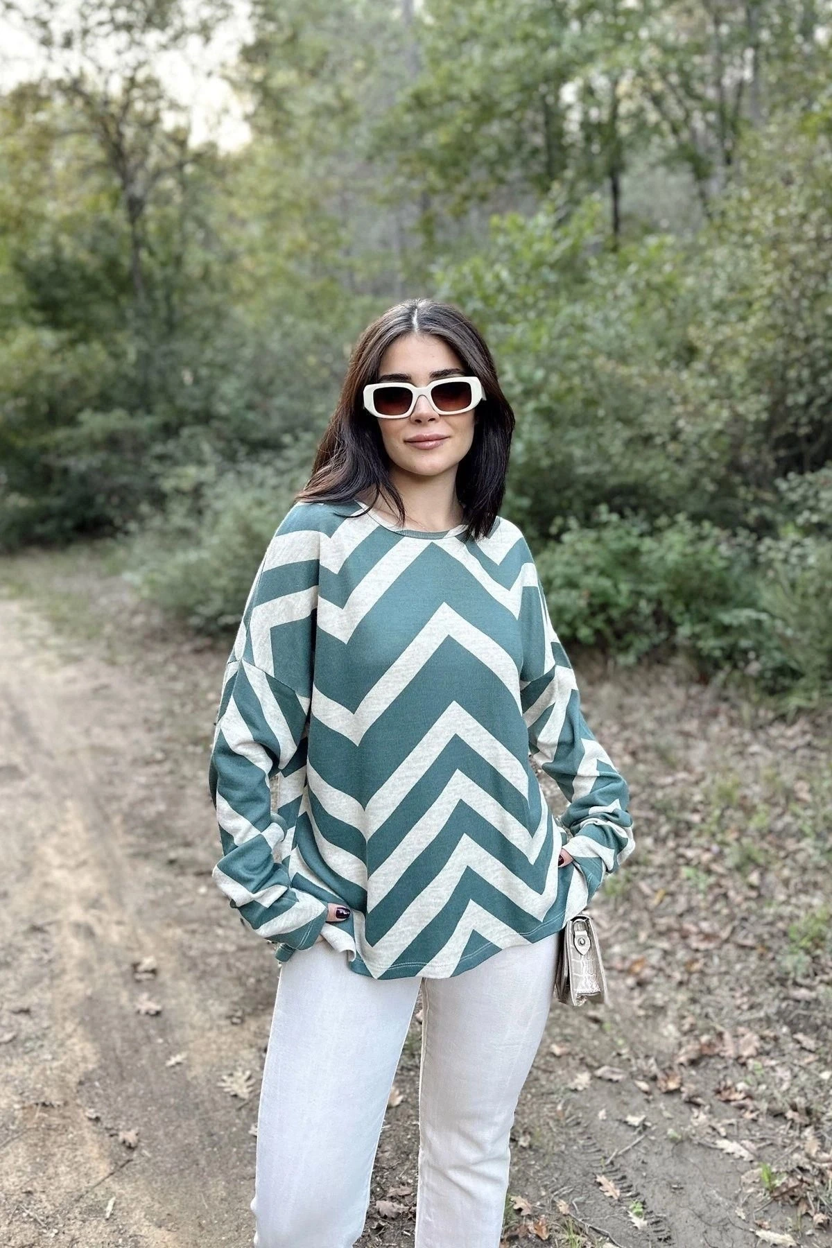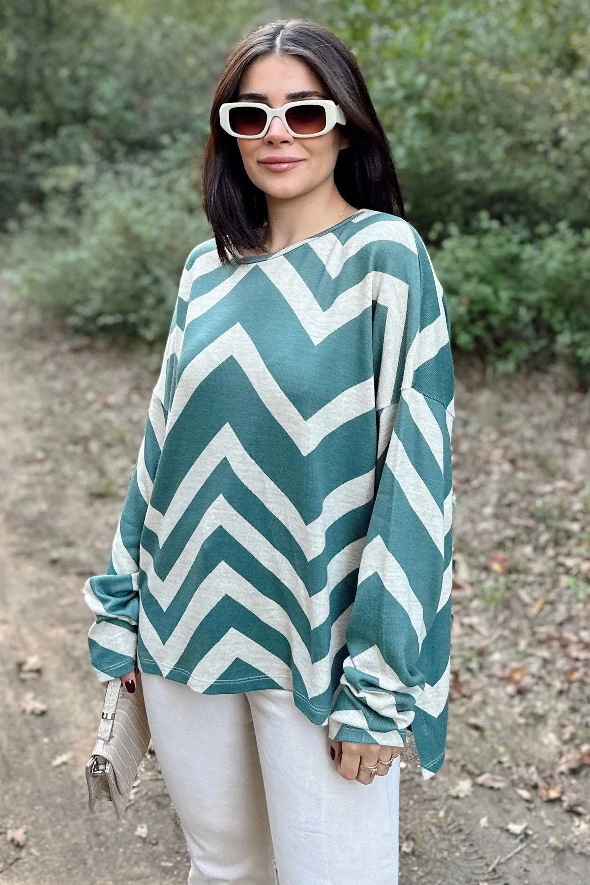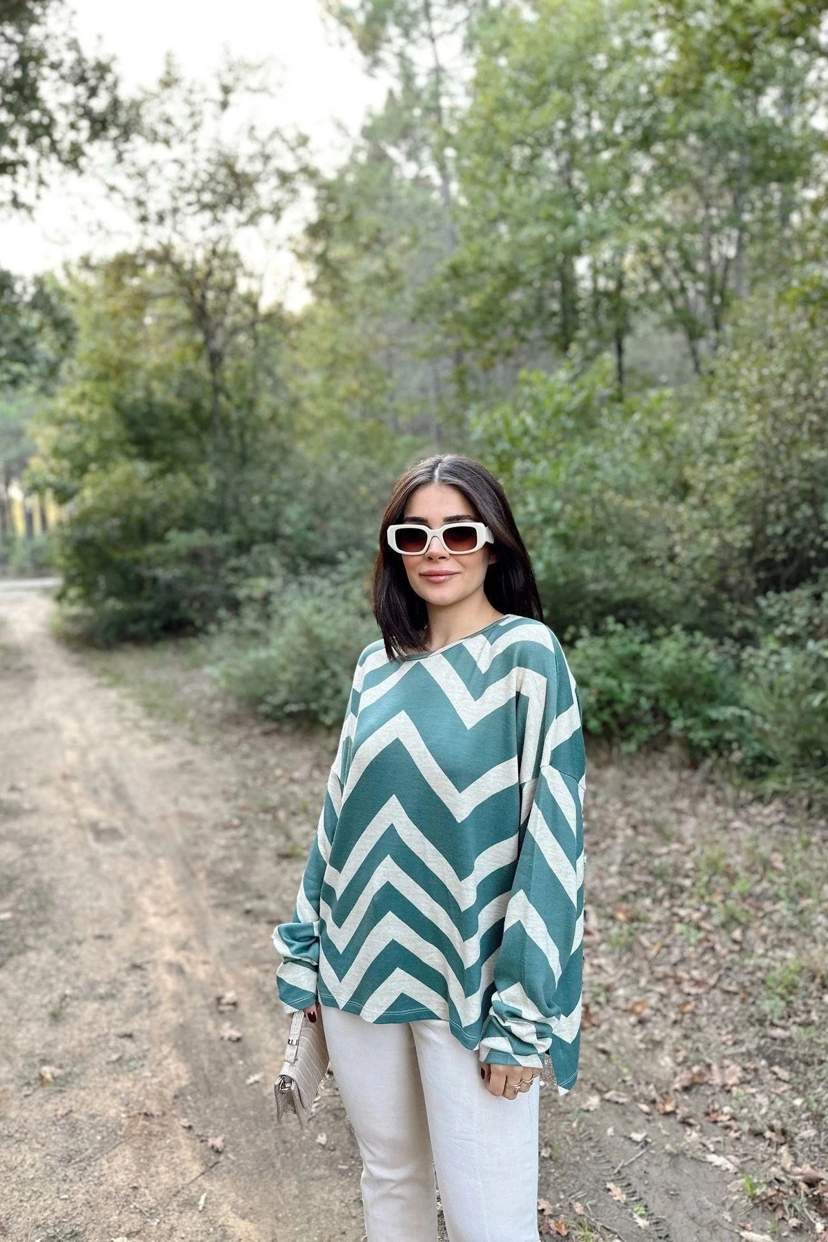 Kadın Haki Yuvarlak Yaka, Uzun Kollu, Zigzag Desenli, Salaş Bluz