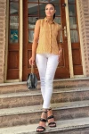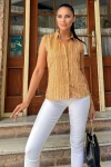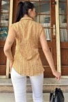 Kadın Hardal Çizgili Desen, Dokulu Bodrum Kumaş, Kolsuz Rahat Gömlek