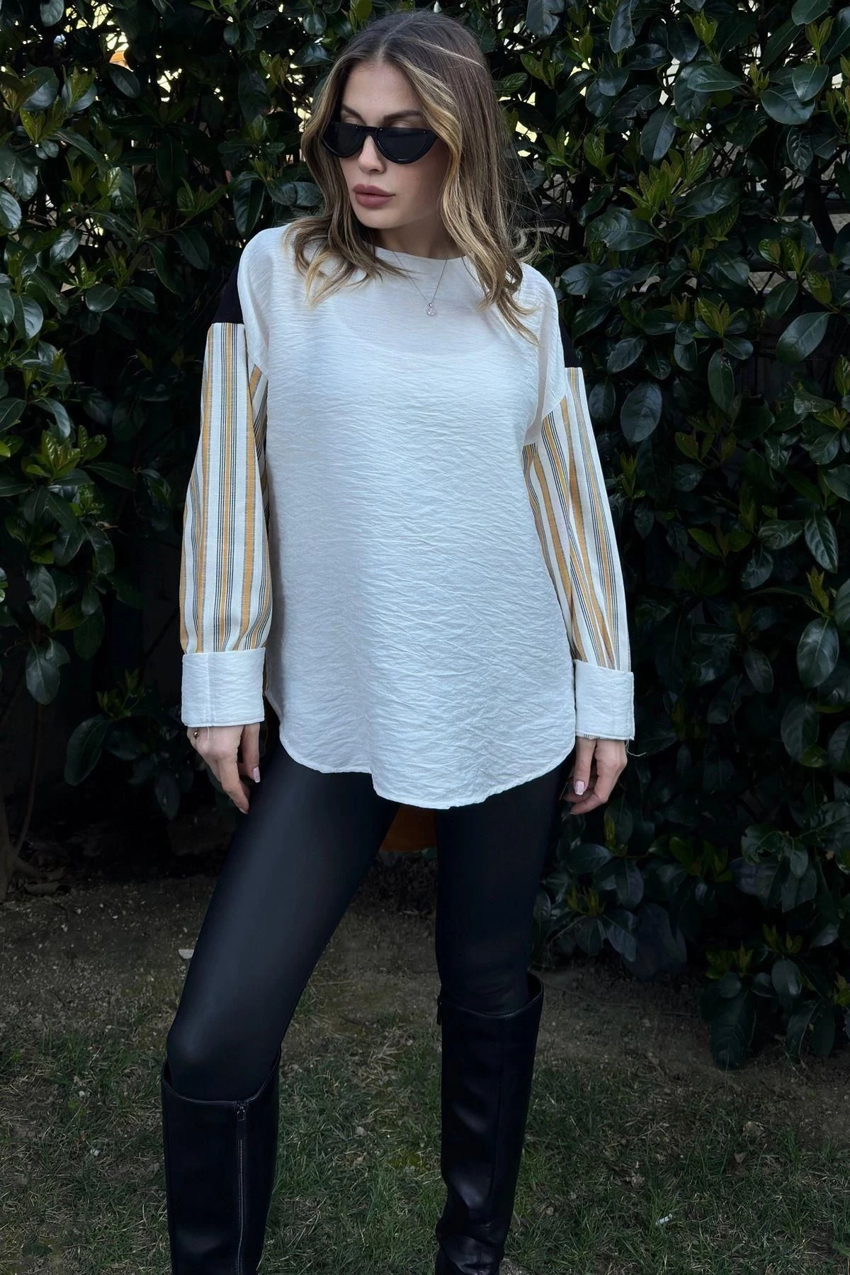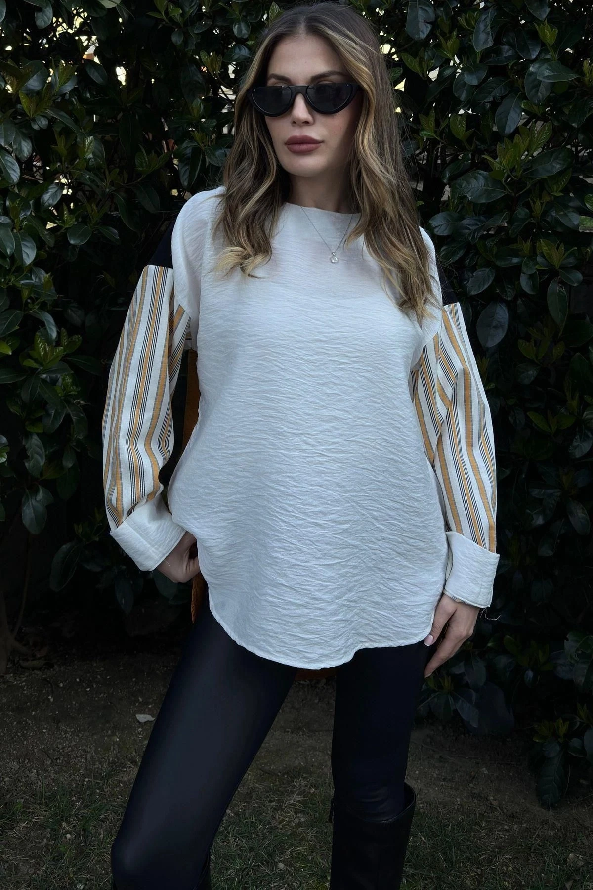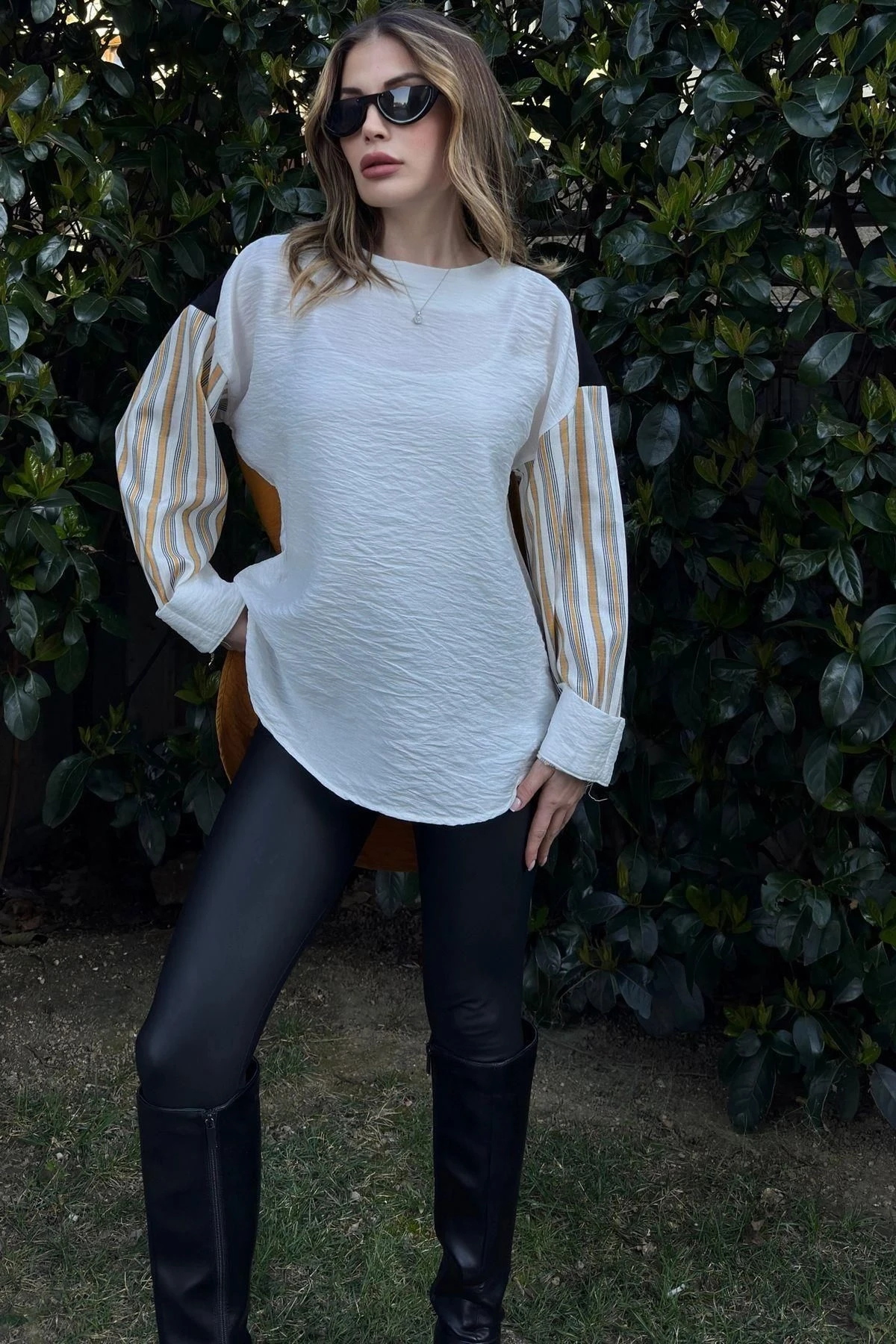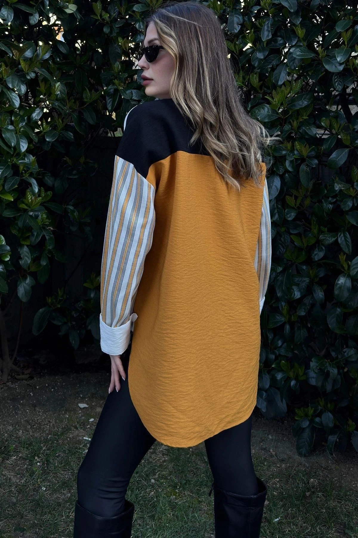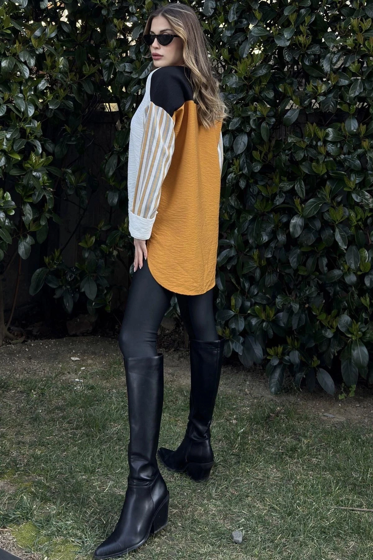 Kadın Hardal Color Block, Eteği Oval Kesim, Salaş Keten Bluz