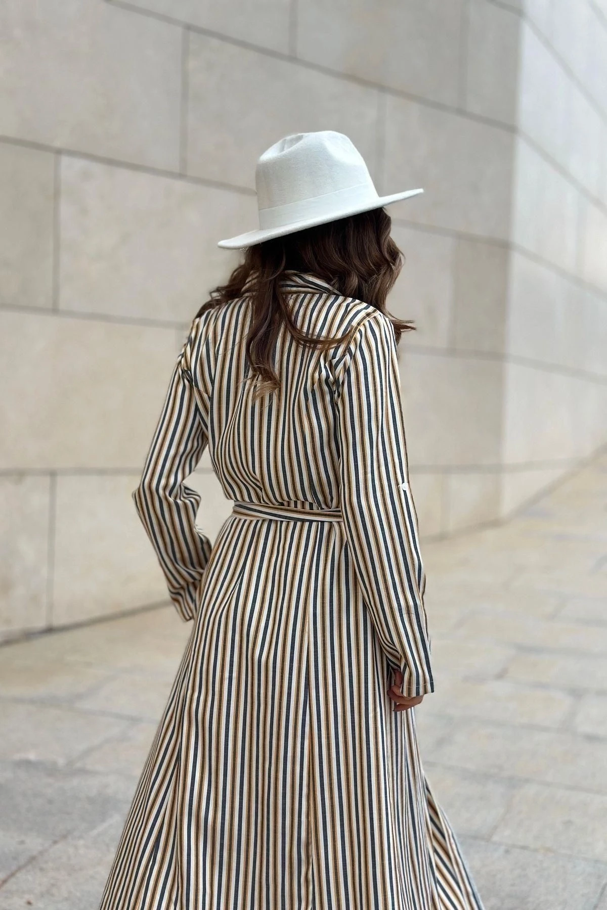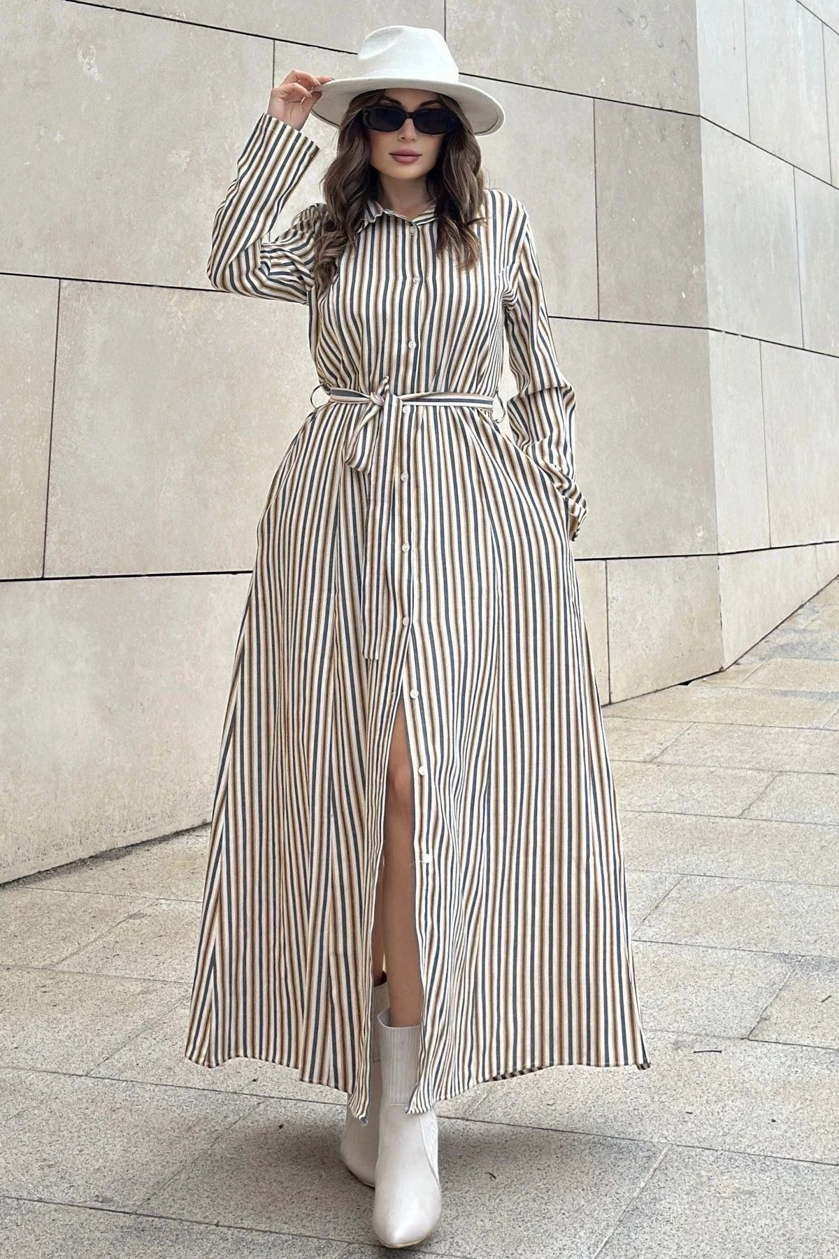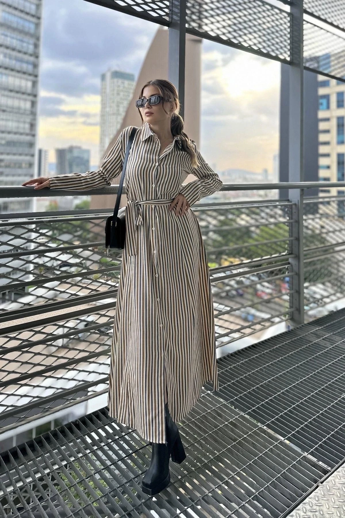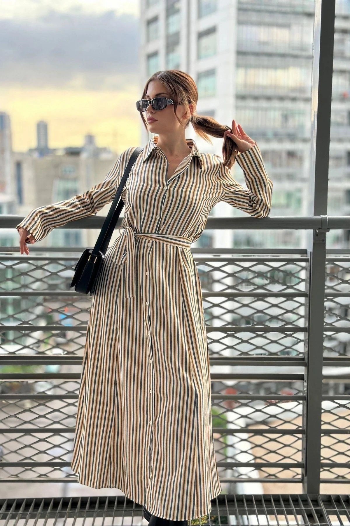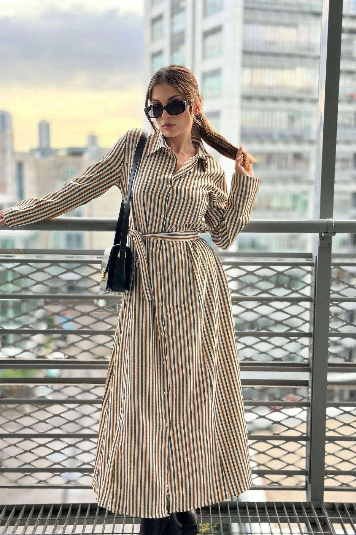 Kadın Hardal & Ekru Çizgili Uzun Kol, Rahat Beli Kemerli, Cepli, Keten, Maksi Gömlek Elbise