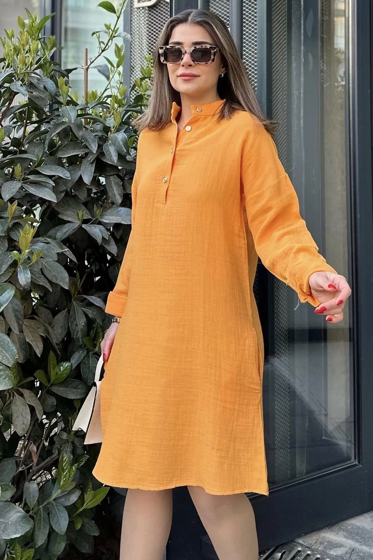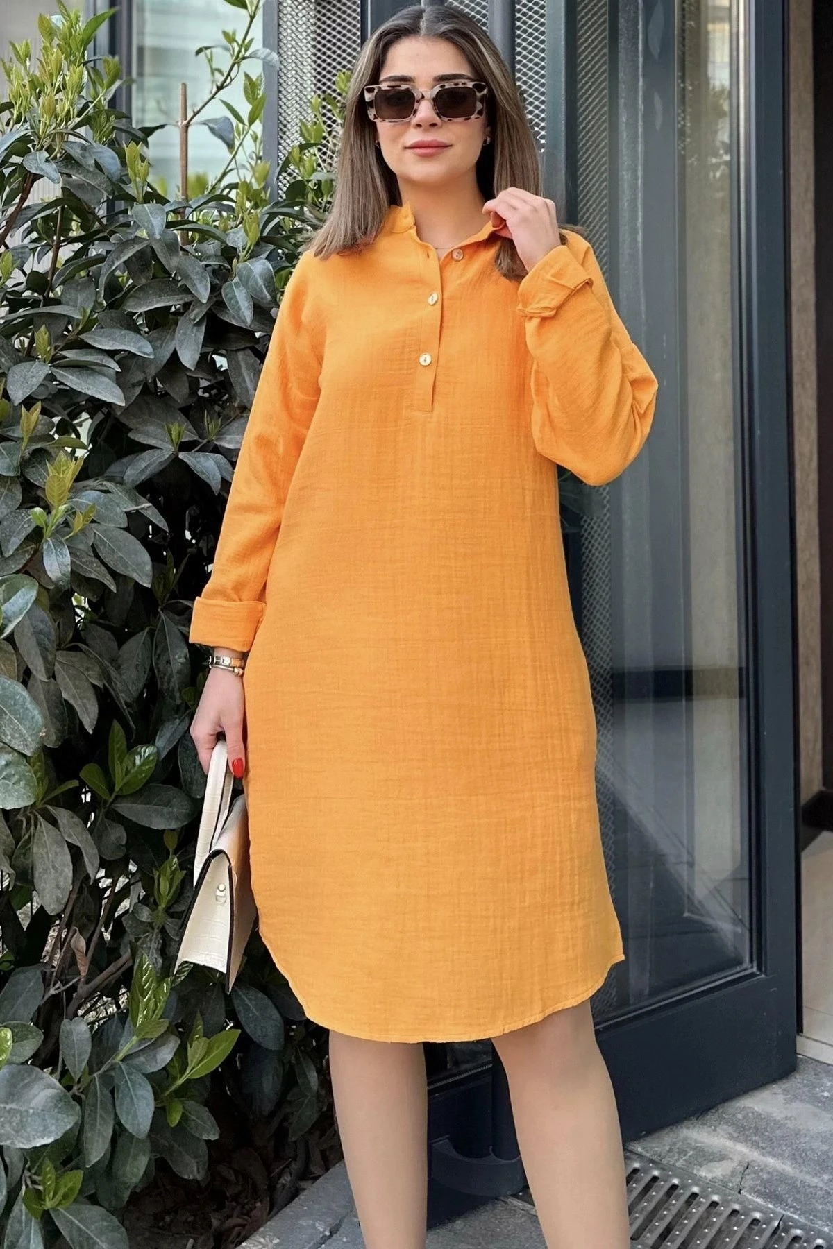 Kadın Hardal Hakim Yaka, Katlamalı Geniş Kol, Midi & Oversize Kesim, Salaş Müslin Elbise