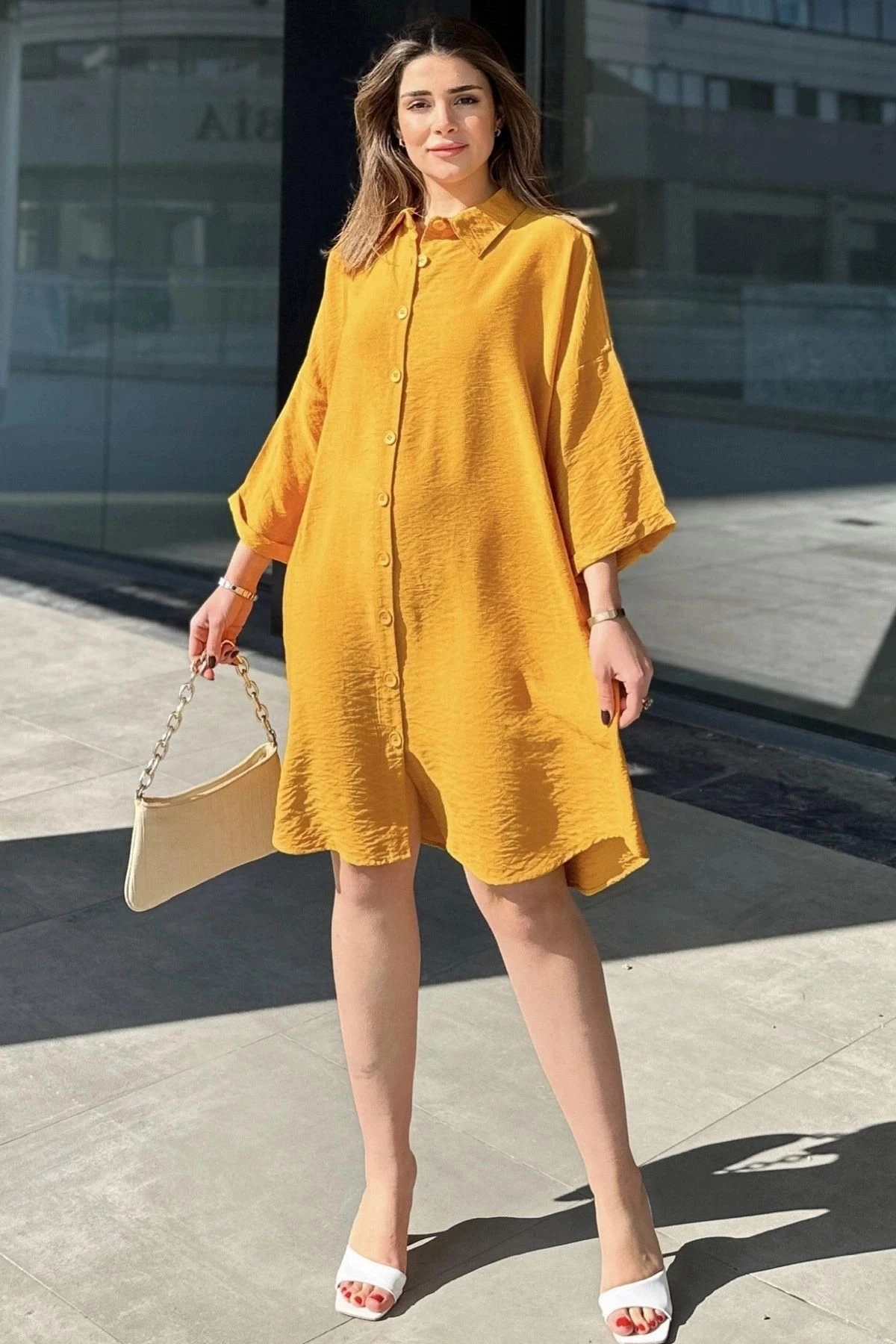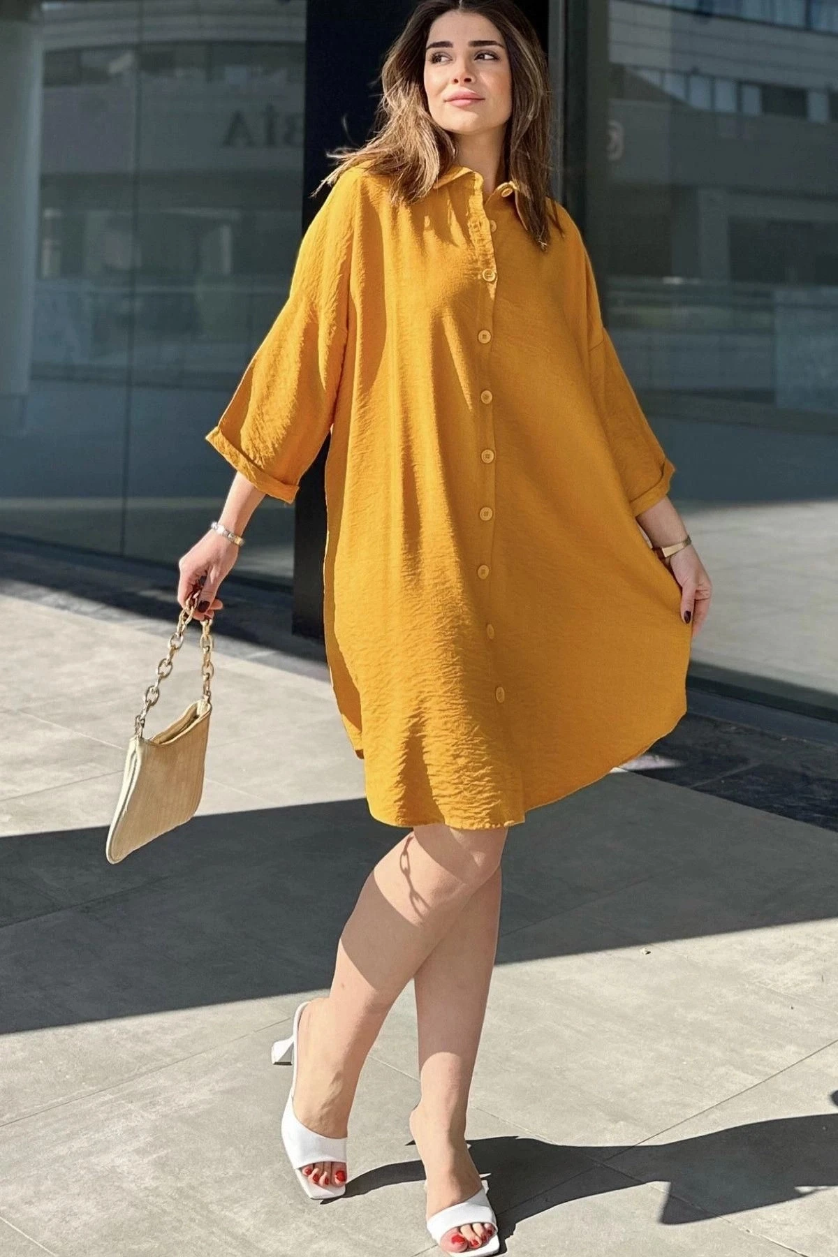 Kadın Hardal Katlamalı Yarım Kol, Eteği Oval Kesim, Midi Boy, Salaş Keten Gömlek Elbise