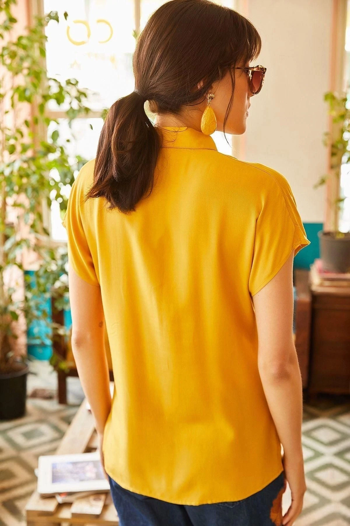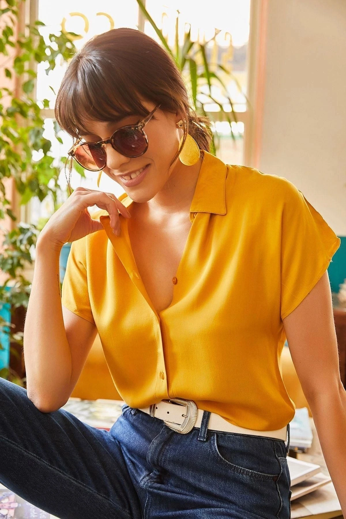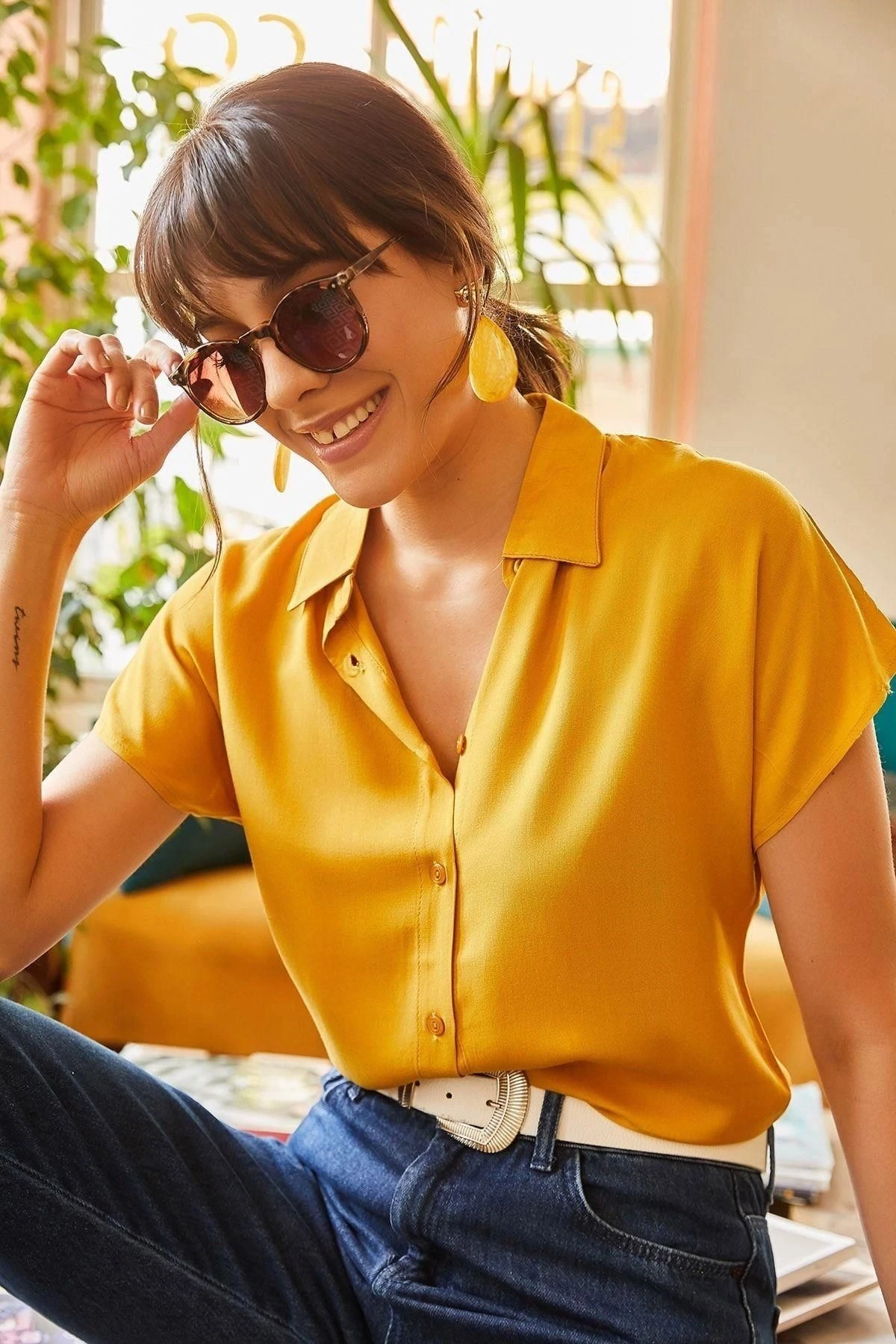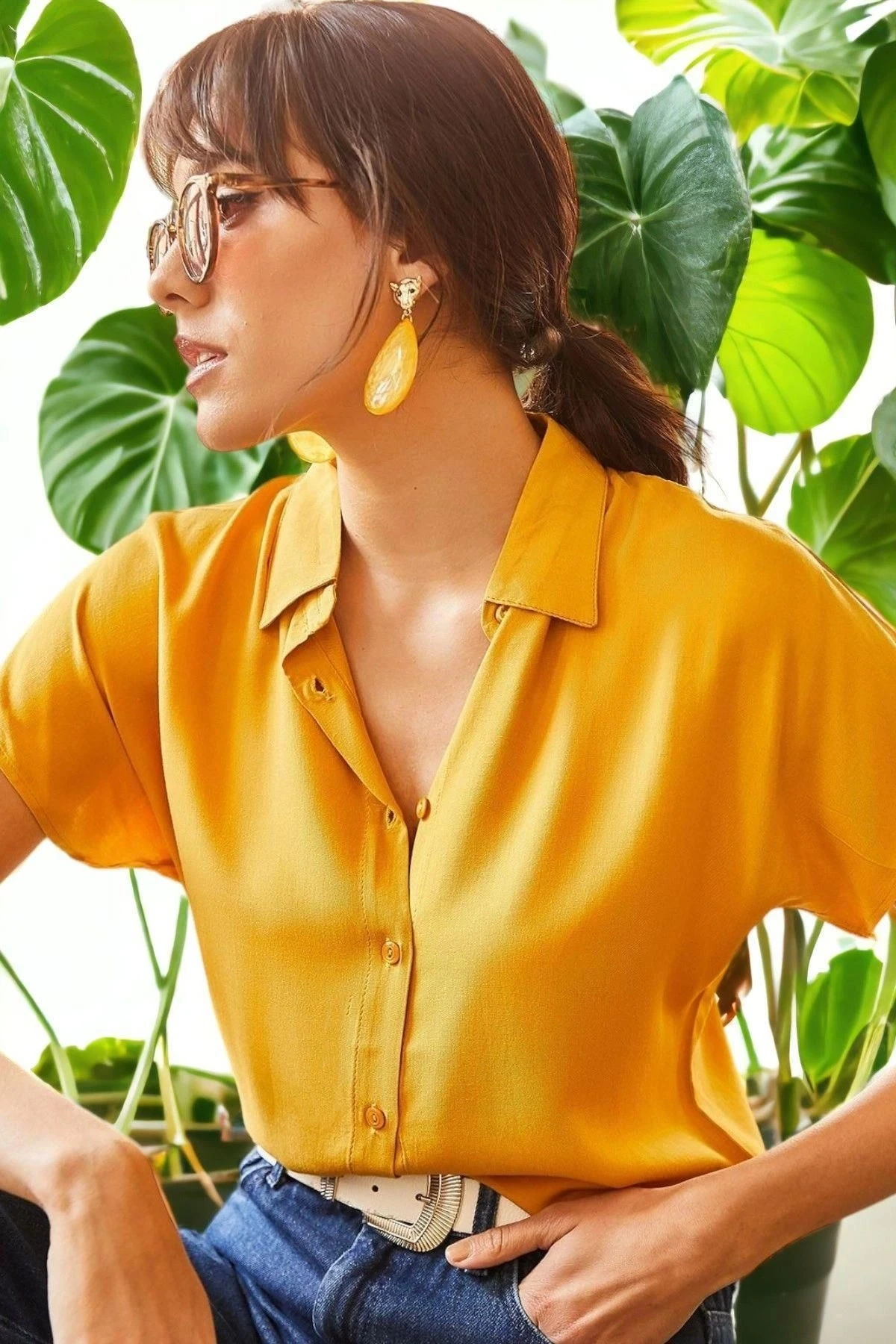 Bu Hardal Renk Kısa Kol Basic Polo Yaka Regular Kesim Standart Boy Gömlek, şık ve rahat bir tarza sahip olan bir parçadır.; Kumaş içeriği %100 viskozdan oluşur, bu da giysinin yumuşak, hafif ve nefes alabilen bir yapıya sahip olduğunu gösterir.; Bu gömlek, canlı hardal rengiyle dikkat çeken bir tasarıma sahiptir.; Hardal rengi, modern ve enerjik bir tarzı yansıtırken aynı zamanda sıcaklık ve samimiyet hissi verir.; Bu renk, herhangi bir kombinasyonla mükemmel bir şekilde uyum sağlayarak gardırobunuzun vazgeçilmez bir parçası olacak.; Gömleğin kesimi, regular kesimdir ve standart boyutta üretilmiştir, böylece her bedene uyum sağlar.; Polo yaka tasarımı, şık ve spor bir görünüm yaratırken aynı zamanda rahat bir kullanım sunar.; Kısa kollu olması, sıcak havalarda serin ve ferah bir his sağlar.; Bu gömlek, kaliteli viskoz kumaşı sayesinde günlük kullanım için mükemmel bir seçimdir.; Viskoza, cildinize yumuşak bir dokunuş sunarken aynı zamanda havayı geçirgenliği ile terlemeyi azaltır.; Bu özellikleri sayesinde, gömlek gün boyu konforlu ve rahat bir şekilde kullanabileceğiniz bir seçenektir.; Hardal Renk Kısa Kol Basic Polo Yaka Regular Kesim Standart Boy Gömlek, kaliteli tasarımı ve rahatlığı ile gardırobunuzun vazgeçilmez bir parçası olacak.; Hem günlük hem de özel günlerde şık ve rahat bir görünüm elde etmek isteyenler için ideal bir seçenektir.