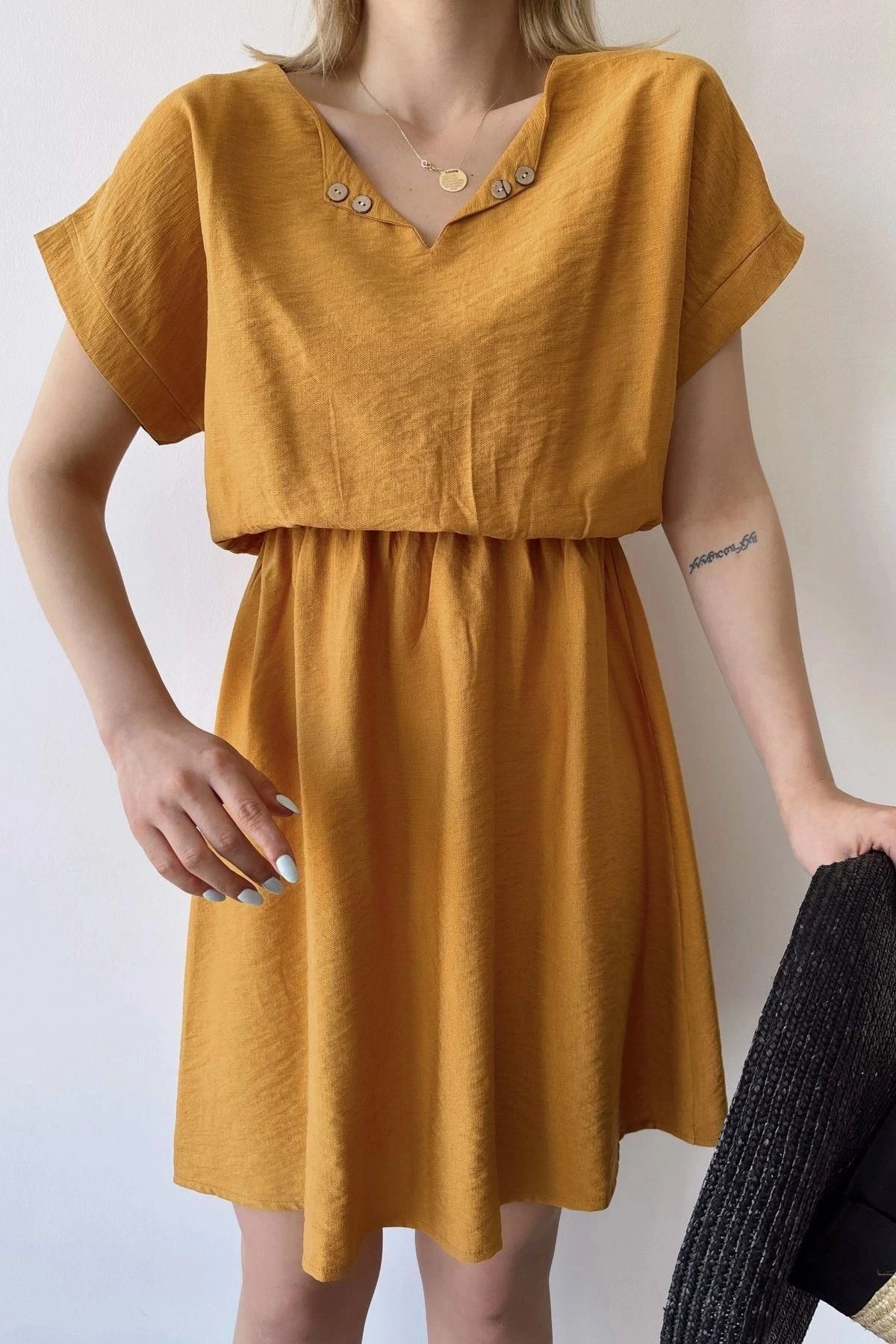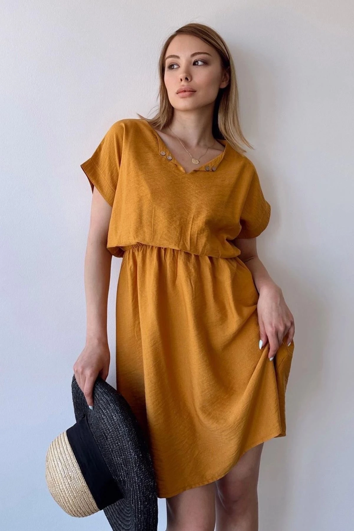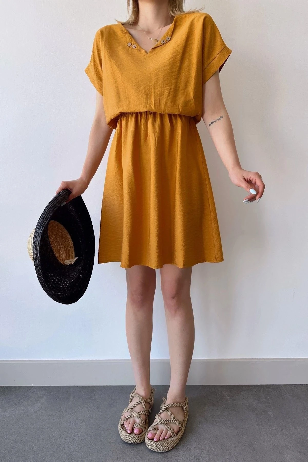 Kadın Hardal Kısa Kol, Kalp Yaka, Dokulu Desen, Bele Oturan, Aerobin Lastikli Bel Midi Elbise