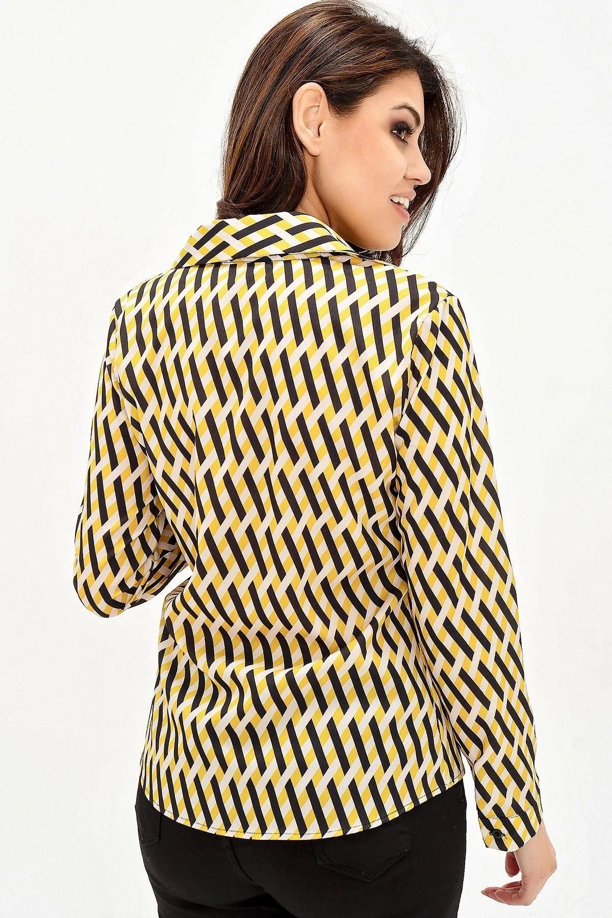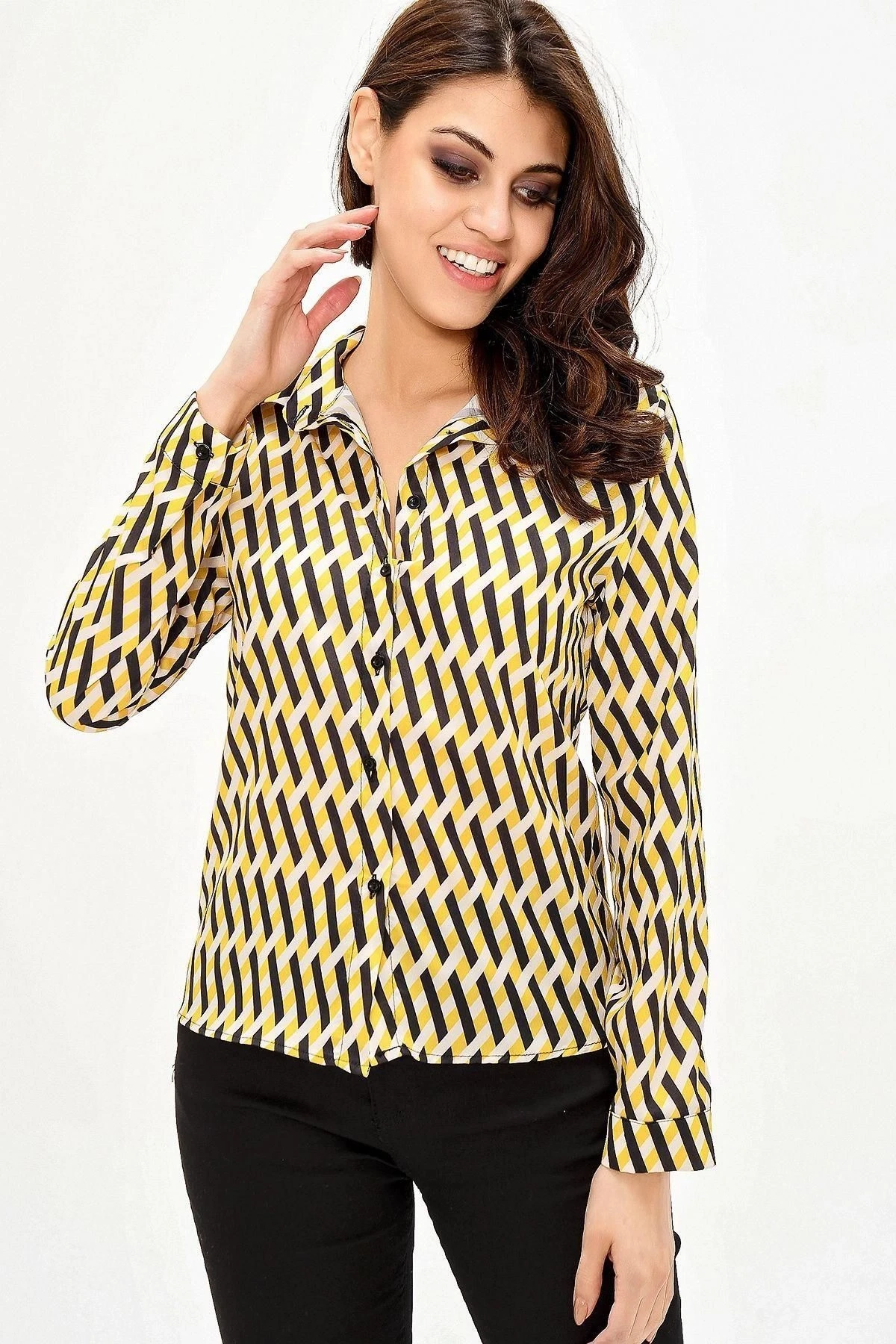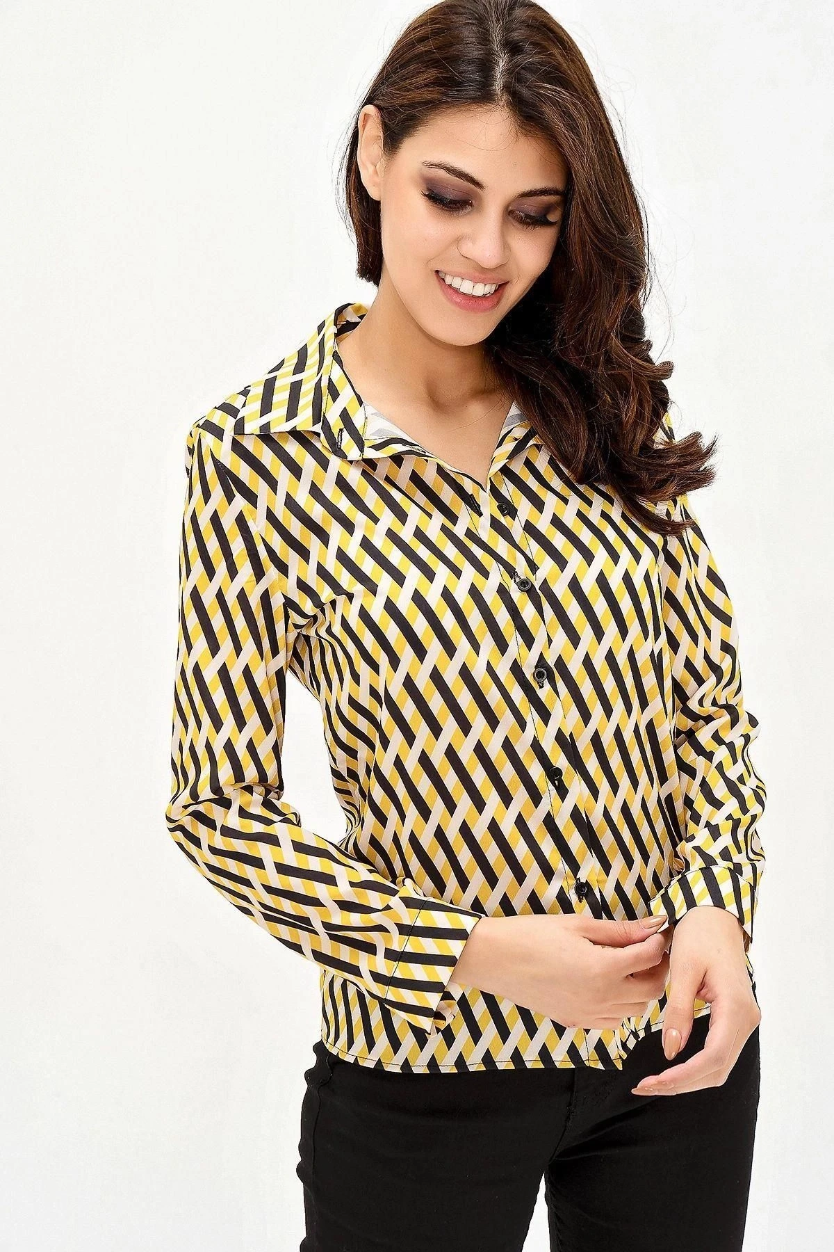 Kadın Hardal Klasik Yaka, Grafik Desenli, Krep Gömlek, Uzun Kol, Düz Kesim, Standart Boy