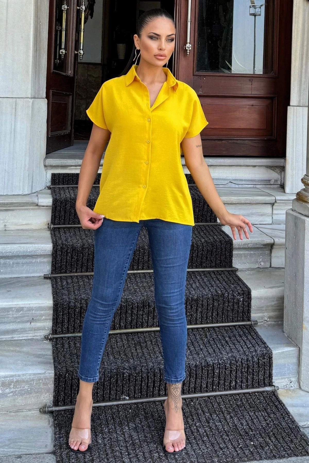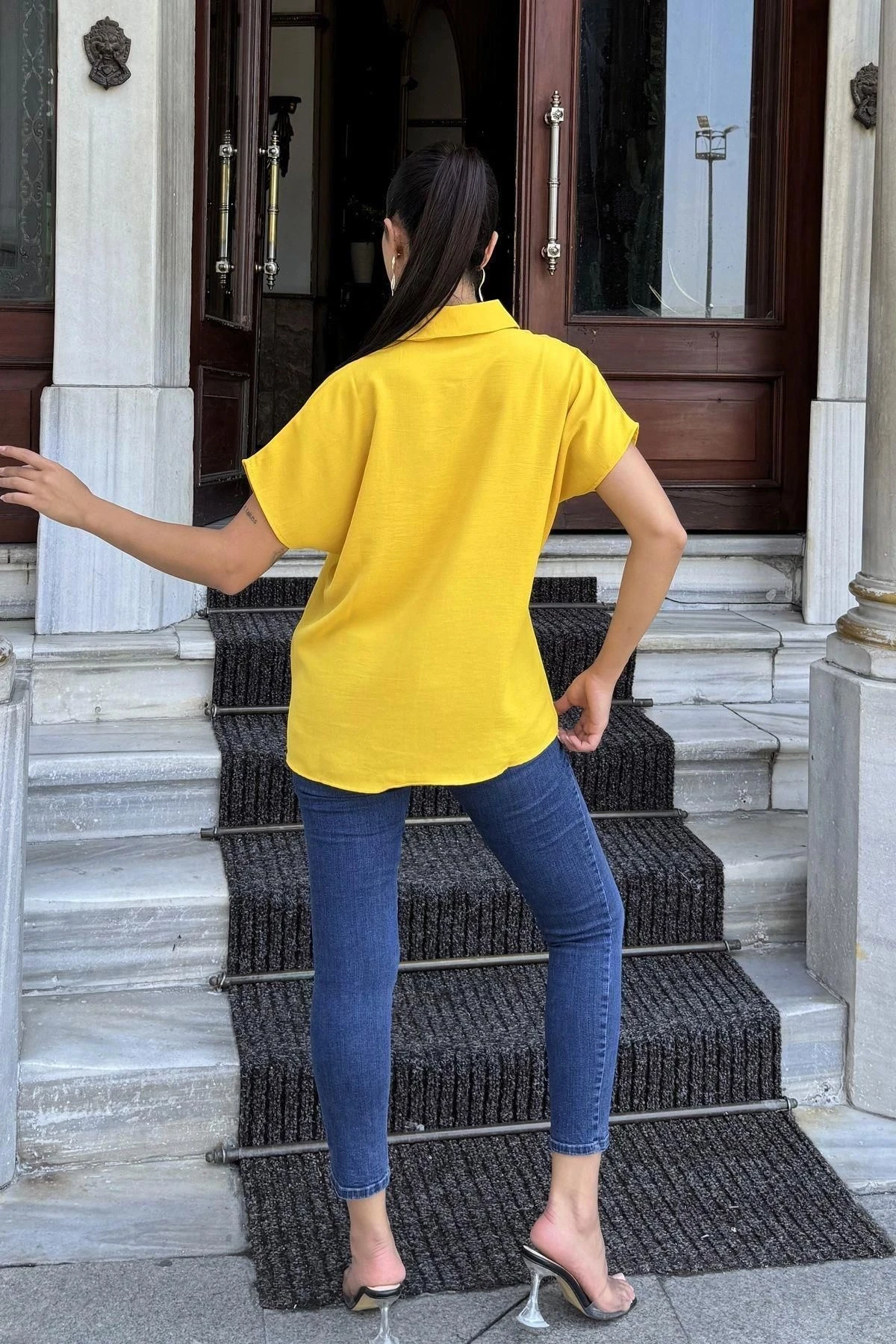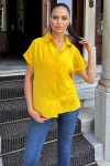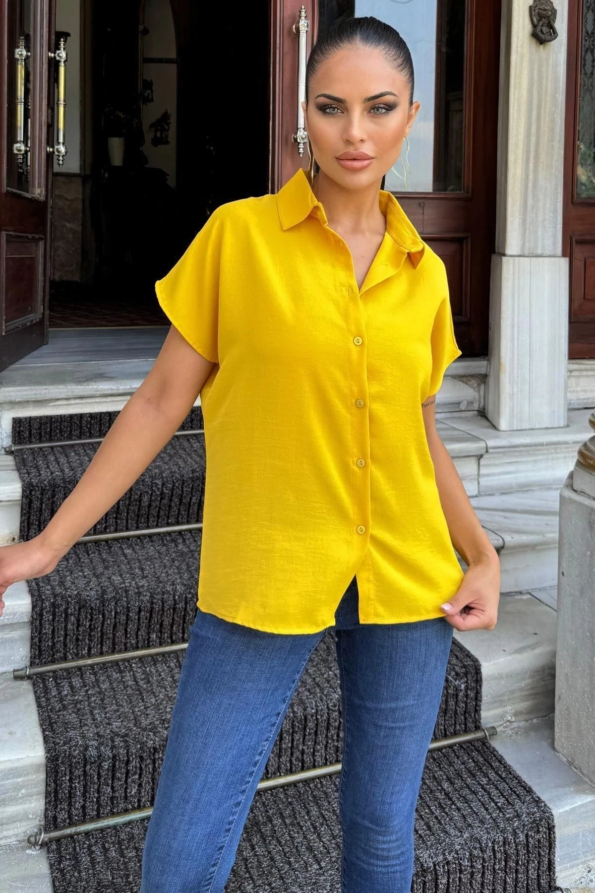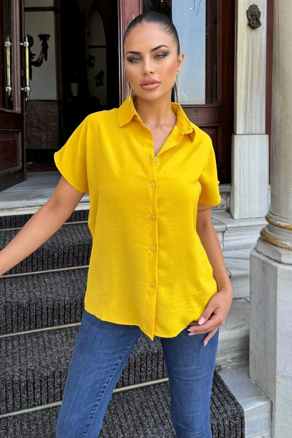 Kadın Hardal Klasik Yaka, Kısa Kol, Dokulu Kumaş, Salaş & Rahat Kalıp/Kesim, Gömlek