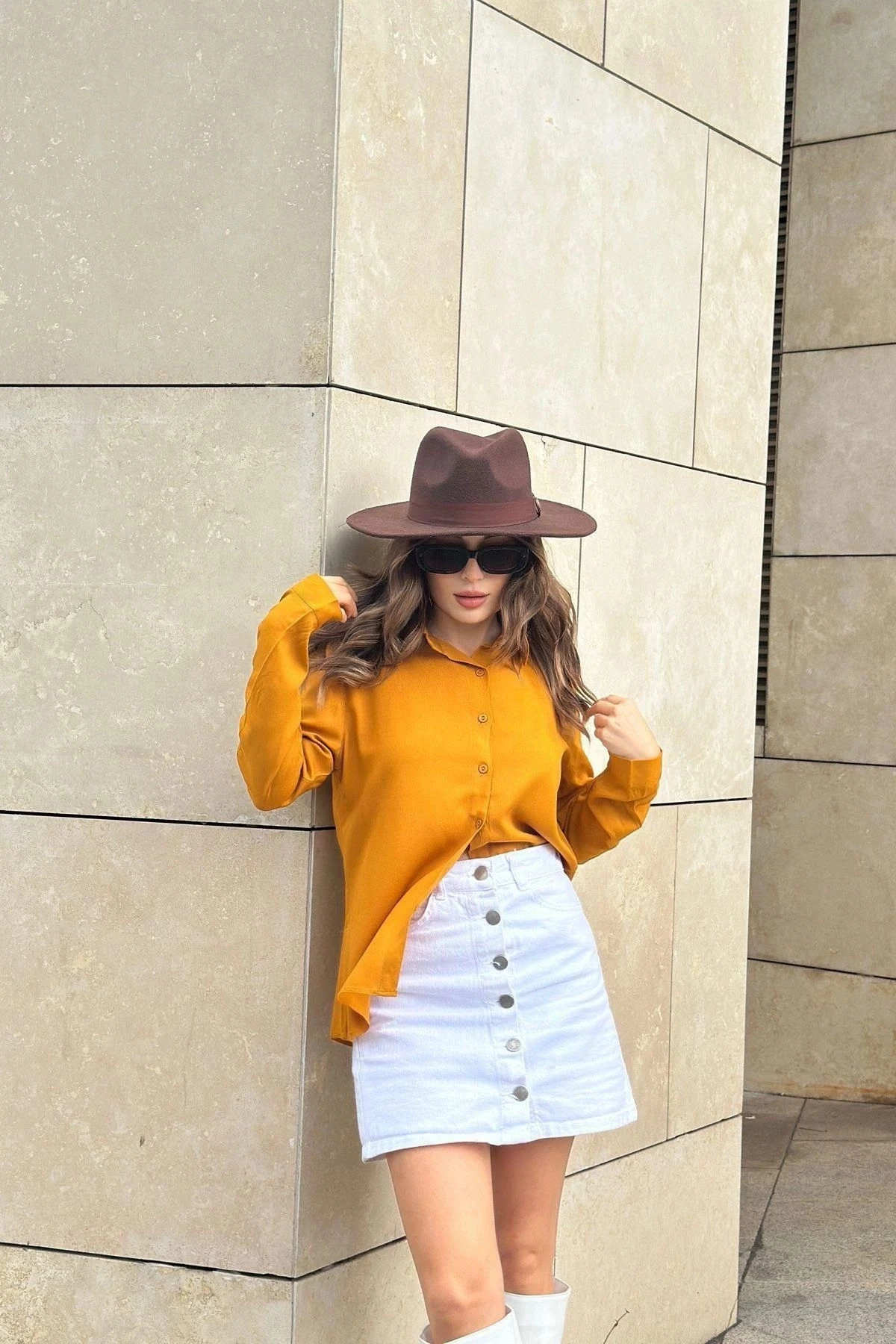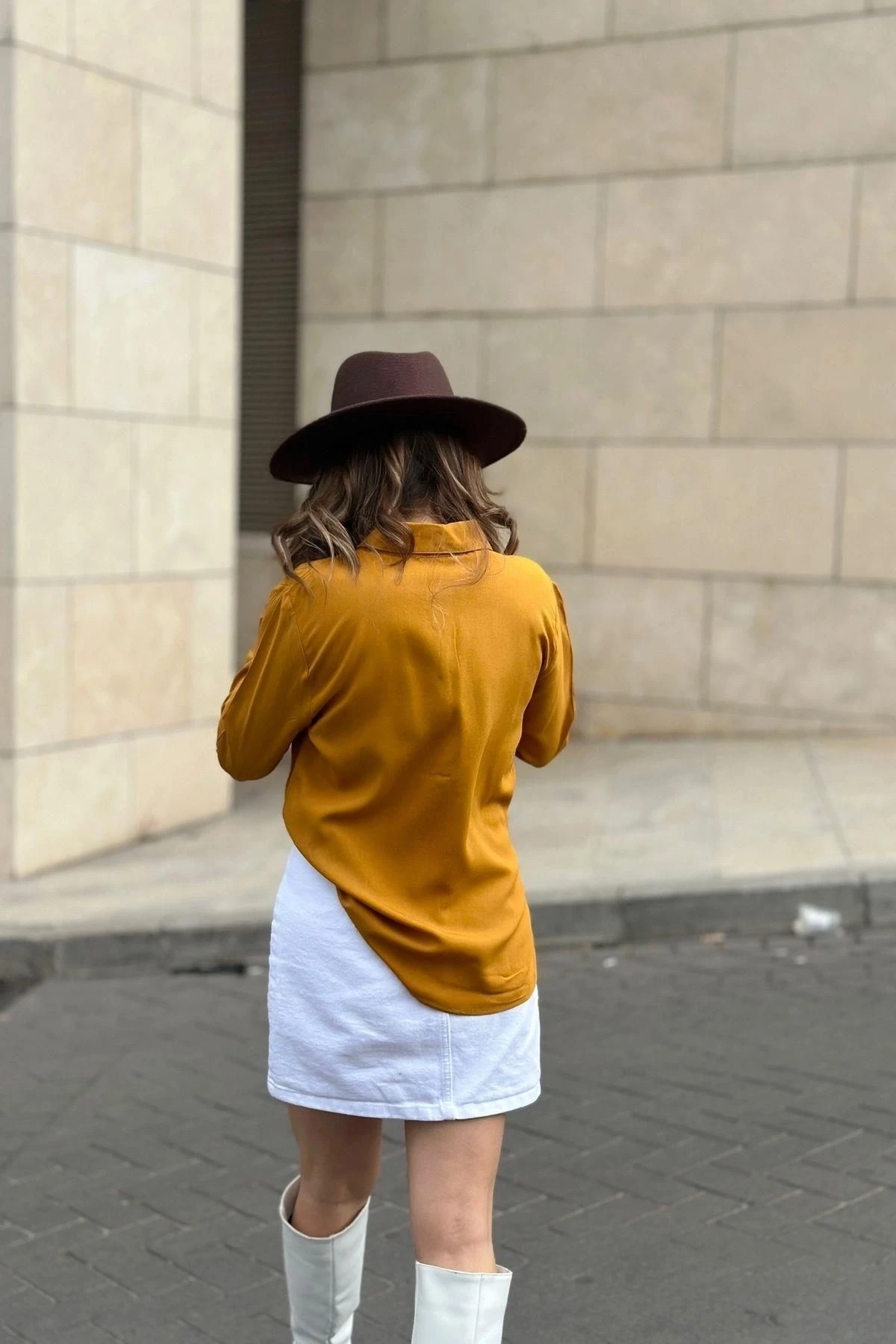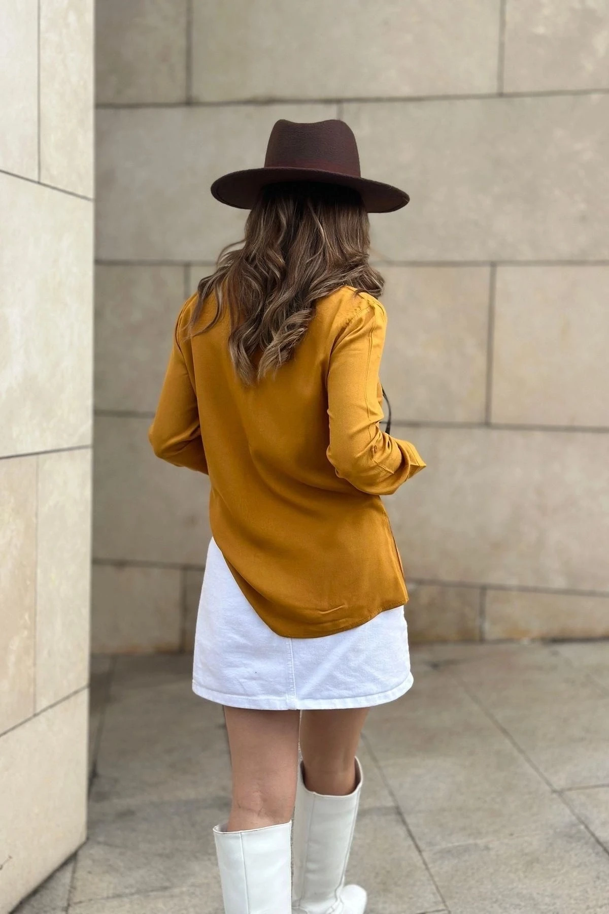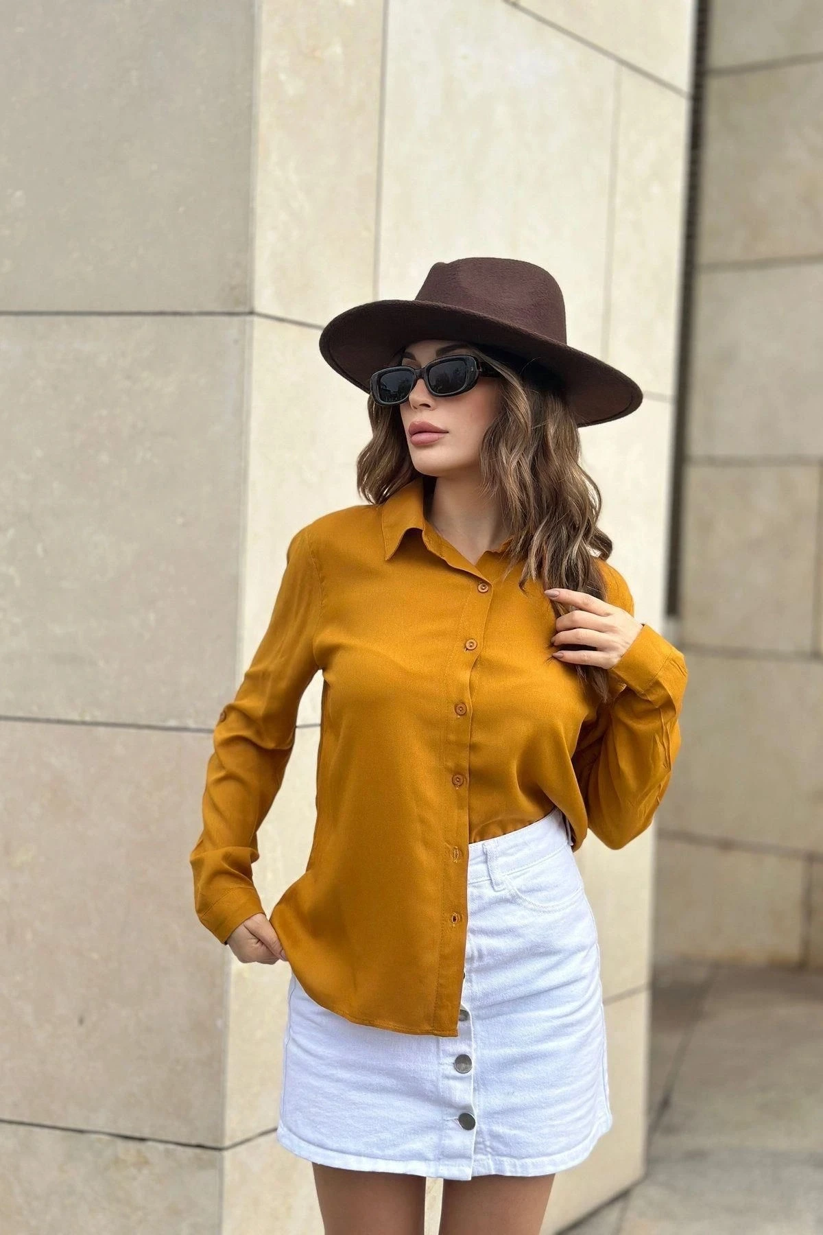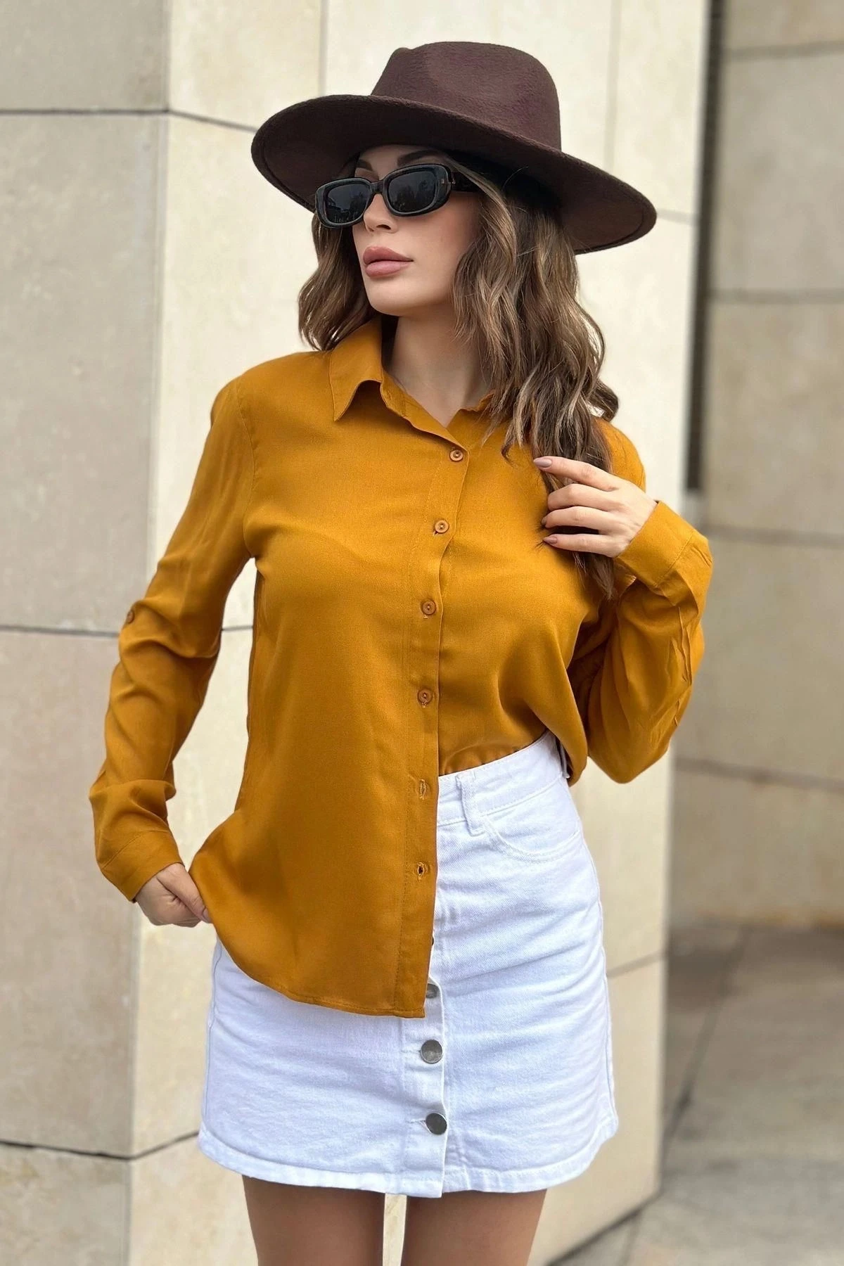Kadın Hardal Klasik Yaka Uzun Kol Regular Kesim Standart Boy Gömlek (Özel Kumaş)
