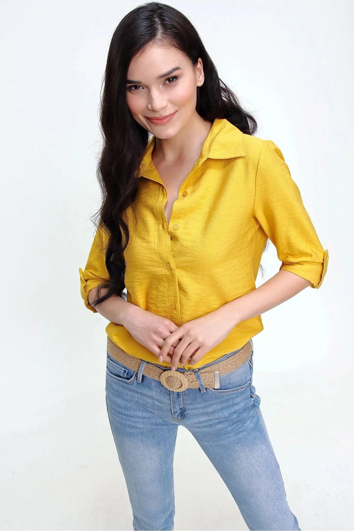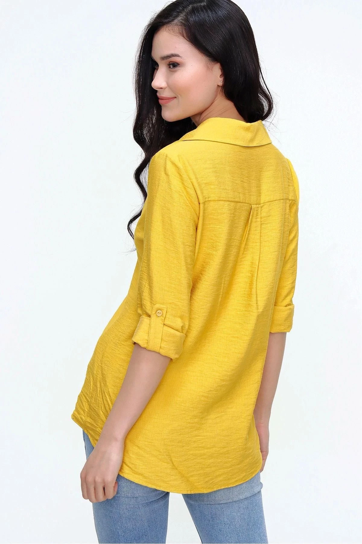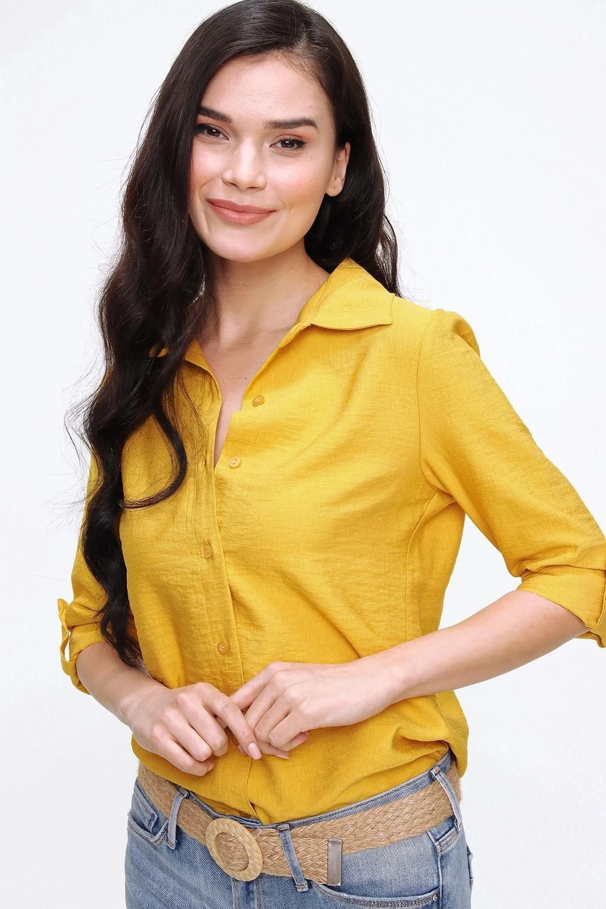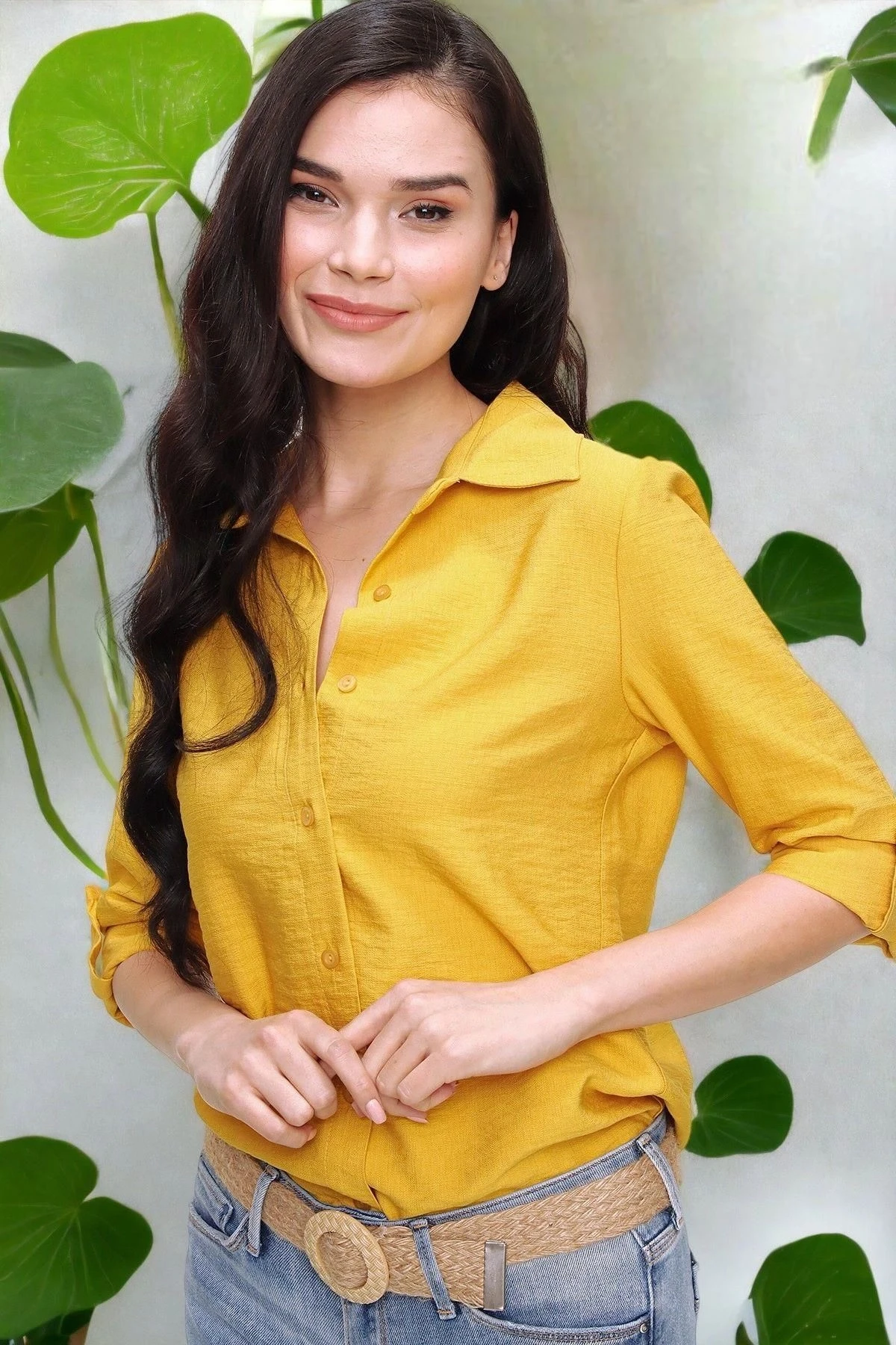 Kadın Hardal Klasik Yaka Uzun Kol Regular Kesim Standart Boy Gömlek(Özel Kumaş)