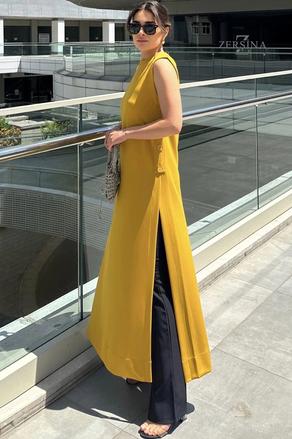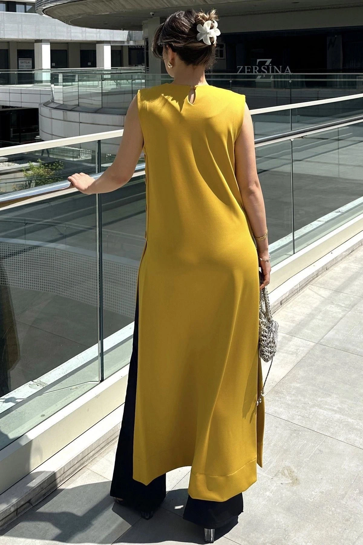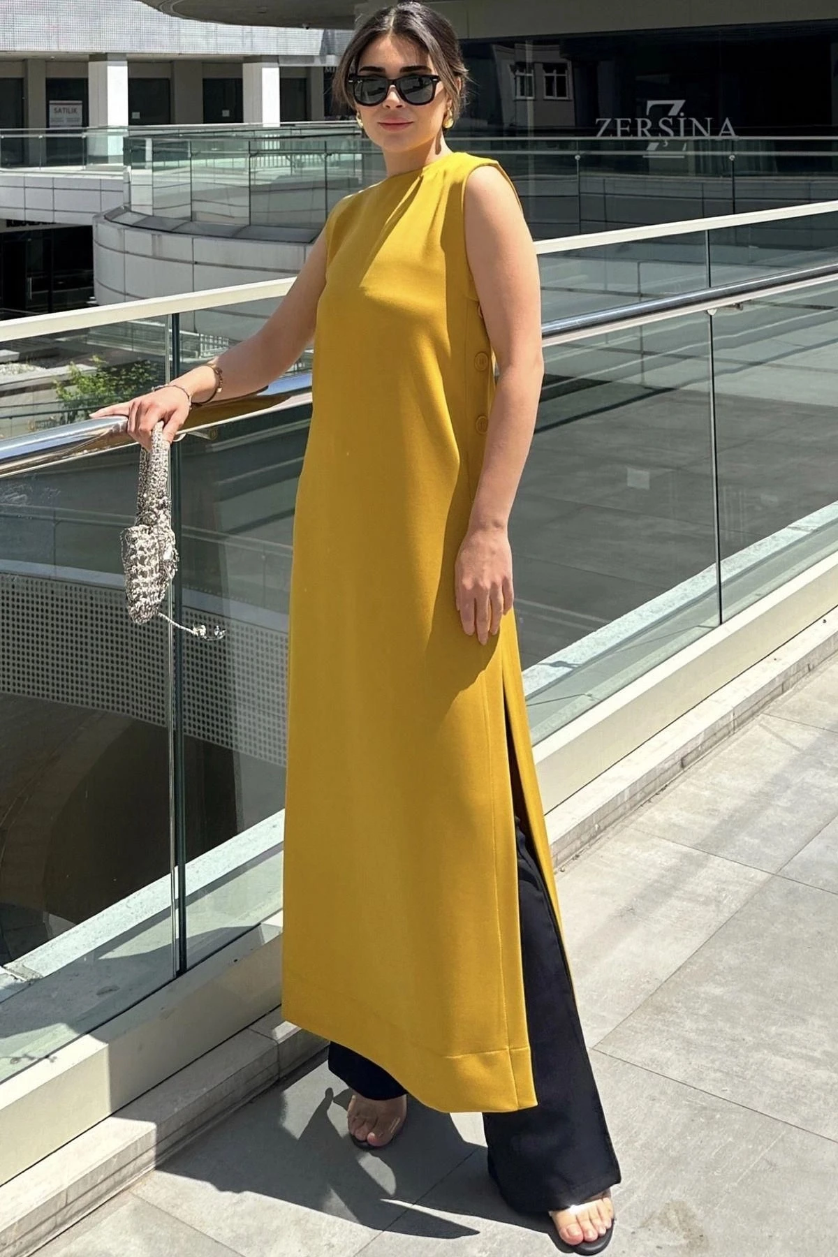 Kadın Hardal Kolsuz, Yuvarlak Yaka, Derin Yırtmaçlı, A Kesim Likralı Tunik Elbise