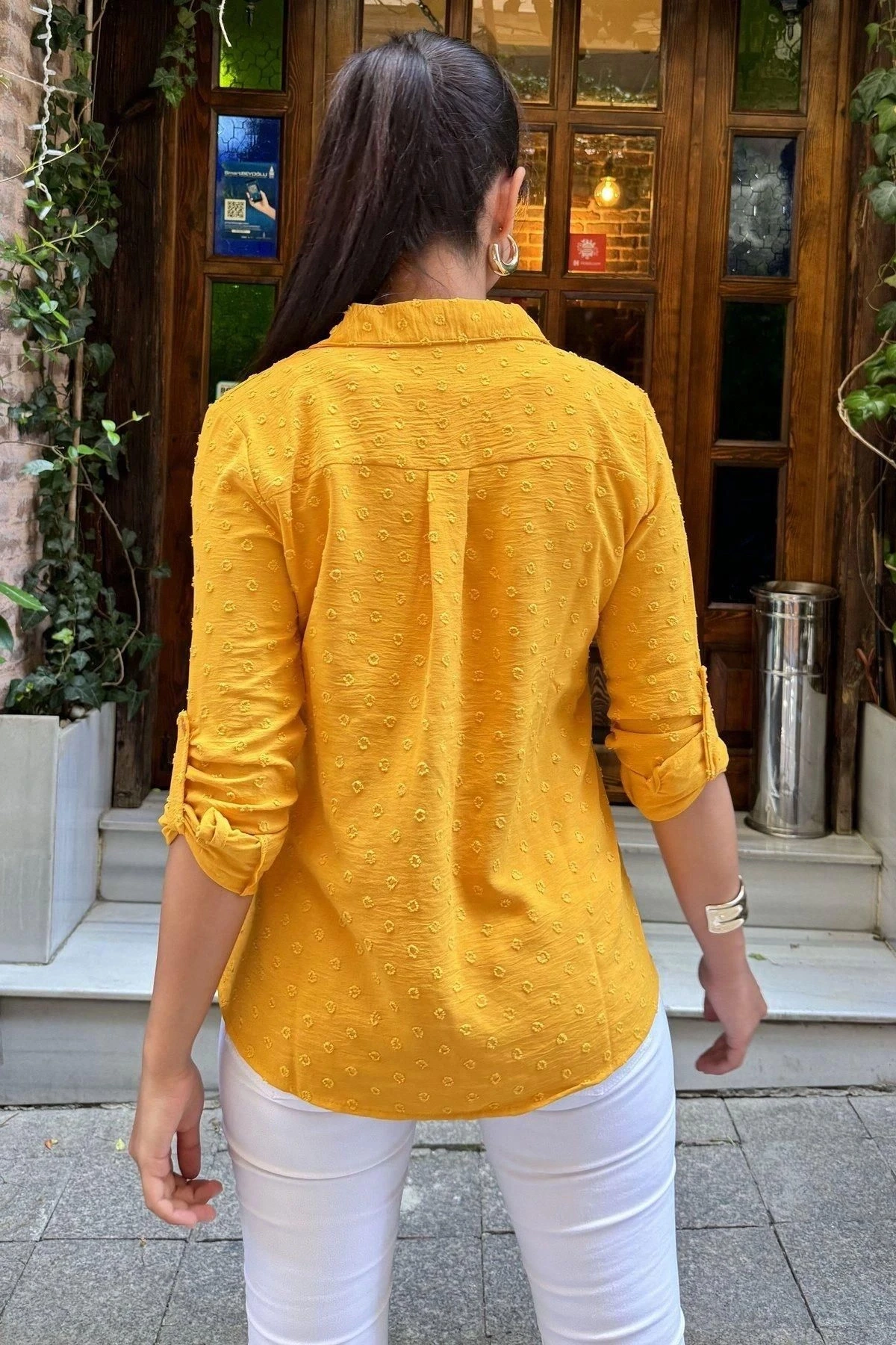 Kadın Hardal Terletmez Ponponlu Özel Kumaş, Fit Kesim, Uzun Kollu Gömlek