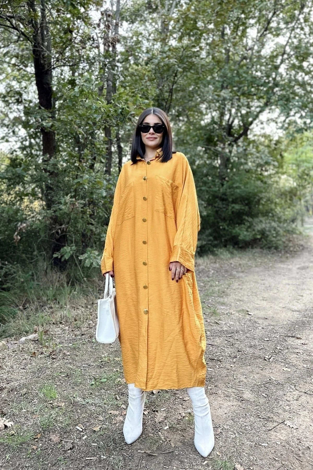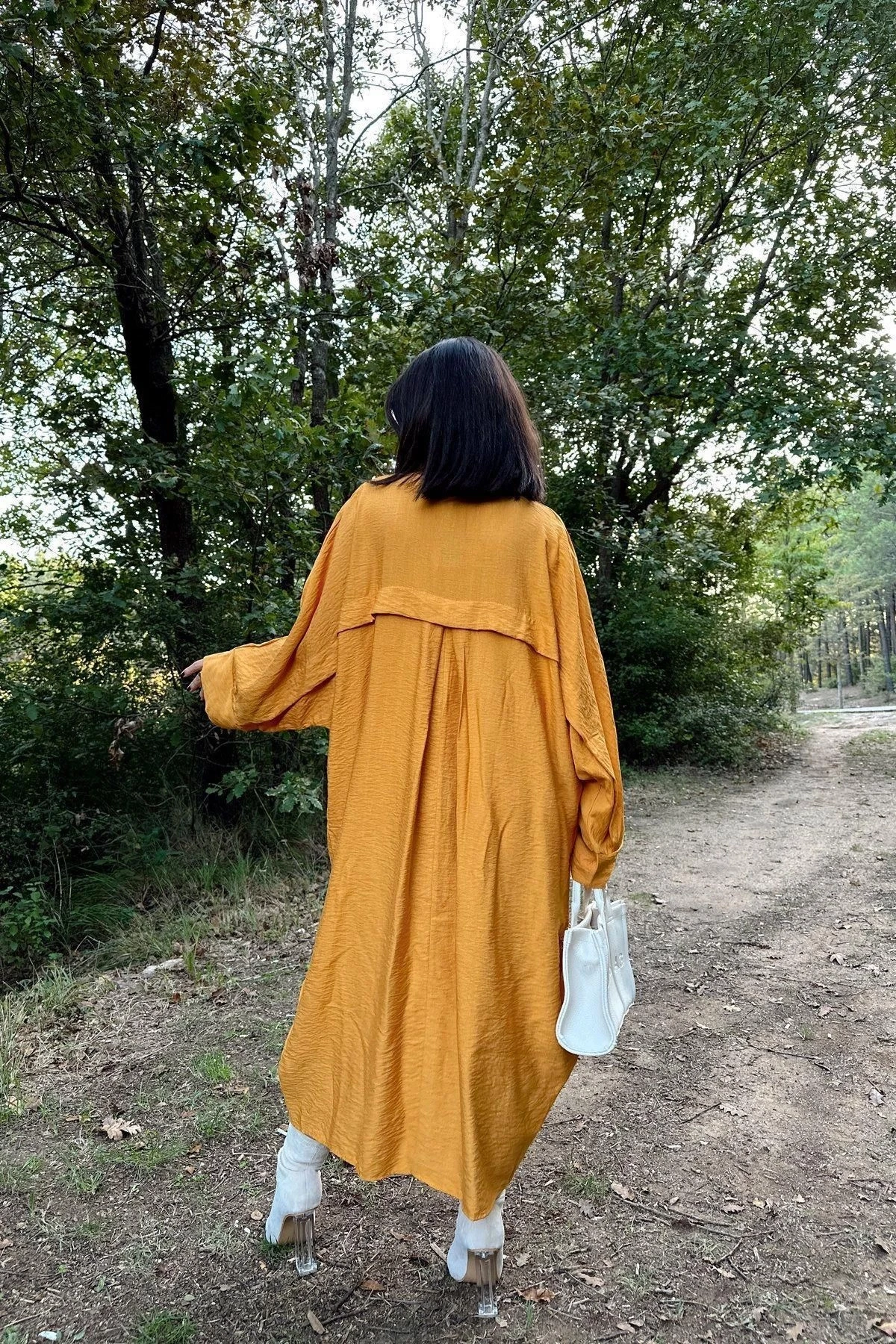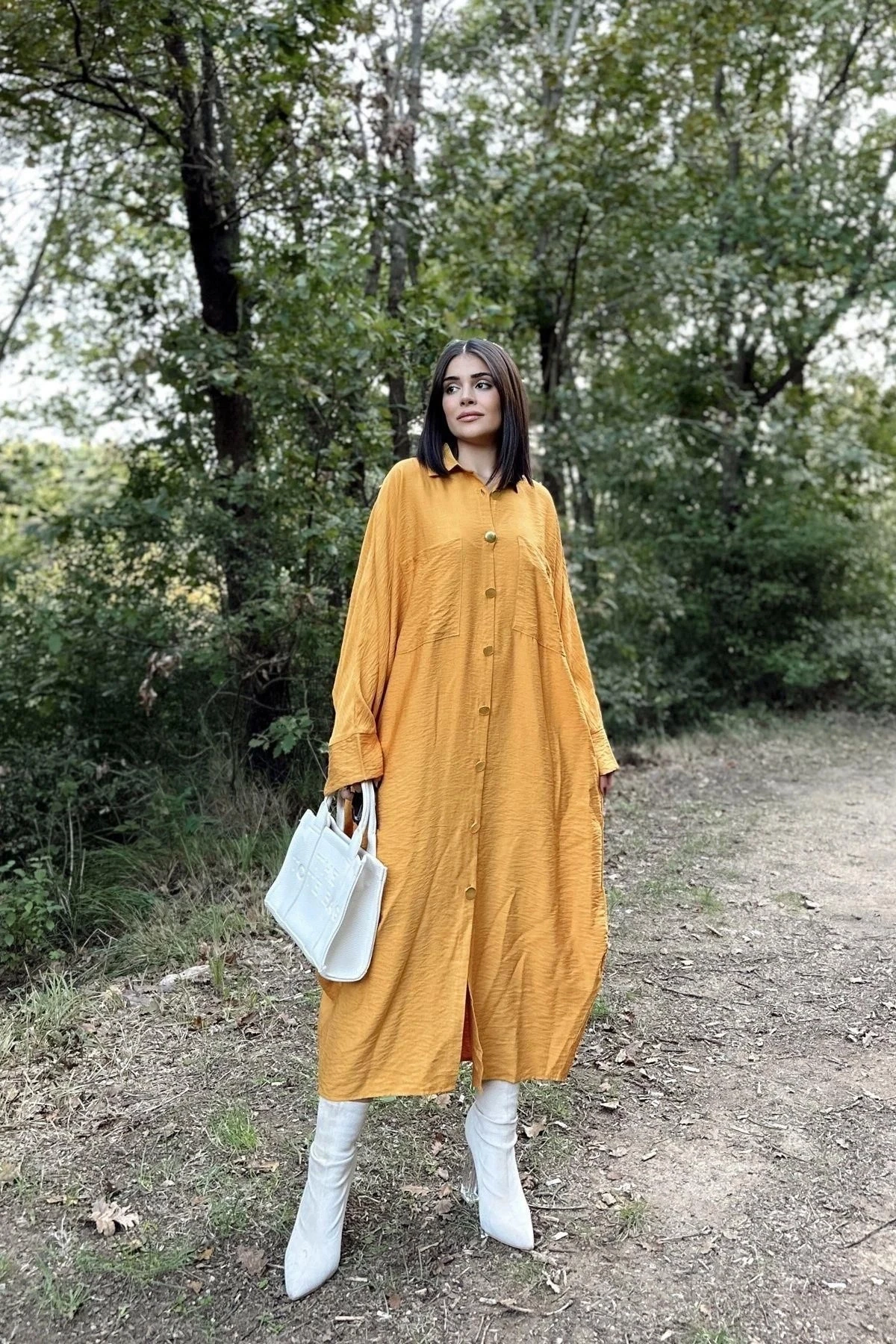 Kadın Hardal Yarasa Kol, Arkası Pliseli, Çift Cepli, Uzun Oversize Salaş Gömlek Elbise