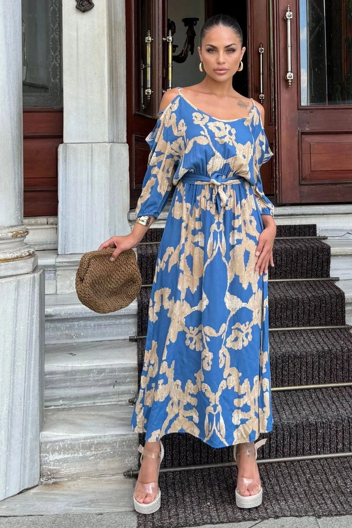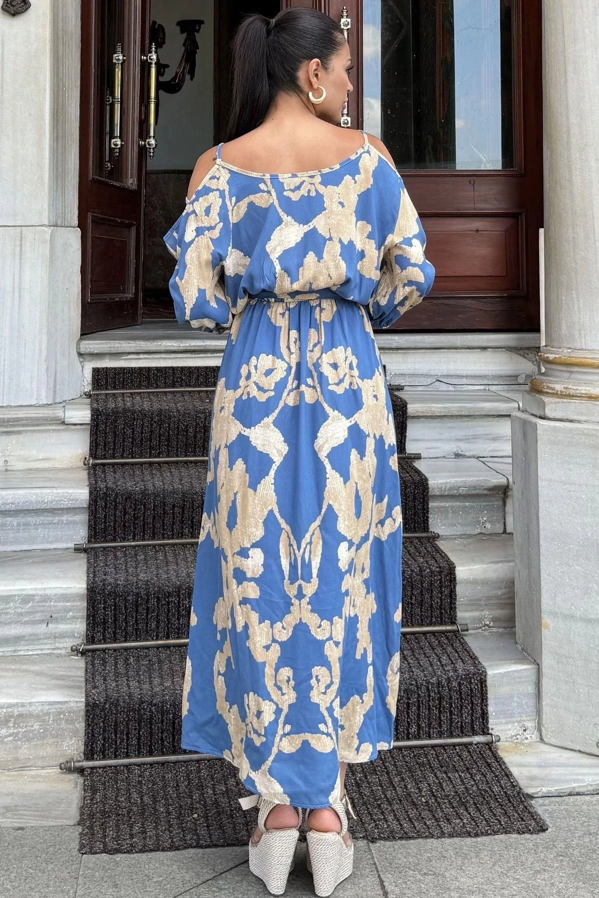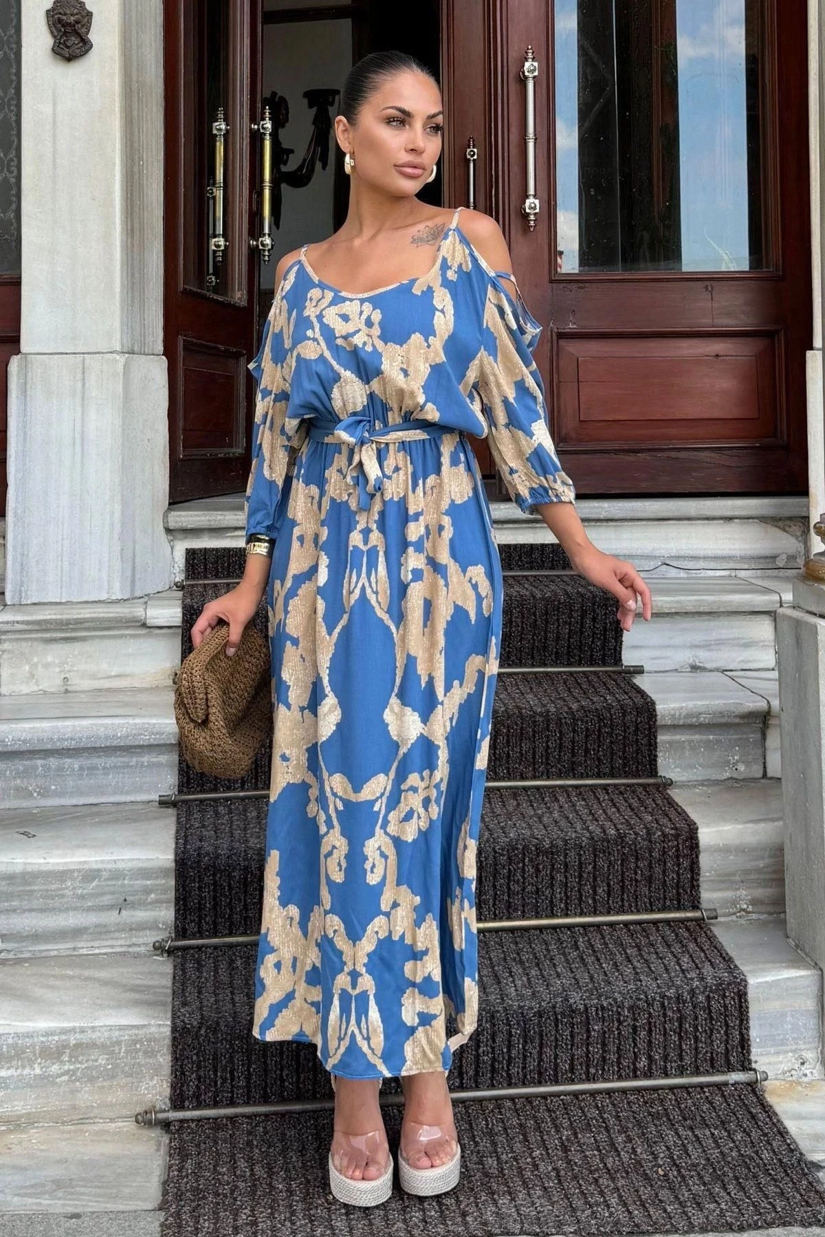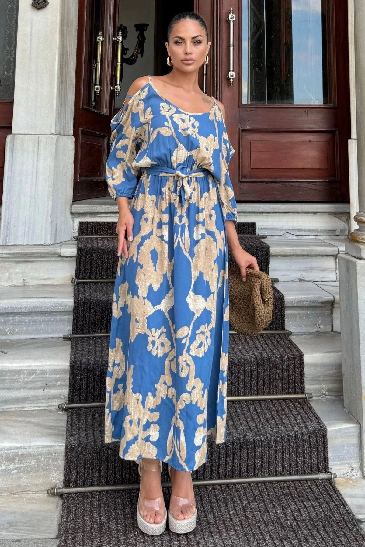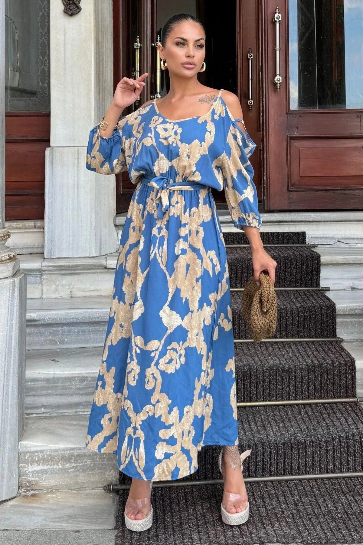 Kadın İndigo & Bej Kemerli, Omuz Detaylı, Salaş, Dökümlü Uzun Elbise
