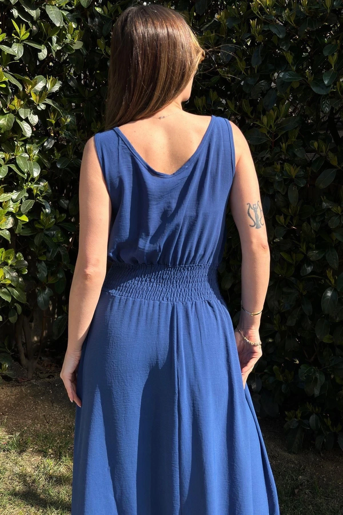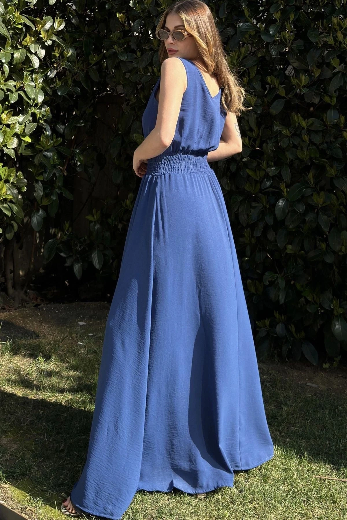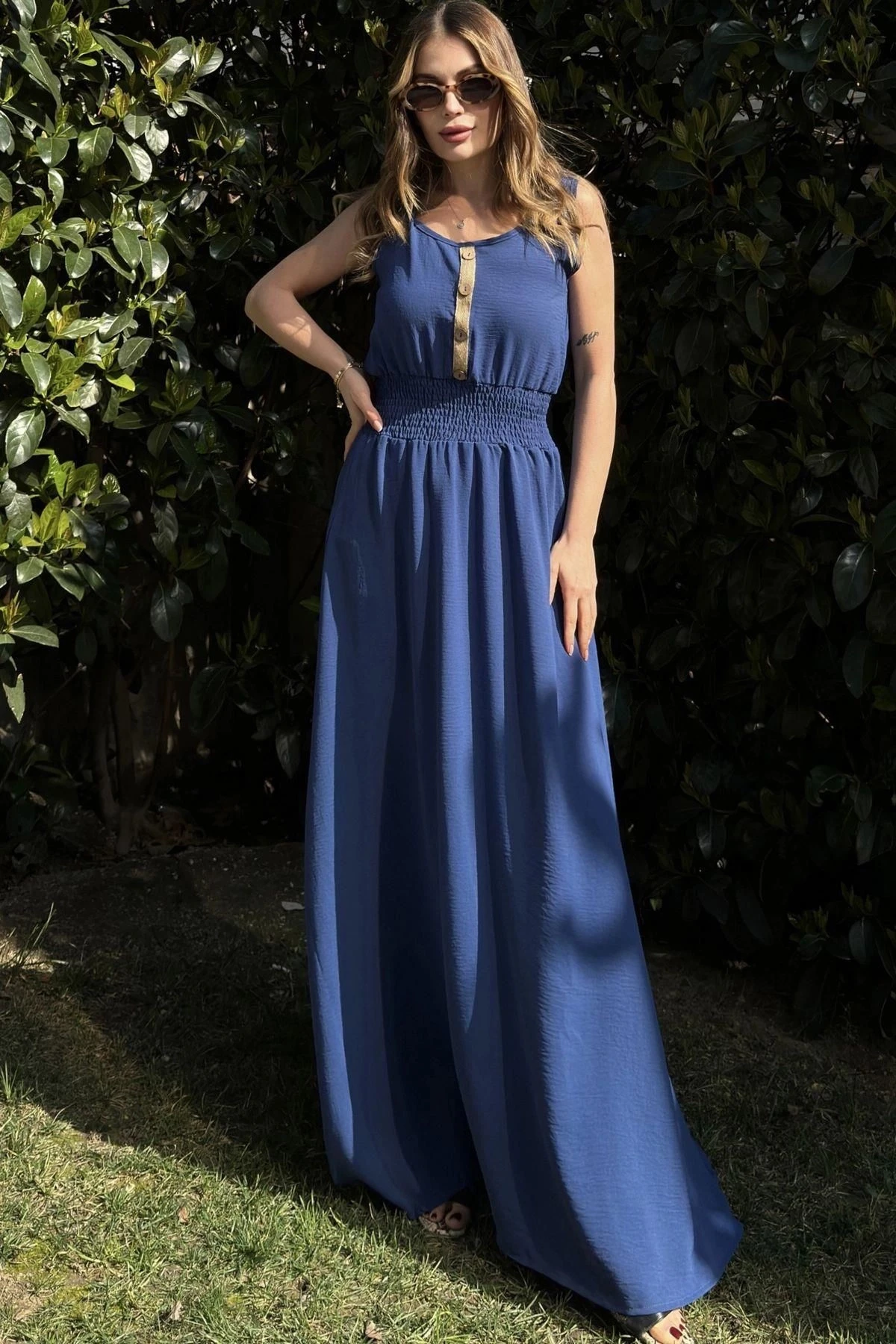 Kadın İndigo Beli Gipeli, Askılı, Salaş Kesim, Airobin Uzun Elbise