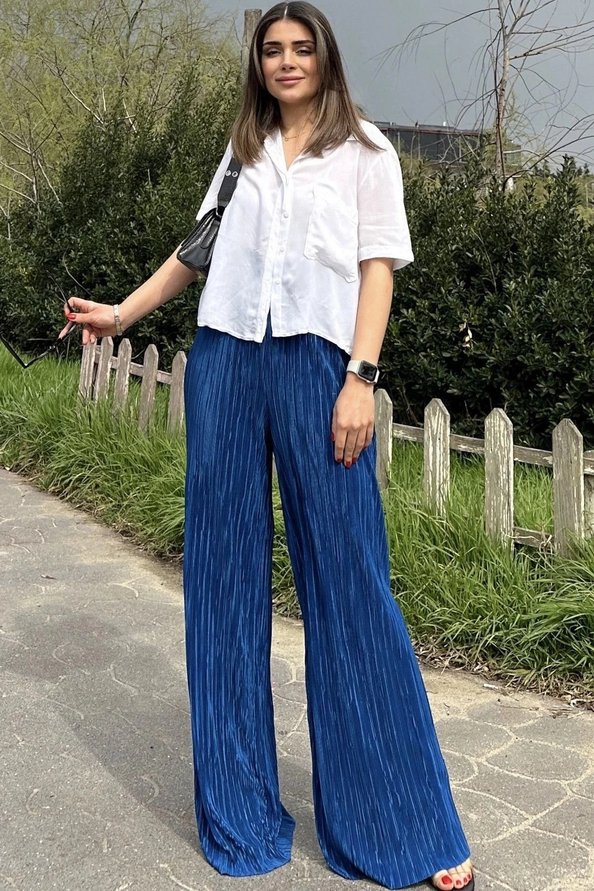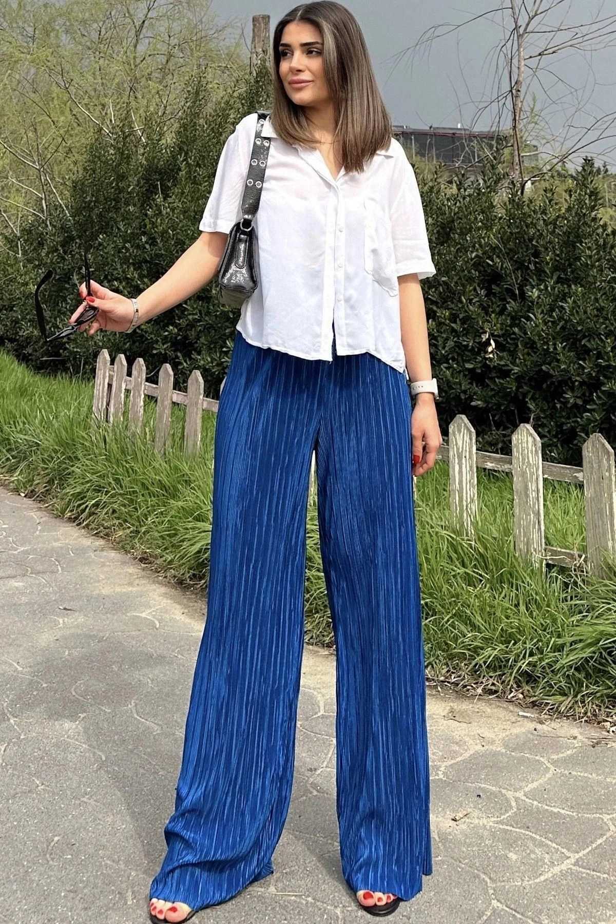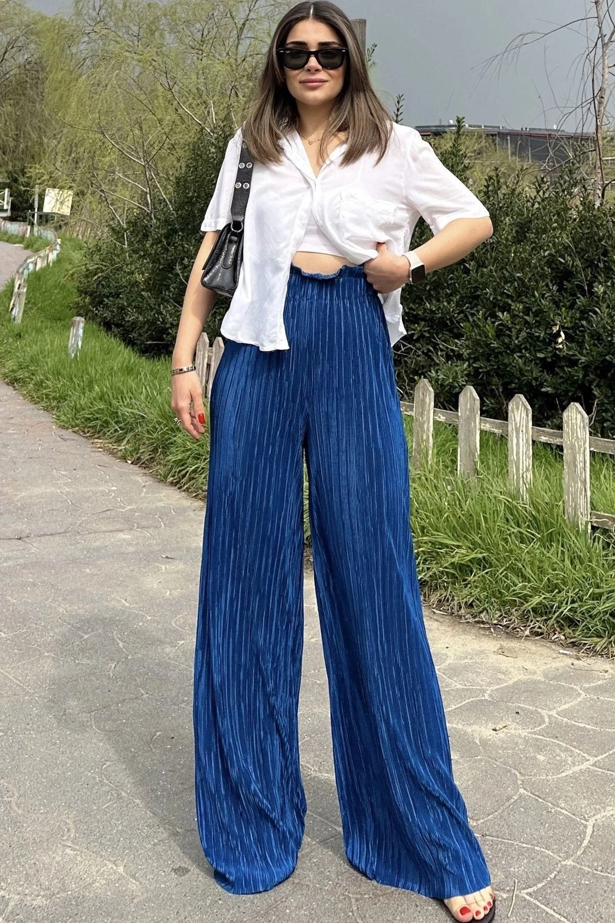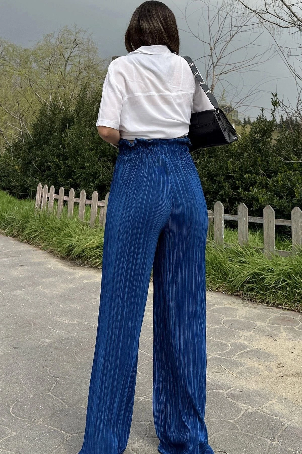 Kadın İndigo Beli Lastikli, Yüksel Bel, Salaş Kesim, Bol Paça Bürümcük Pantolon