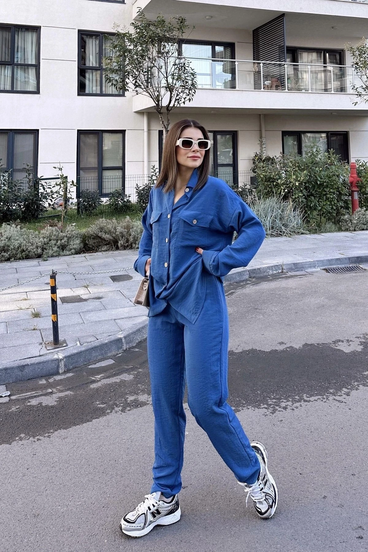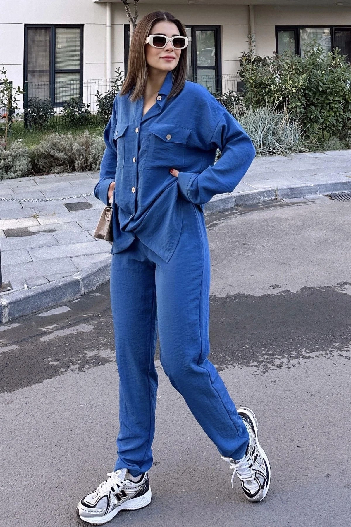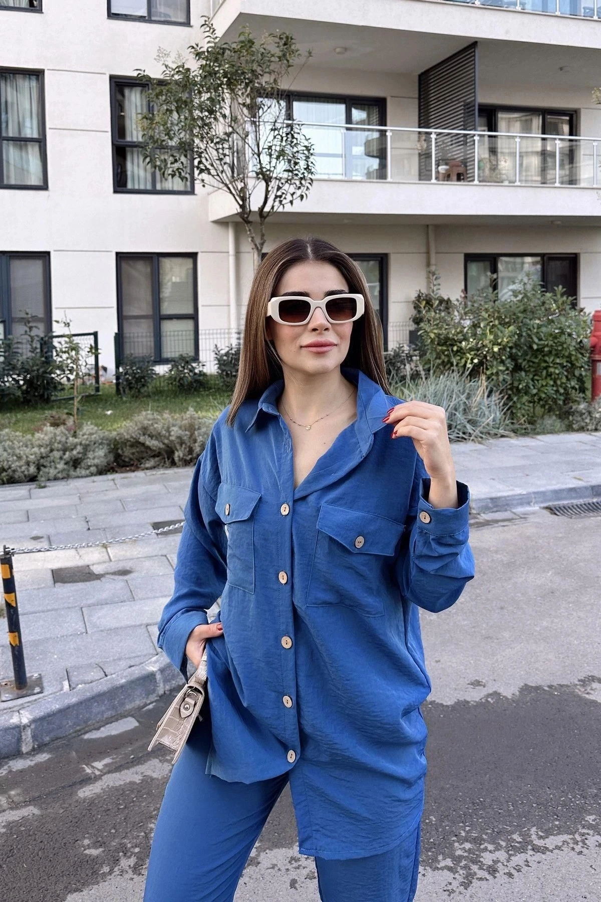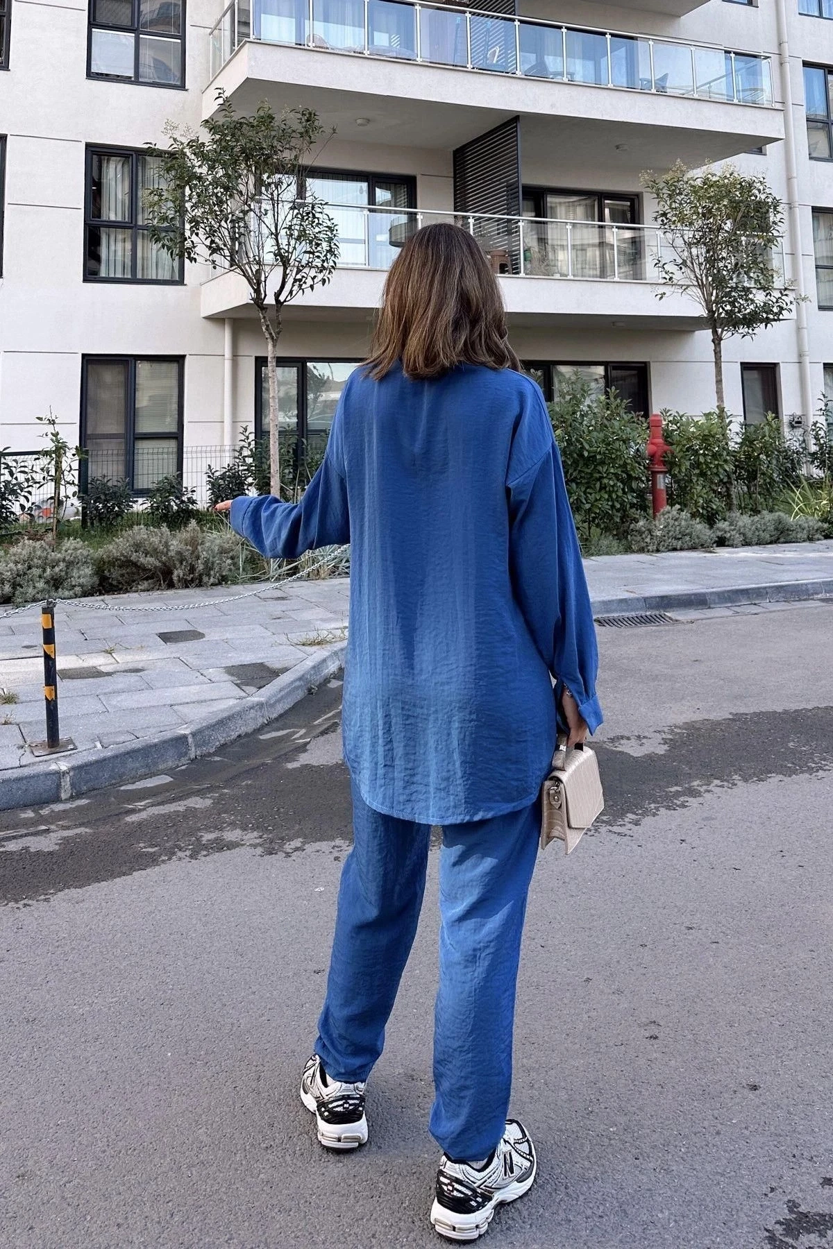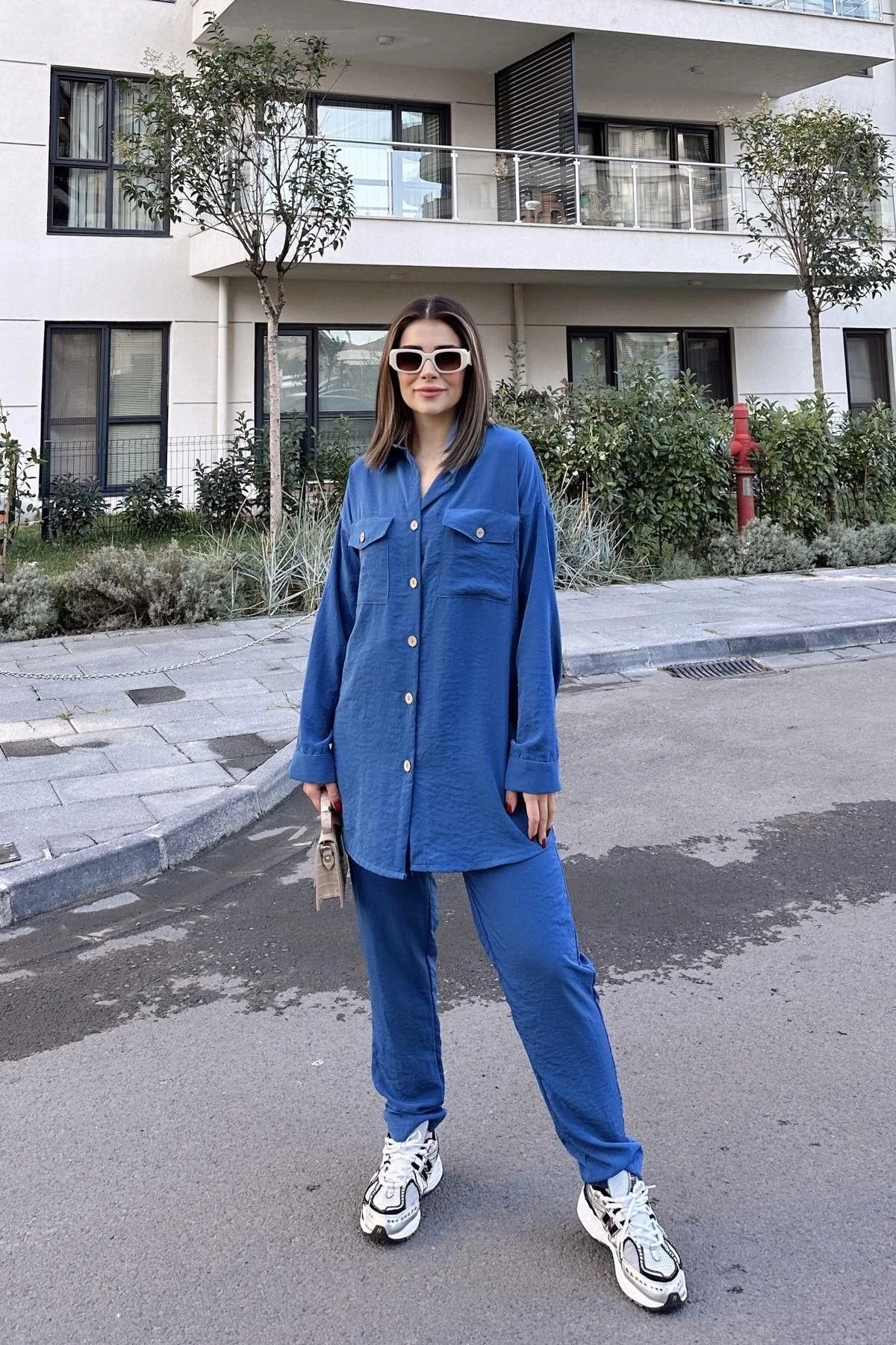 Kadın İndigo Çift Cepli Uzun Gömlek & Beli Lastikli Pantolon - Rahat Alt & Üst Takım