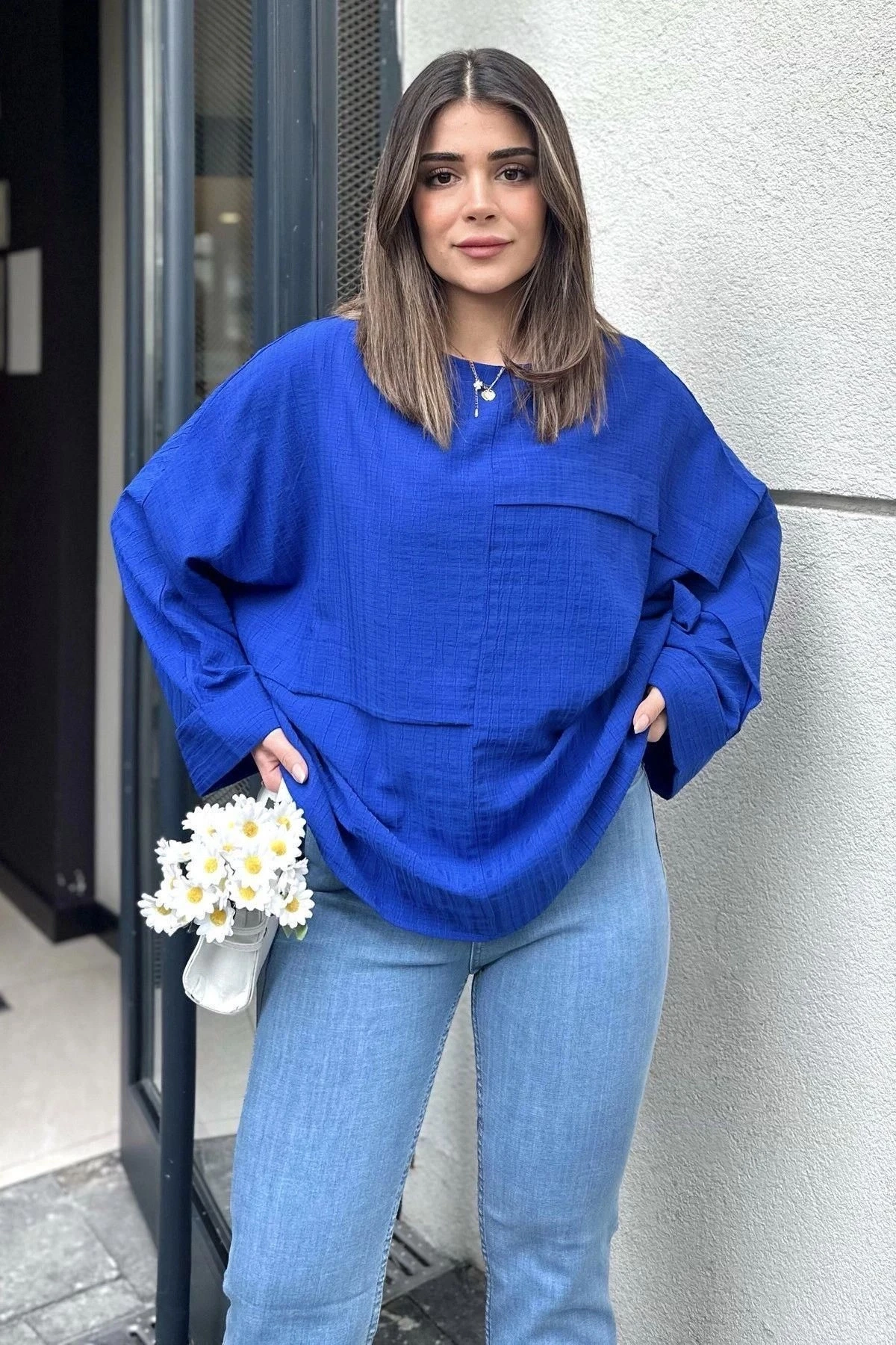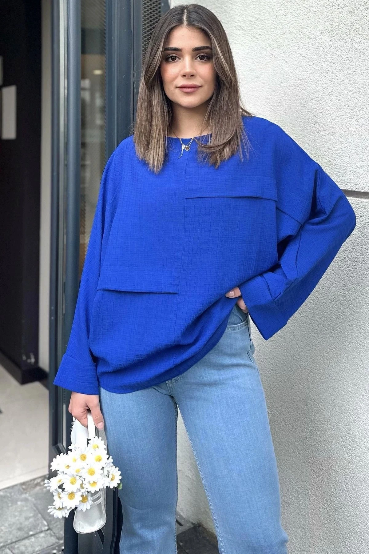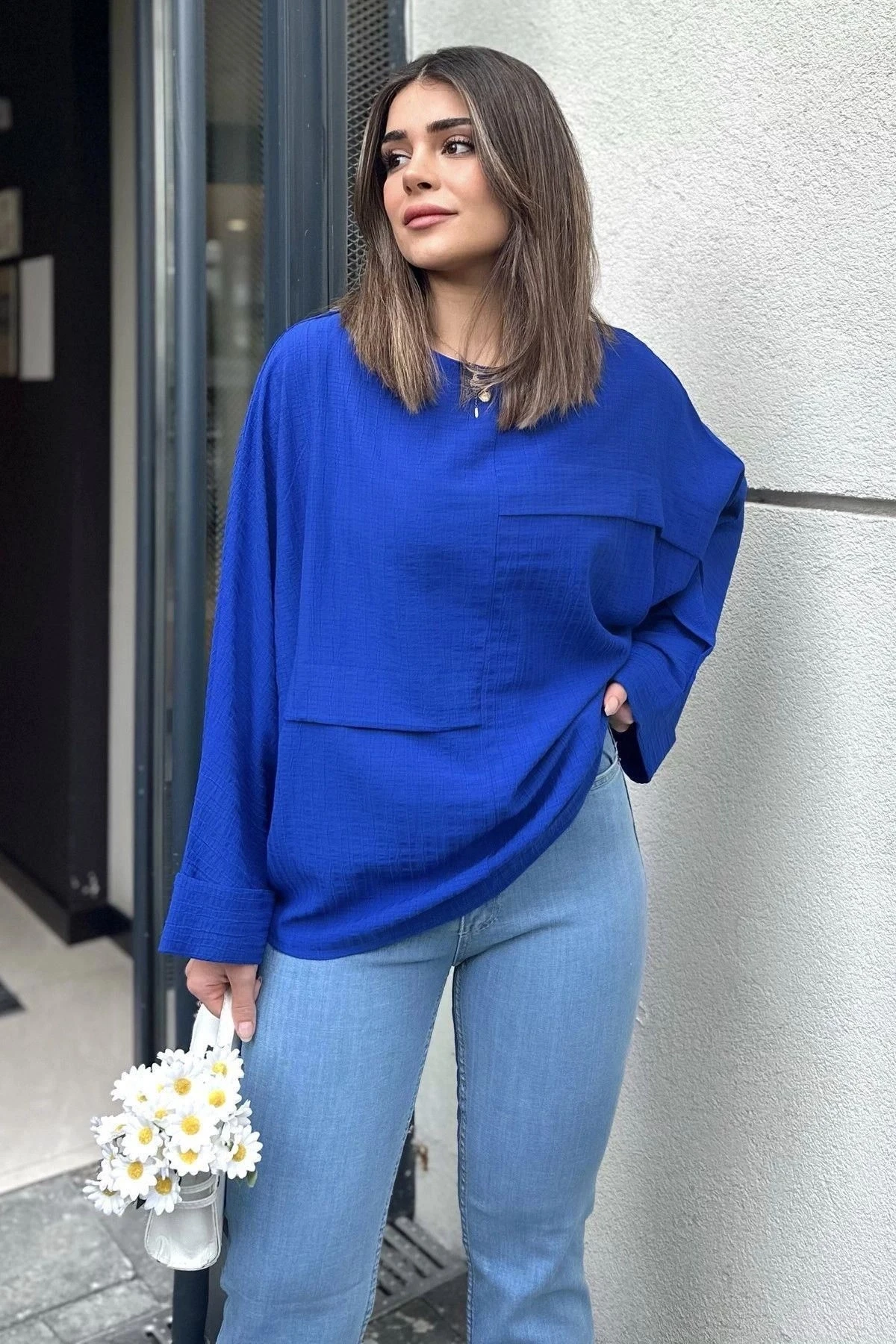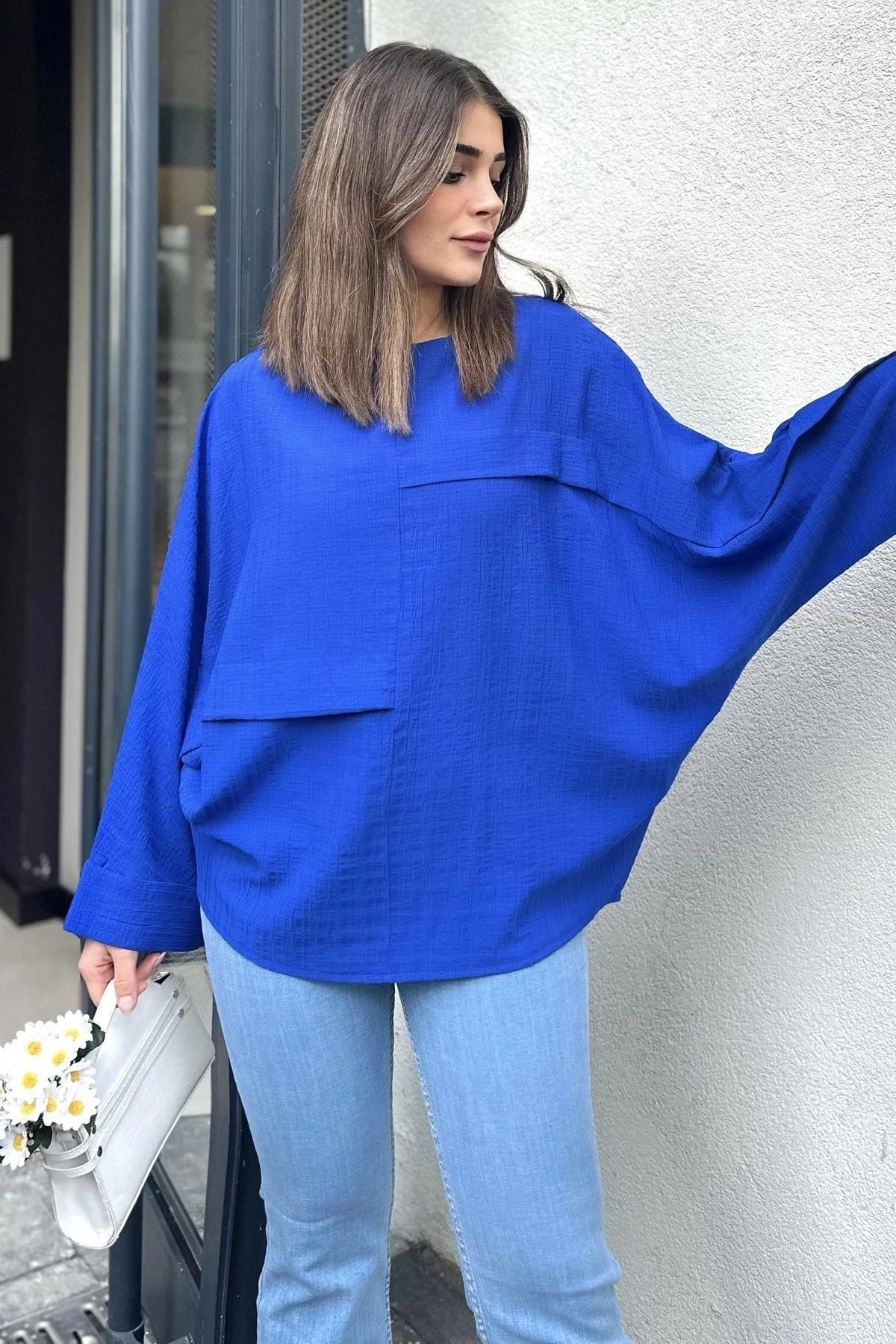 Kadın indigo Duble Geniş Manşet, Yarasa Kol, Süs Cep Detaylı, Salaş Bluz