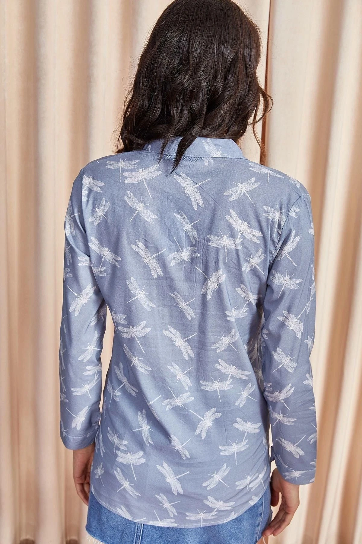 Kadın İndigo İki Renkli Desenli Uzun Kol Regular Kesim Standart Boy Gömlek