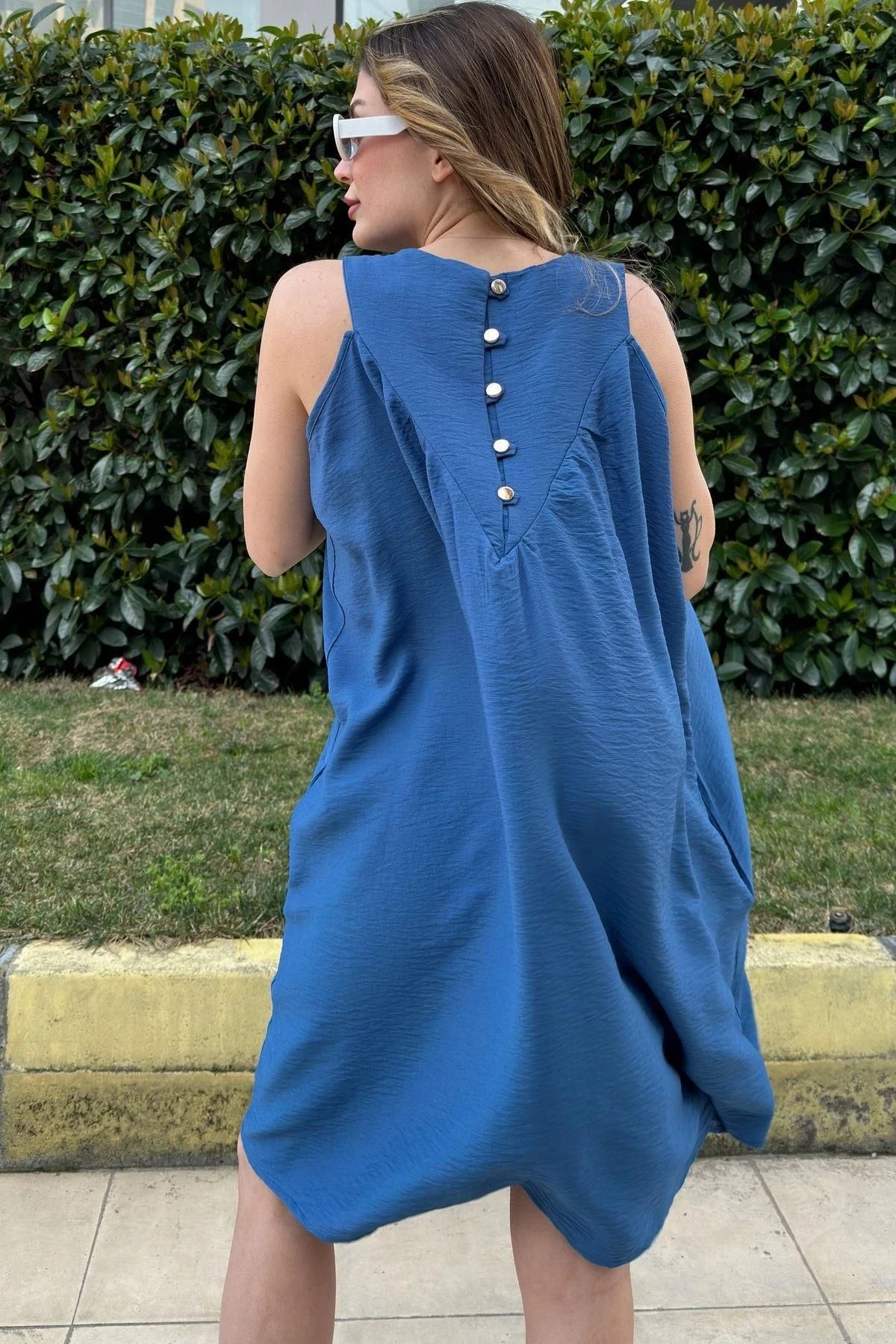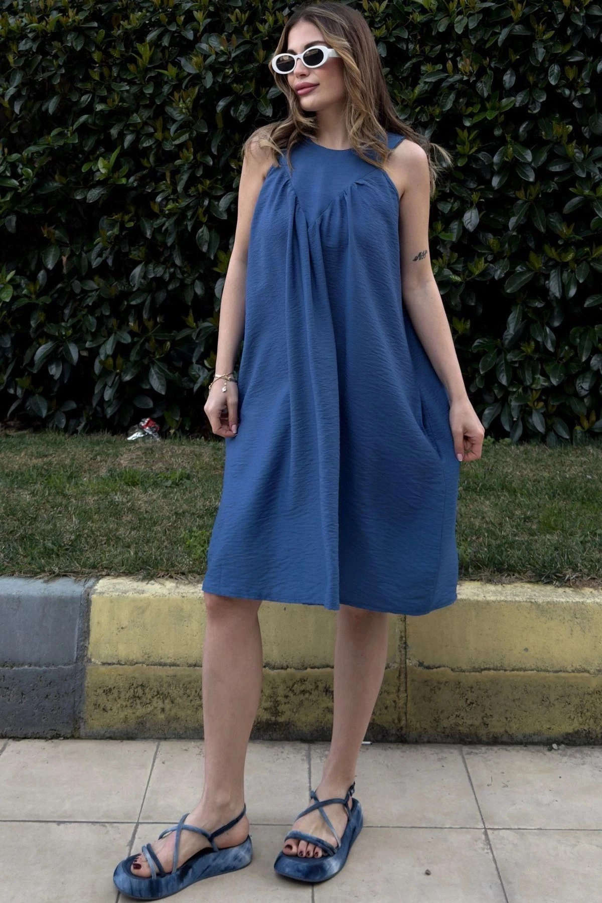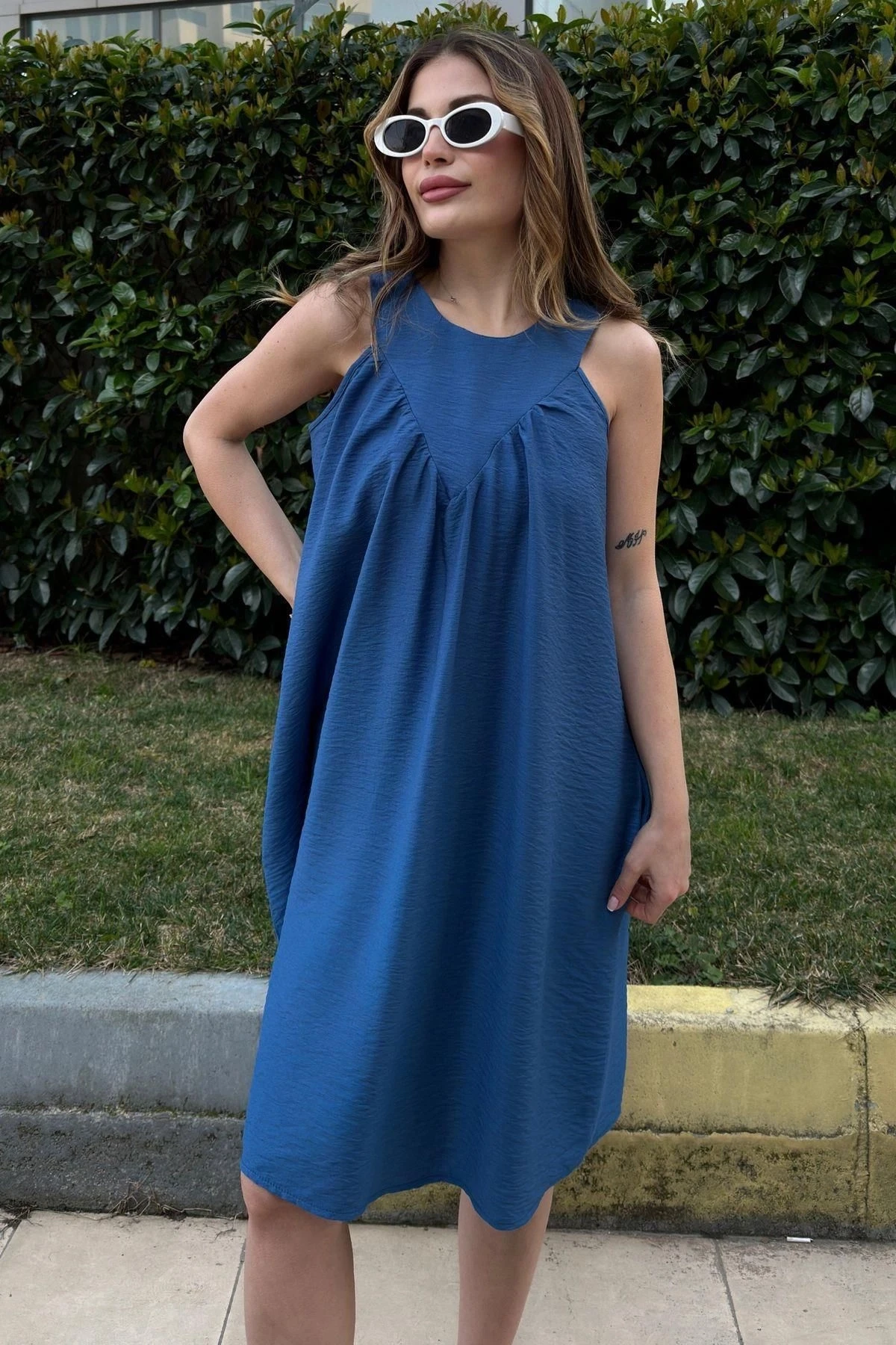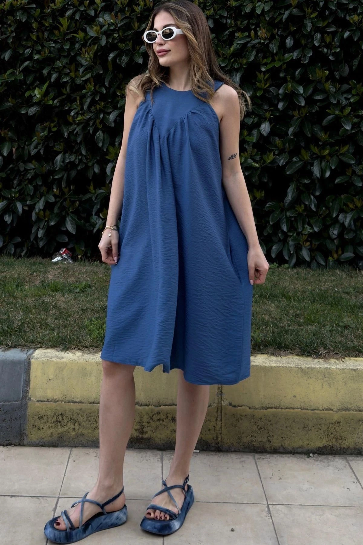 Kadın İndigo Kalın Askılı, Cep Ve Plise Yaka Detaylı, A Kesim, Salaş Midi Elbise