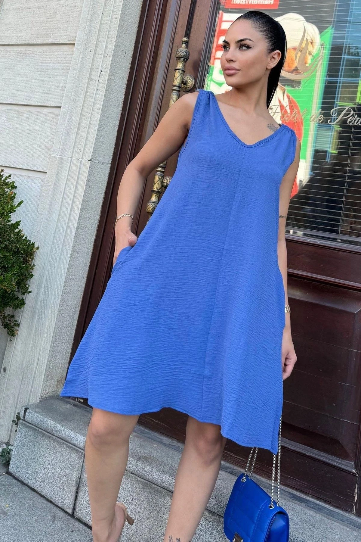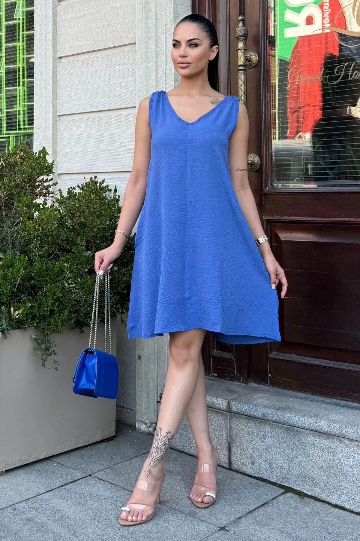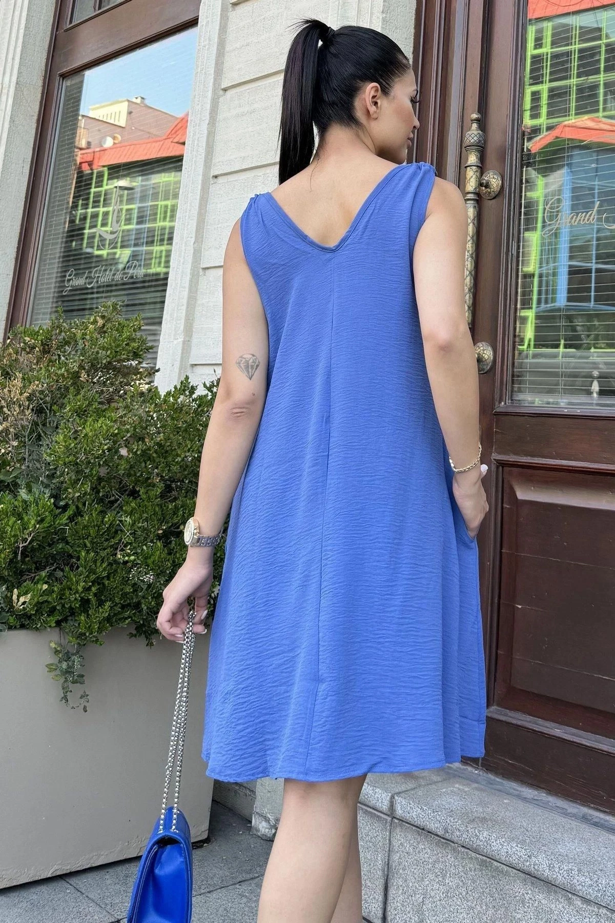 Kadın İndigo Kalın Askılı, Önü Ve Arkası V Yaka, Omzu Tokalı A Kesim, Airobin Salaş Elbise