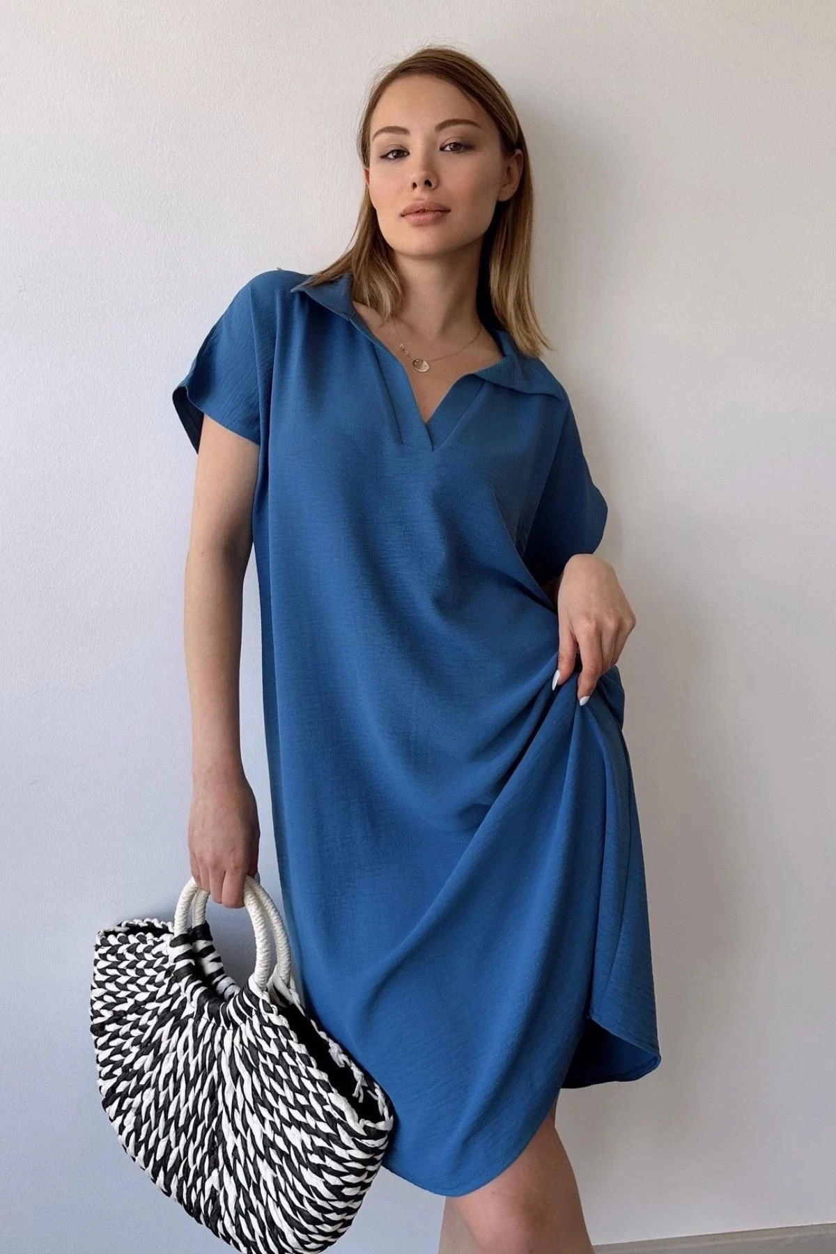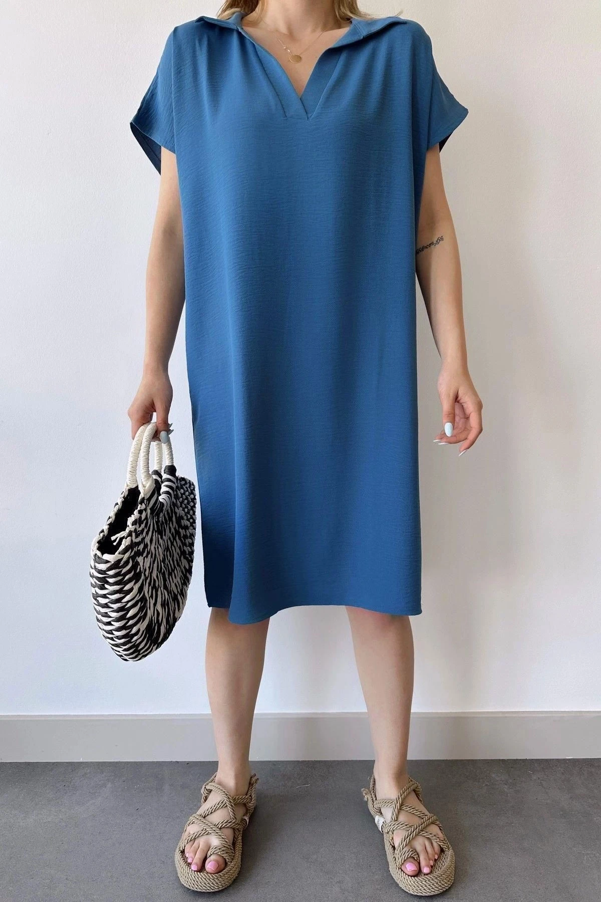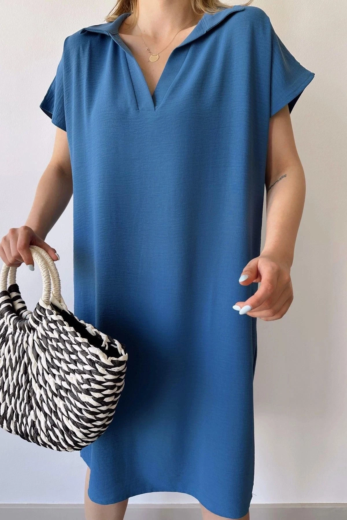 Kadın İndigo Kısa Kol, Polo Yaka, Dokulu Desen, Basic Kalıp/Kesim, Aerobin Rahat Midi Elbise
