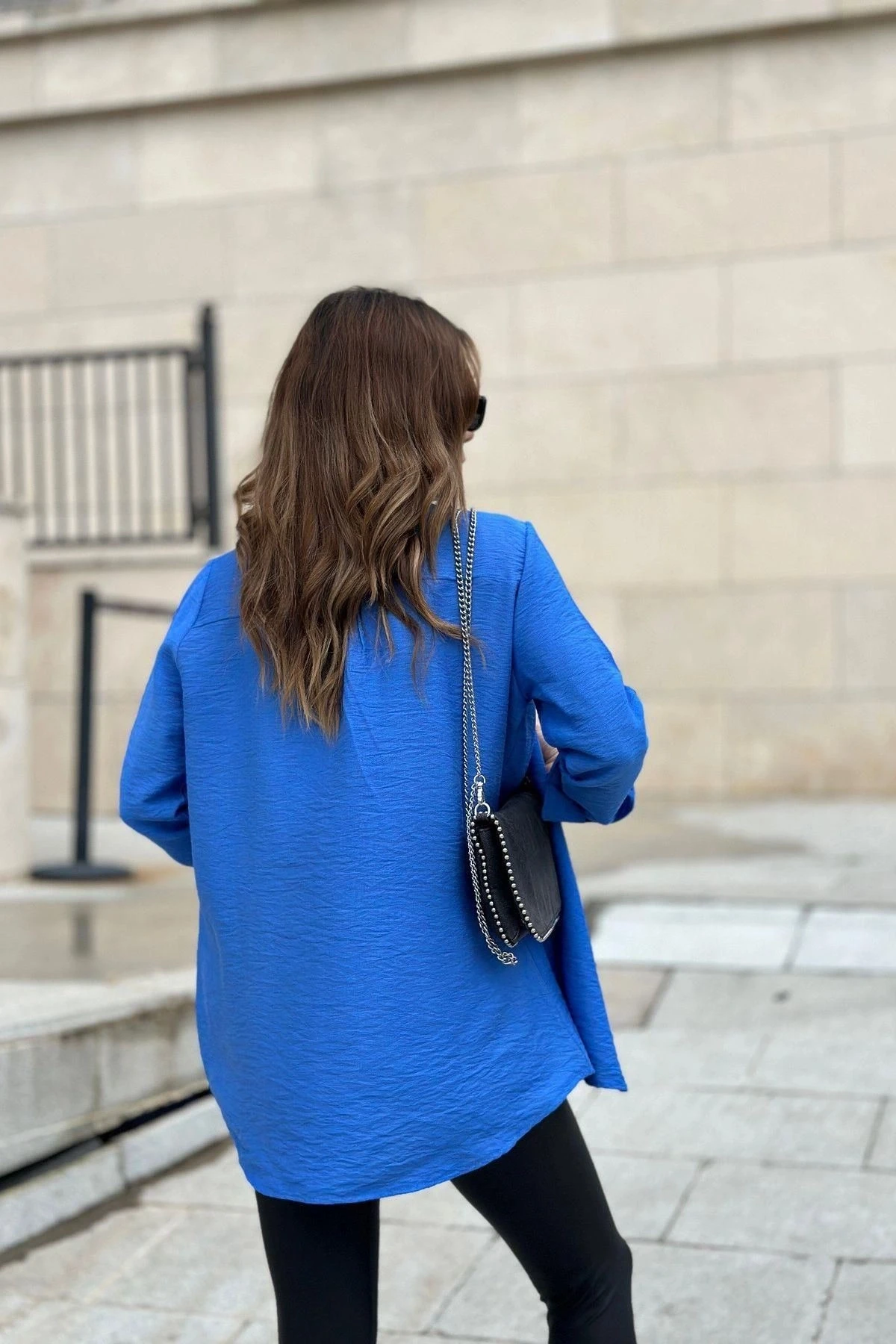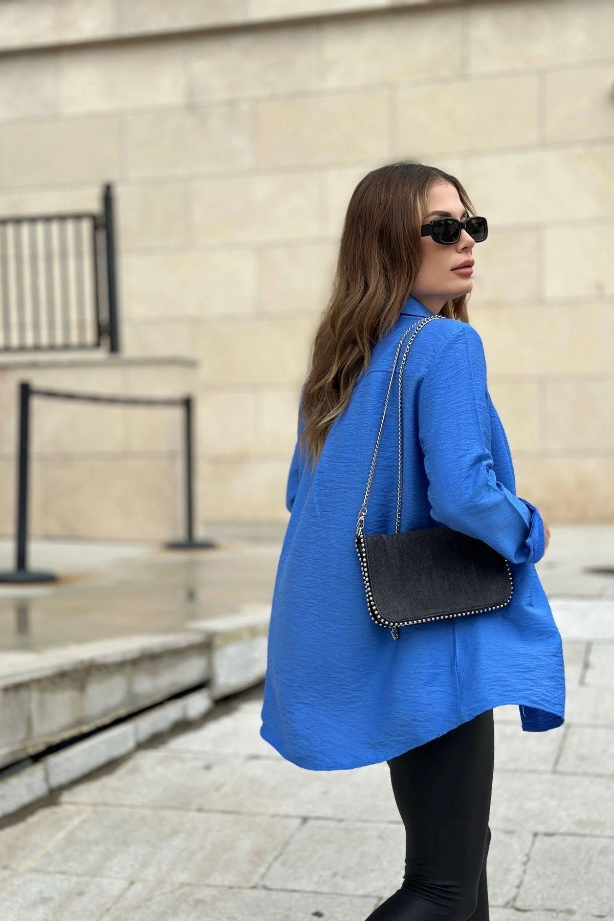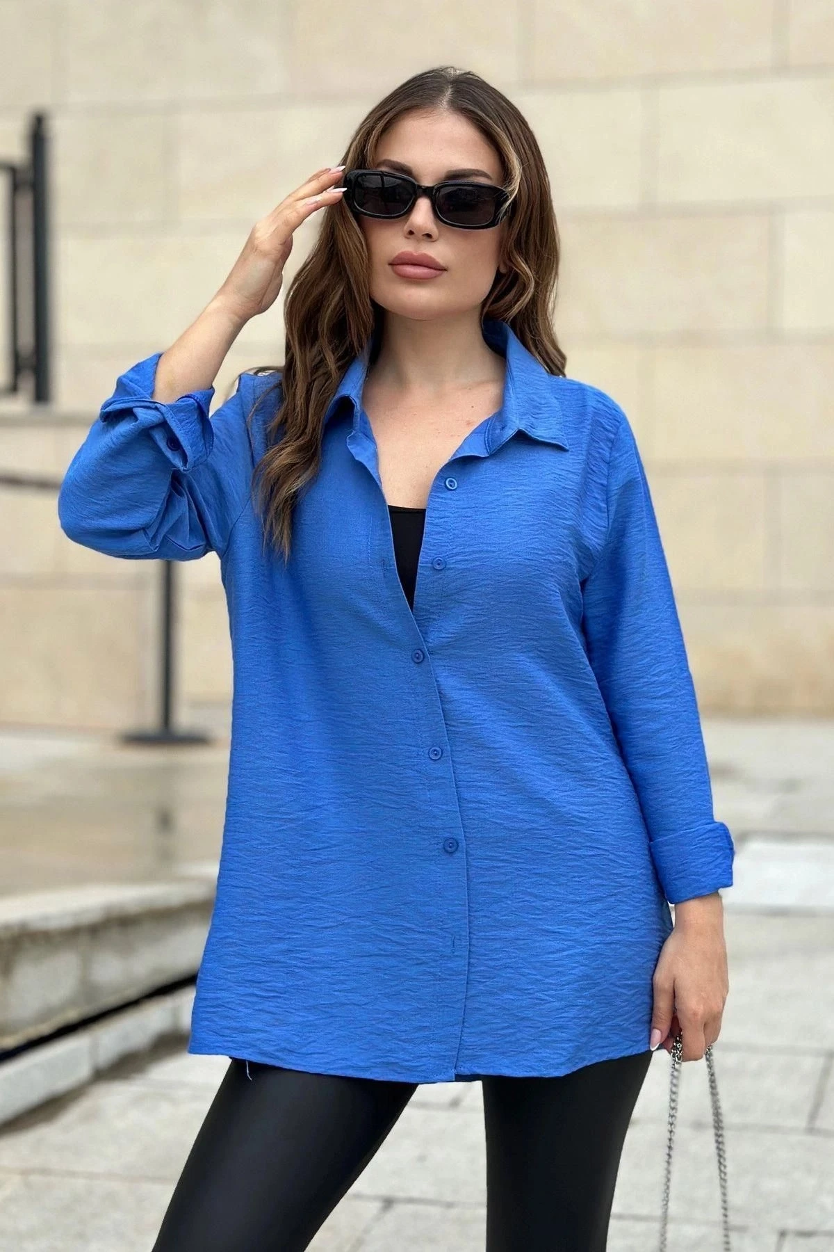 Kadın İndigo Klasik Yaka Uzun Kol Regular Kesim Standart Boy Gömlek(Özel Kumaş)