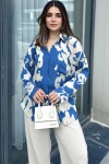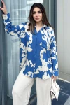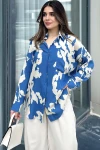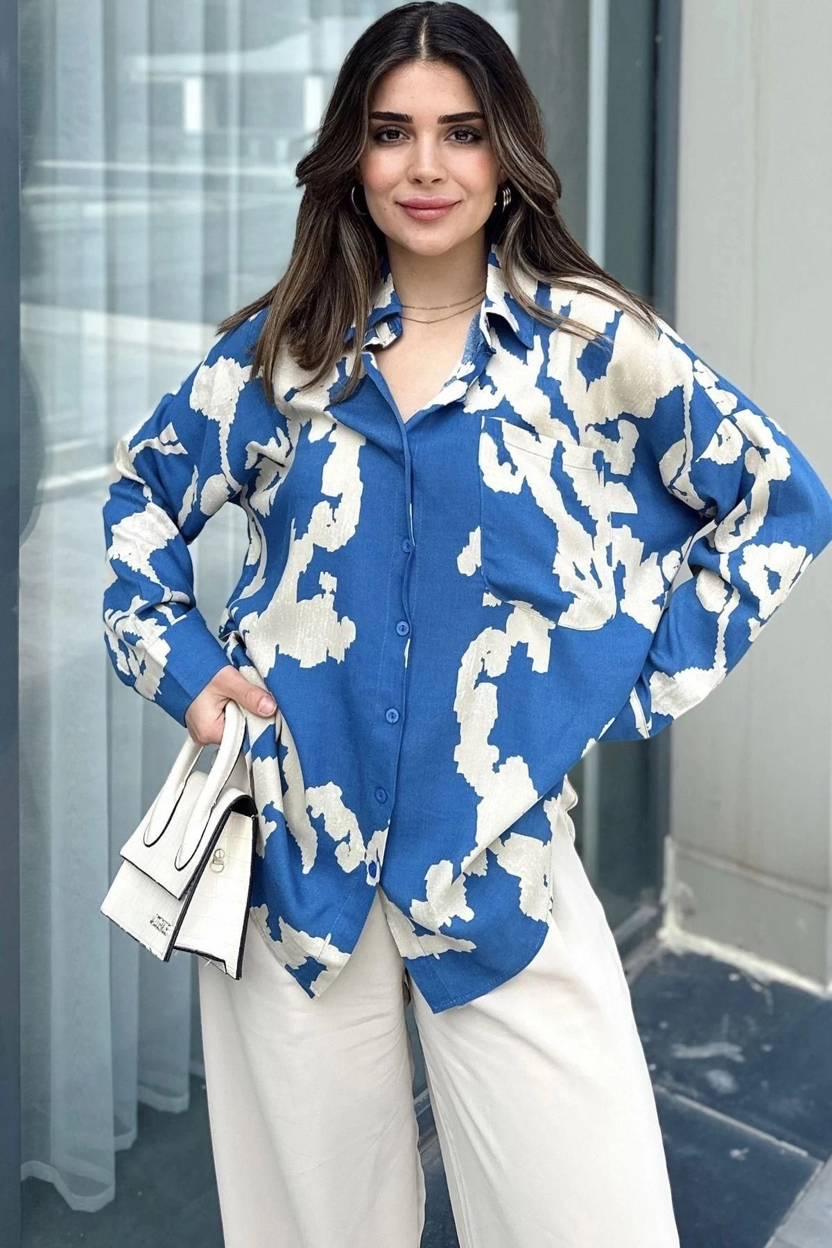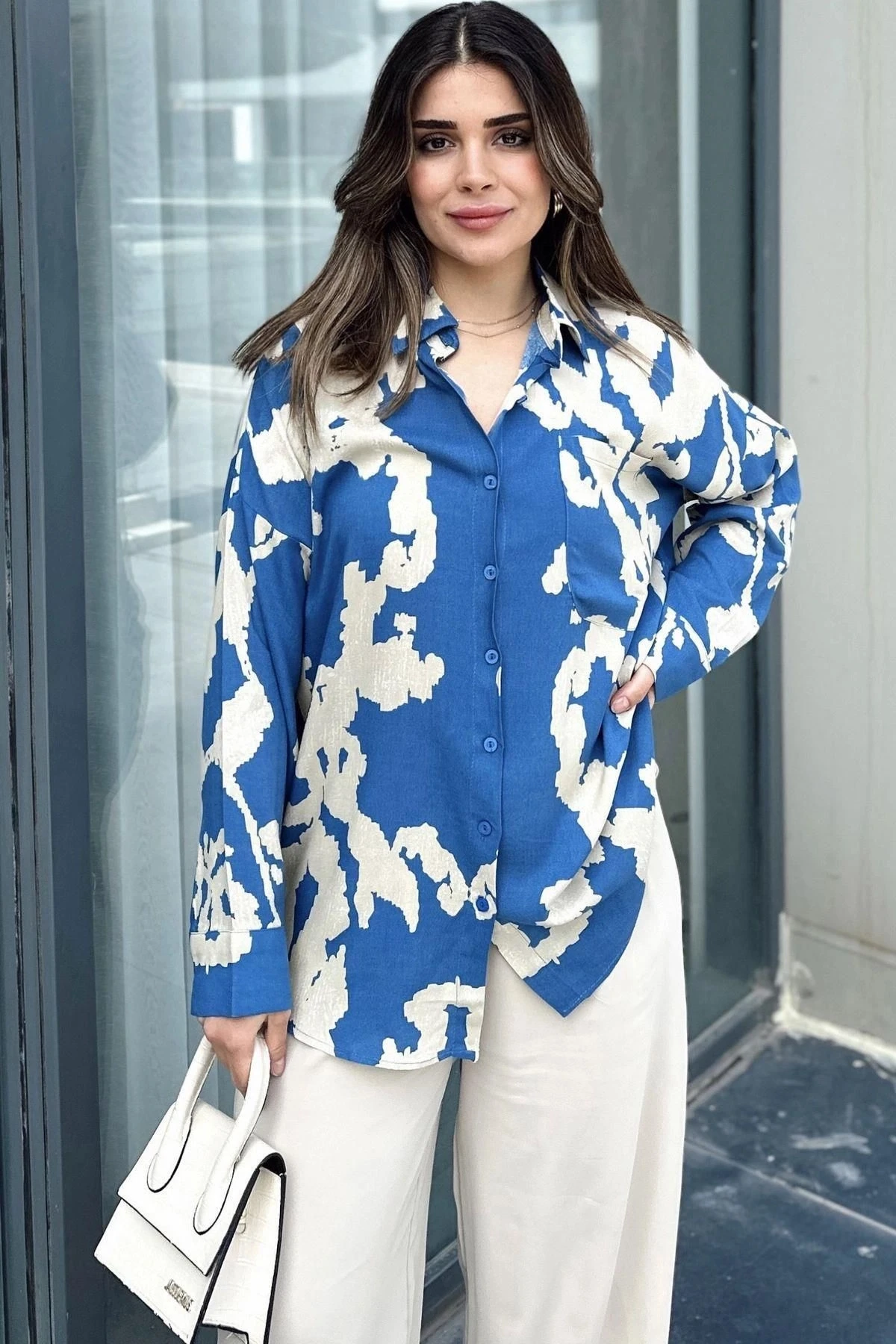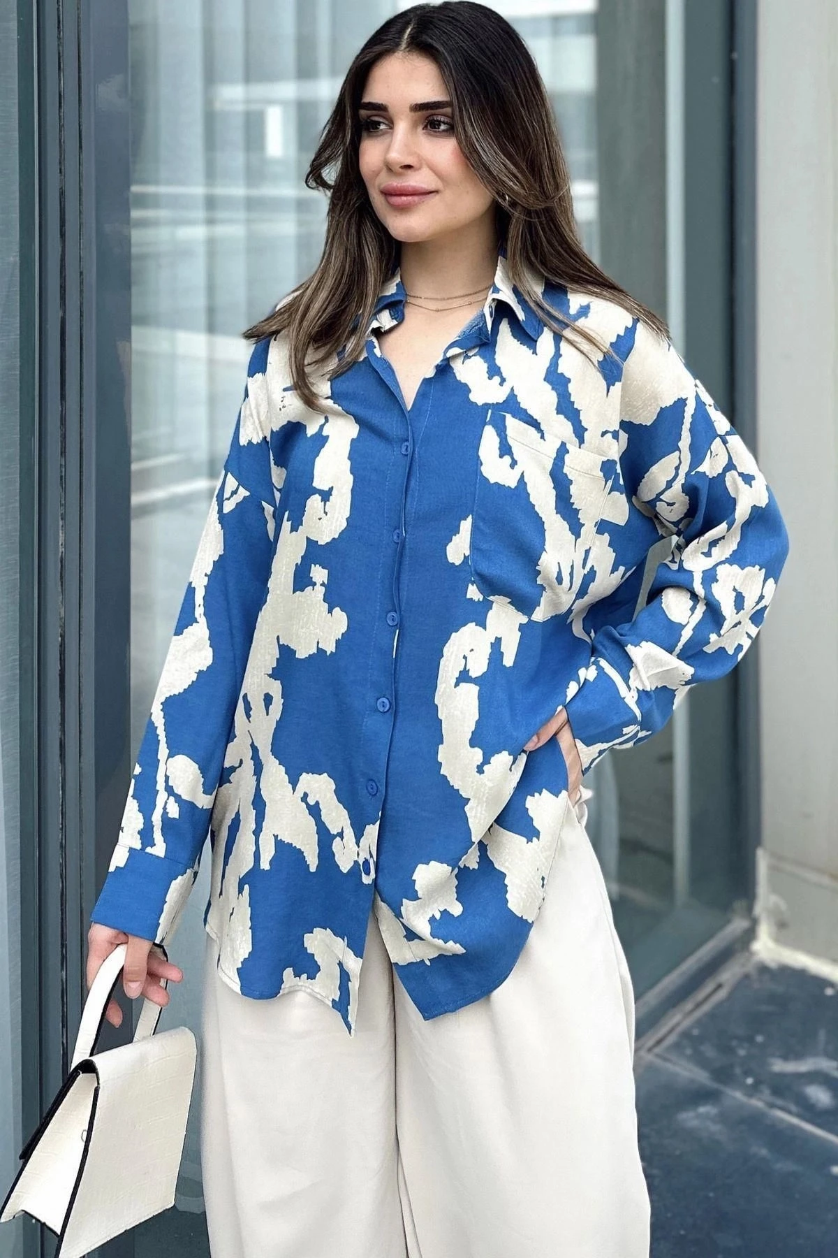 Kadın İndigo Uzun Kol, Arkası Pliseli, Salaş Dökümlü, Viskon Gömlek