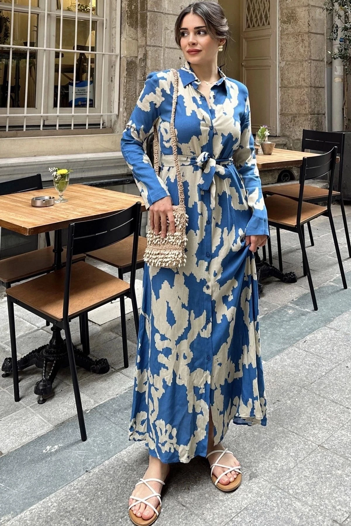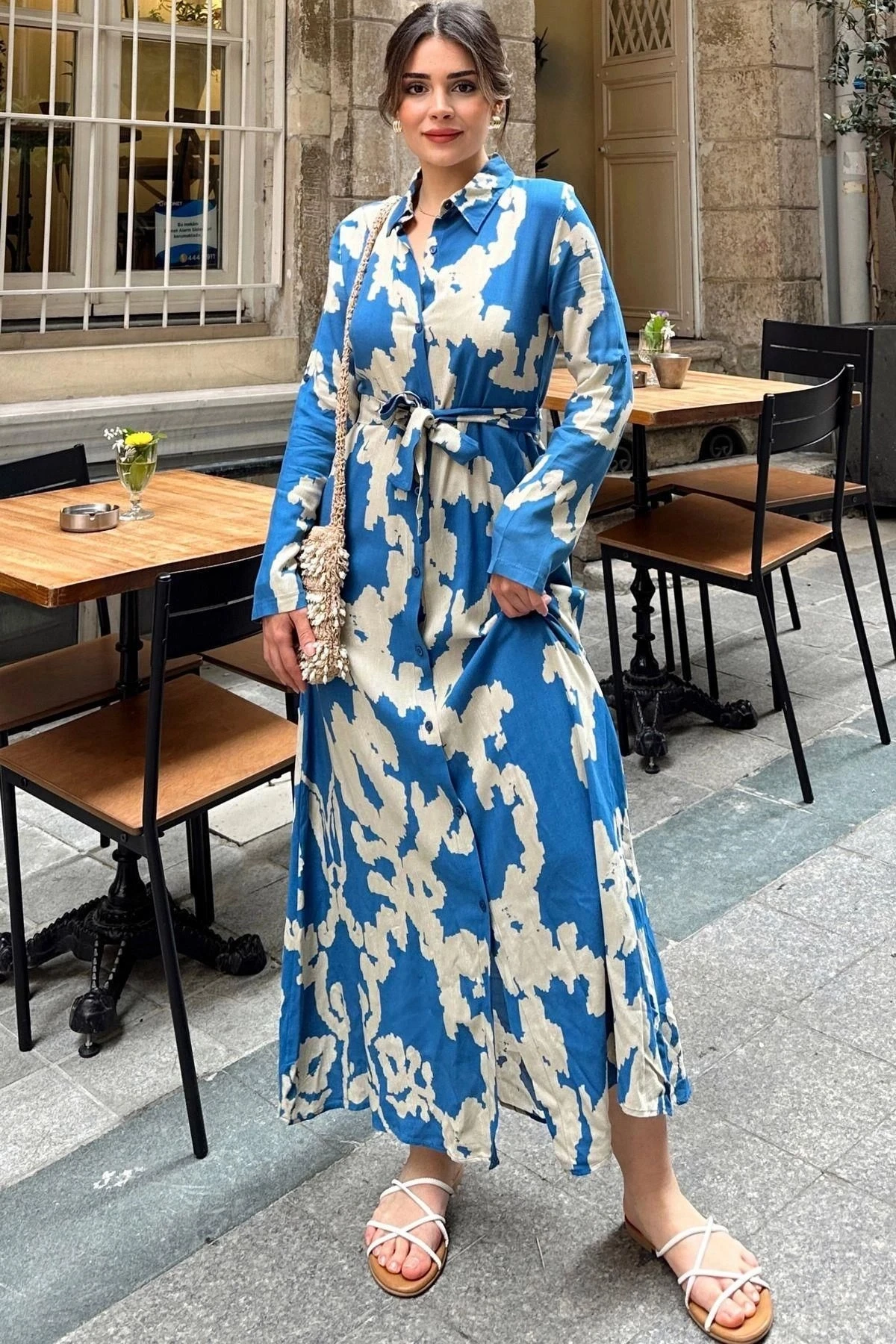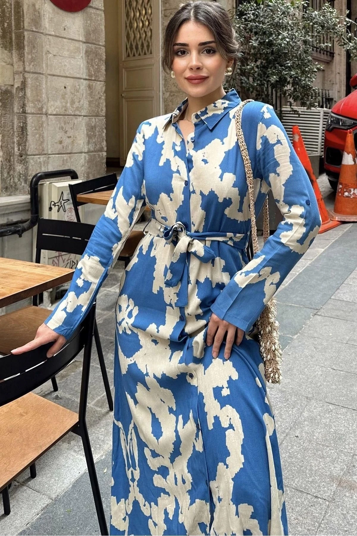 Kadın İndigo Uzun Kol, Kuşaklı, Yırtmaçlı, Uzun Viskon Gömlek Elbise (Dar Kalıp)