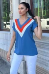 Kadın İndigo V Yaka, Kısa Kol, Color Block Detaylı Salaş Airobin Bluz