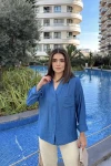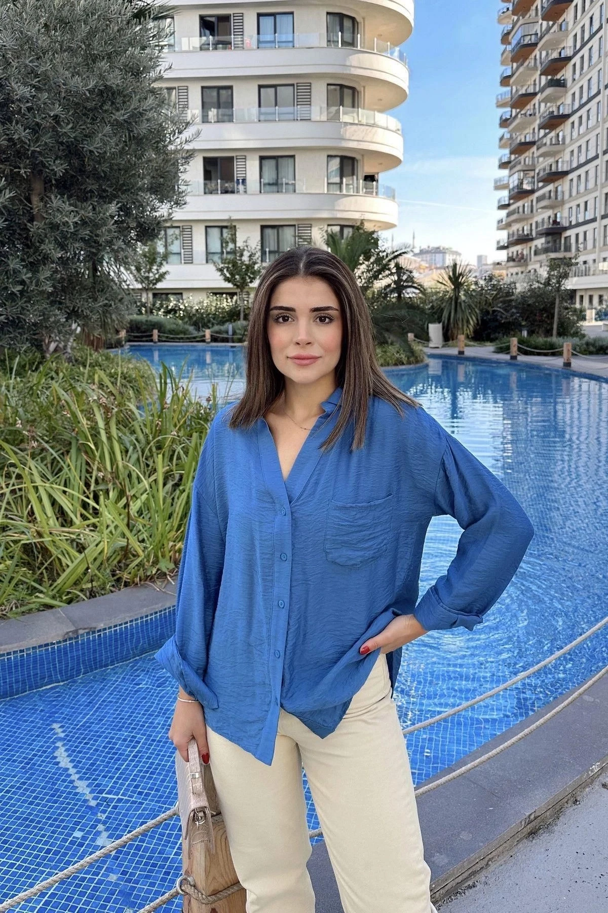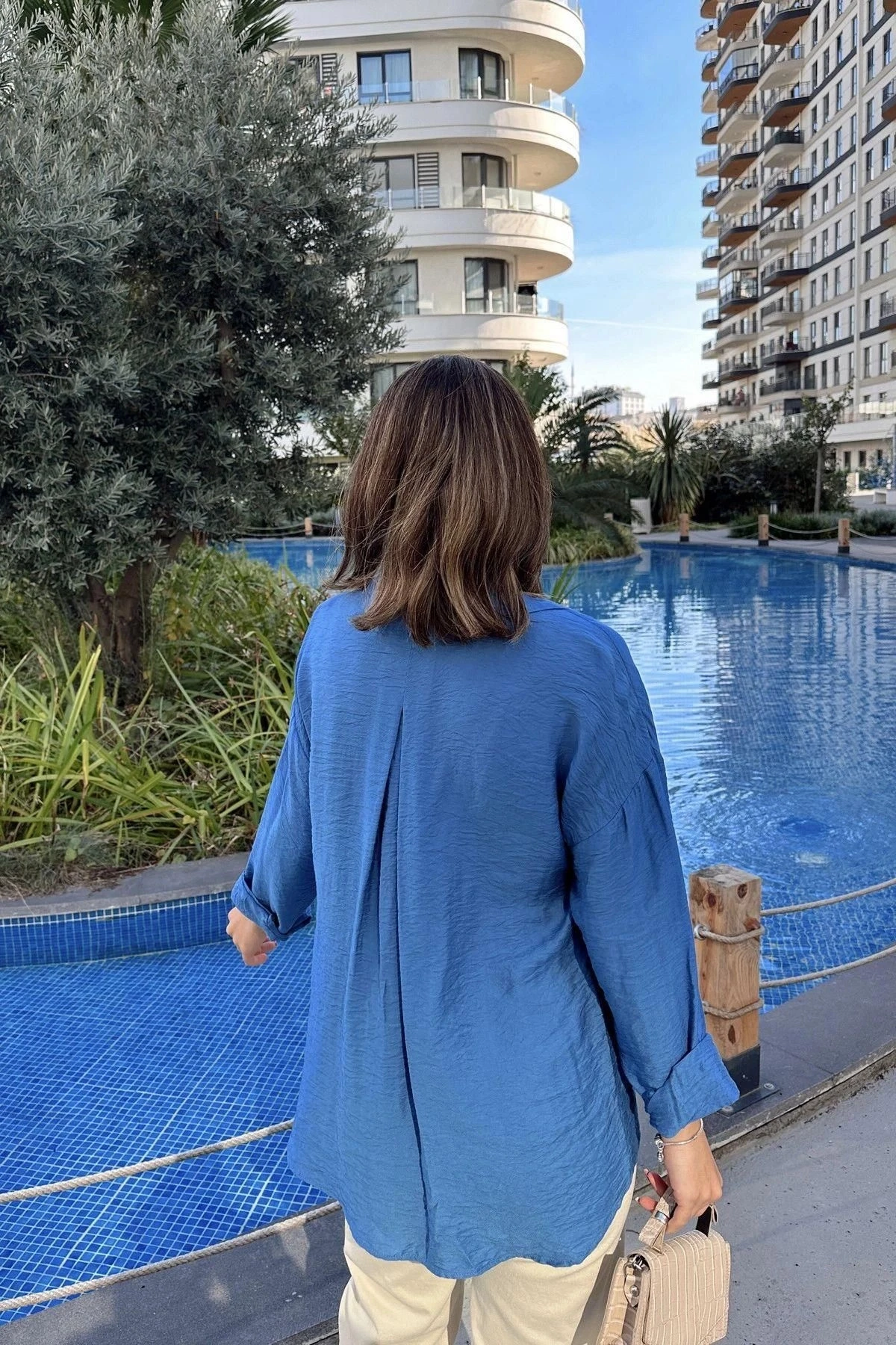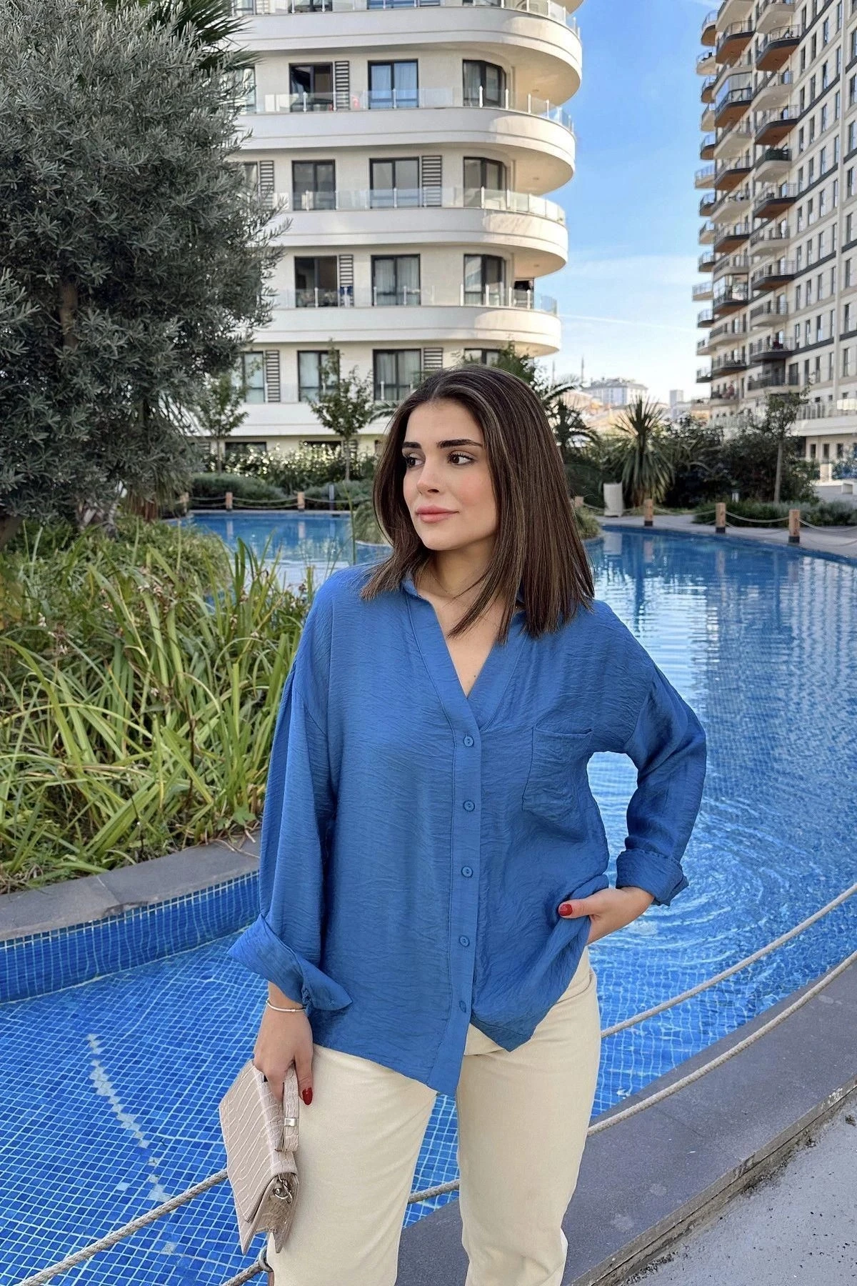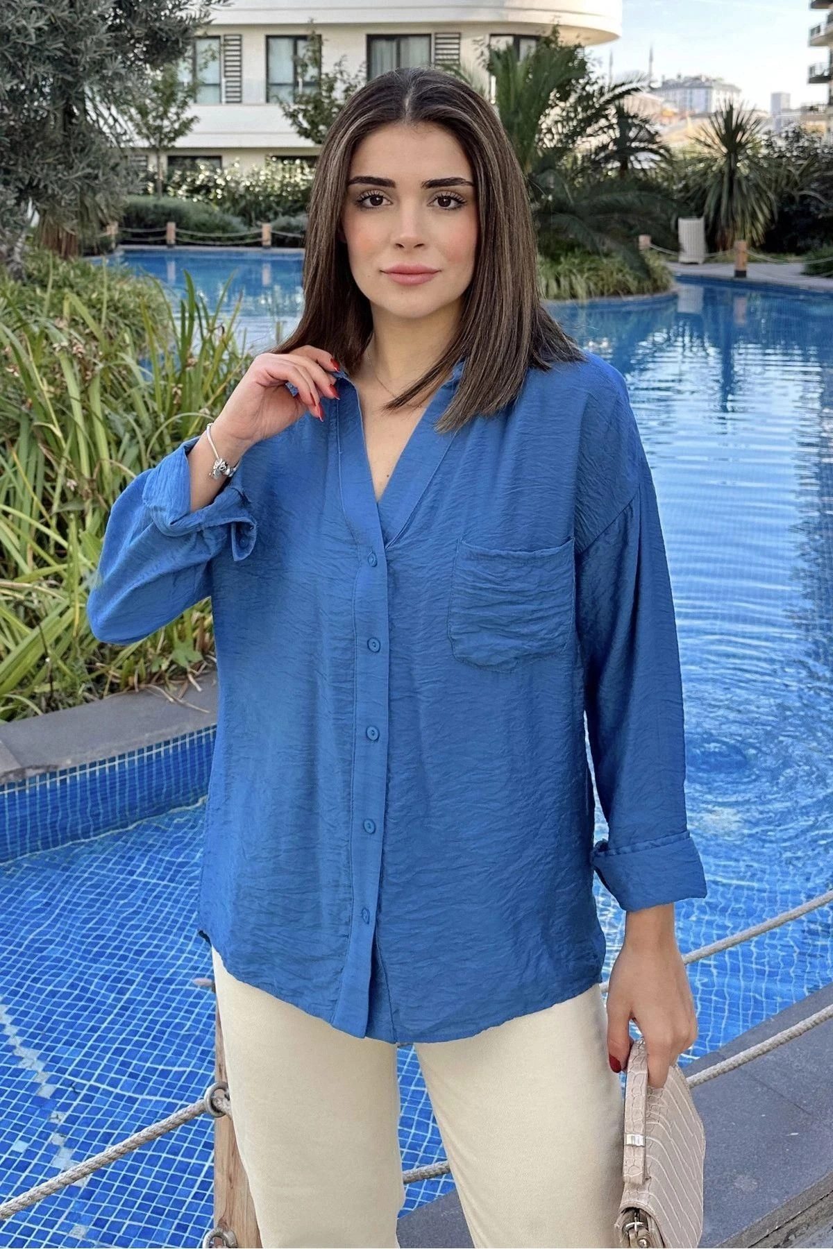 Kadın İndigo V Yaka, Uzun Kol, Airobin Kumaş, Arkası Pliseli, Salaş Gömlek