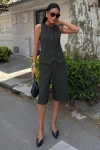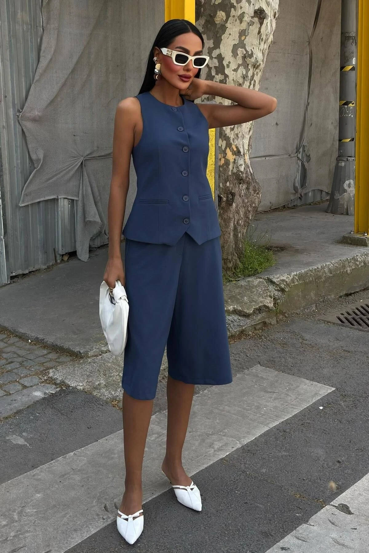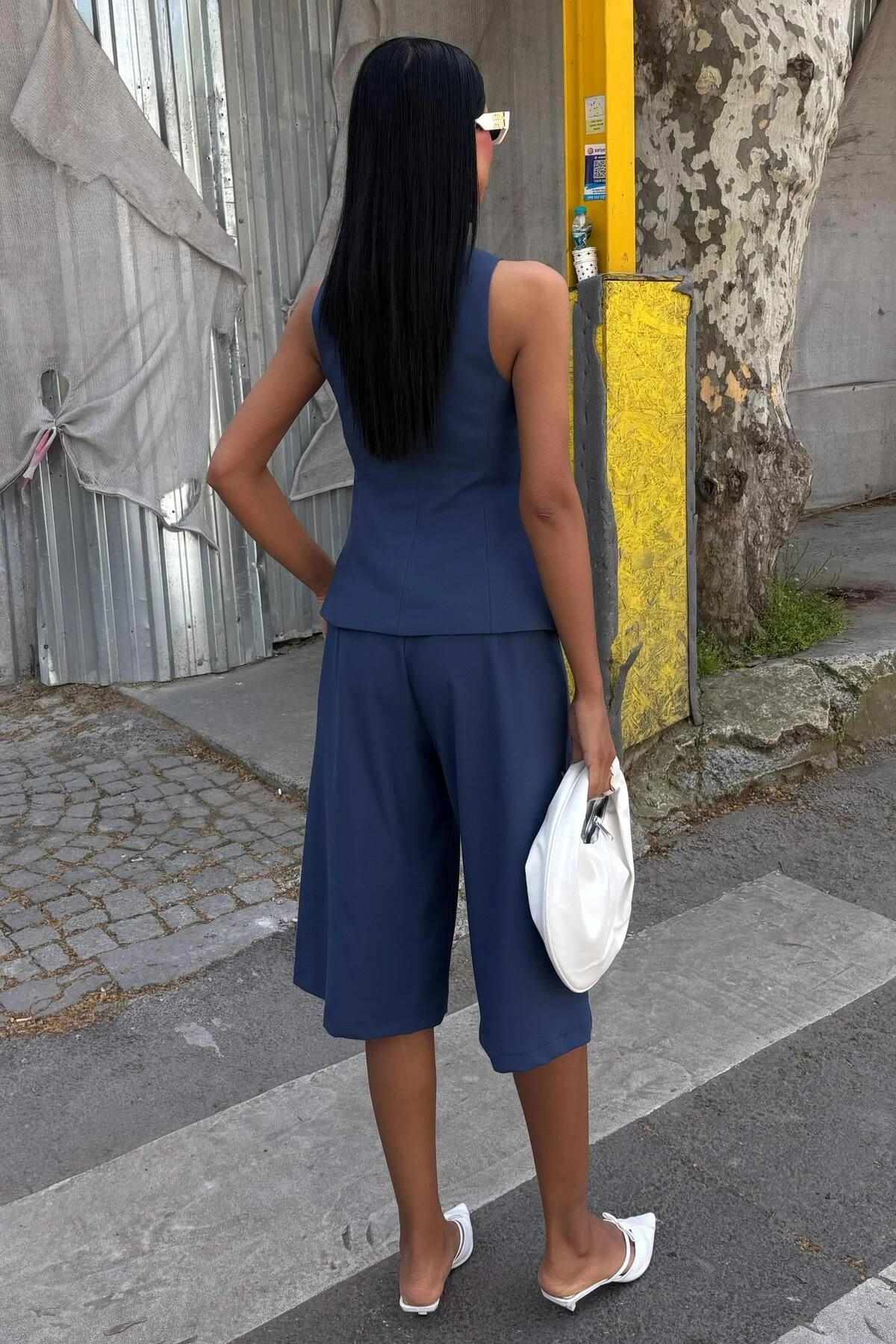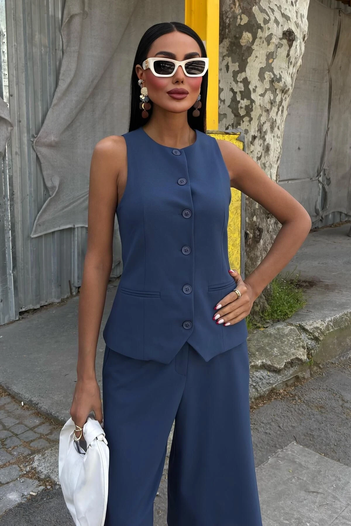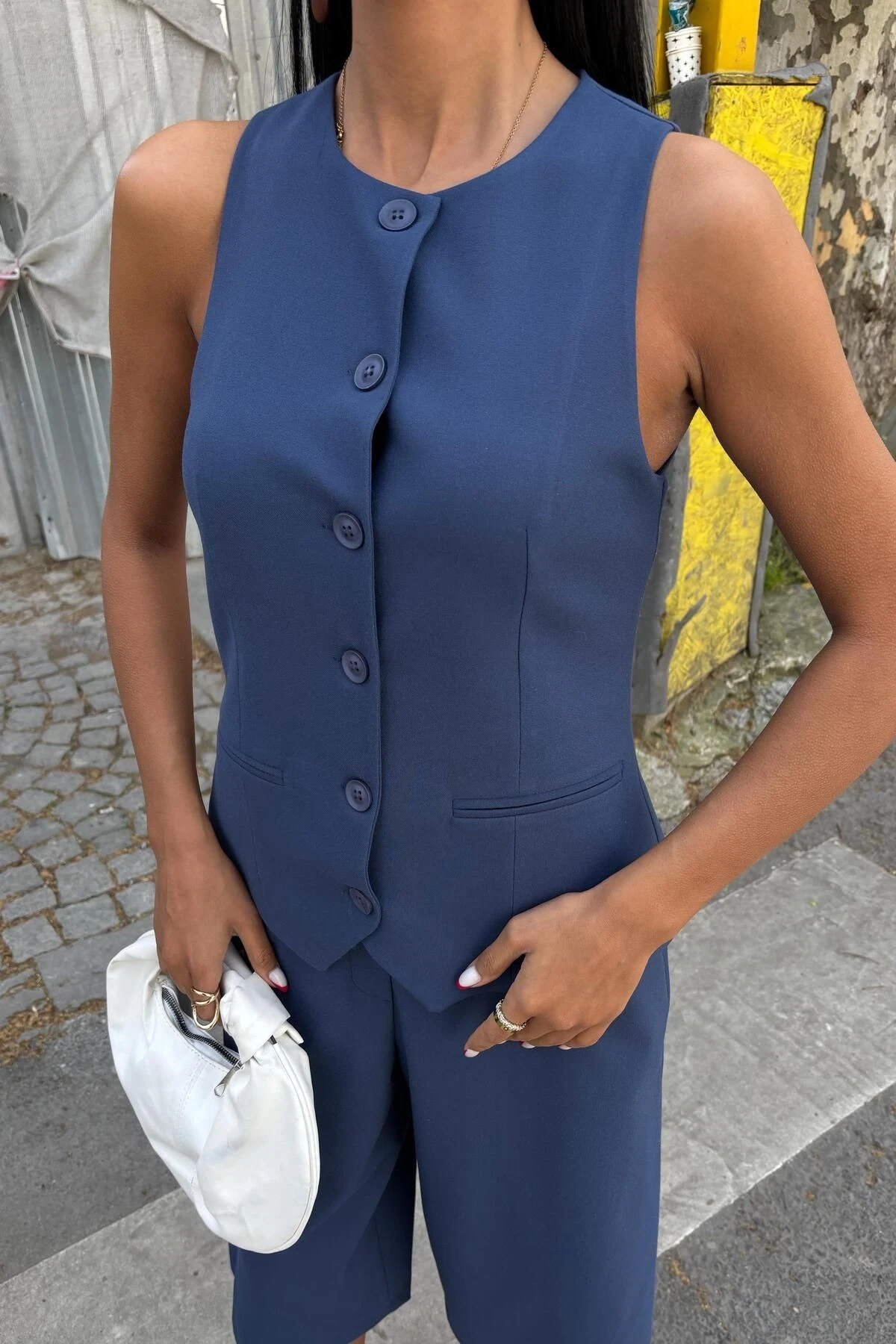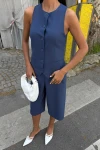 Kadın İndigo Viskon Düz Midi Kolsuz Takım