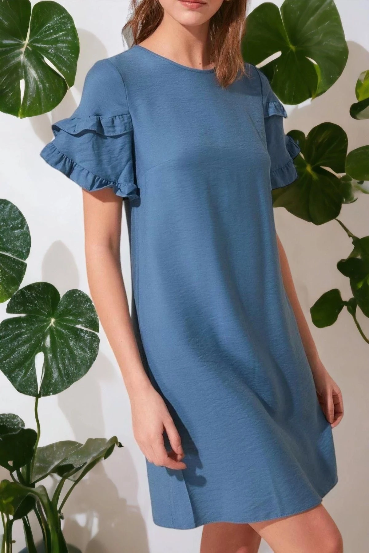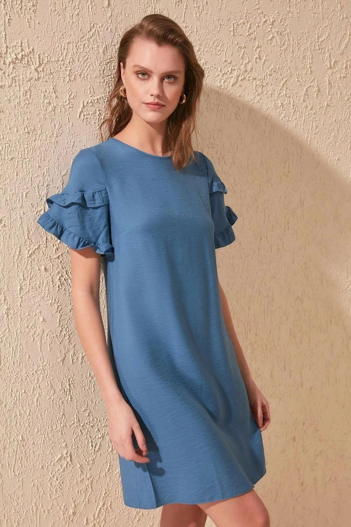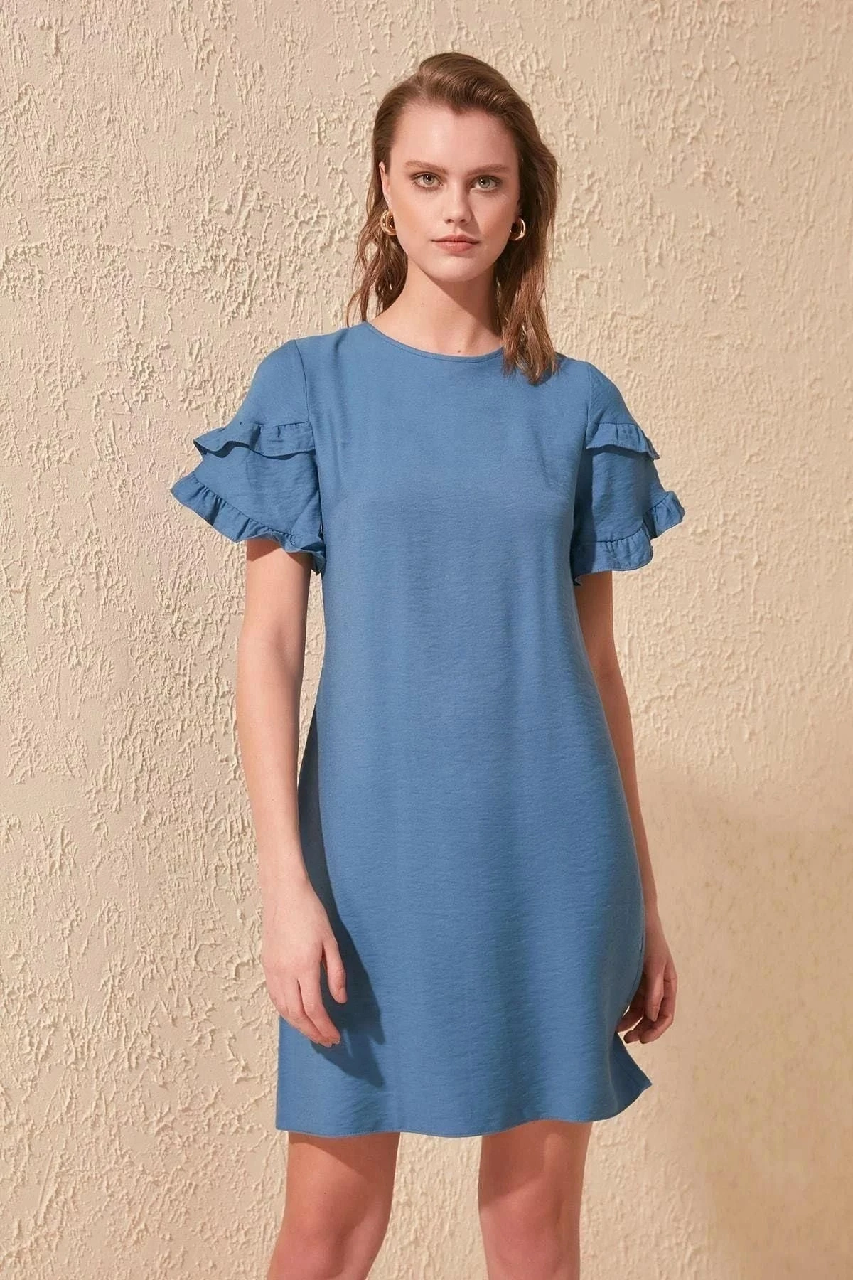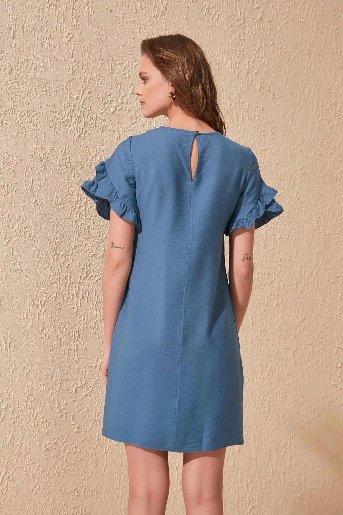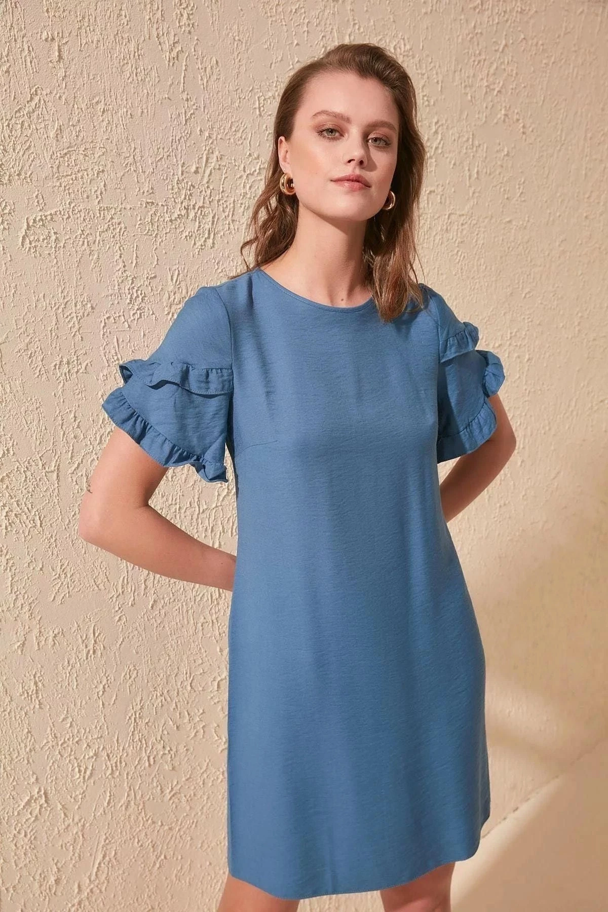 Kadın İndigo Yuvarlak Yaka Yarım Kol Kolları Fırfırlı A Kesim Midi Boy Diz üstü Elbise
