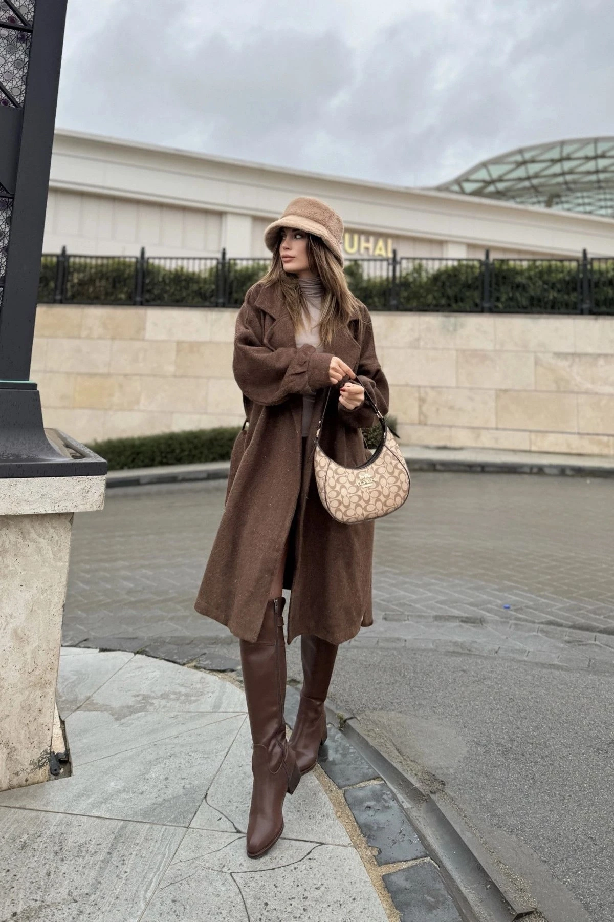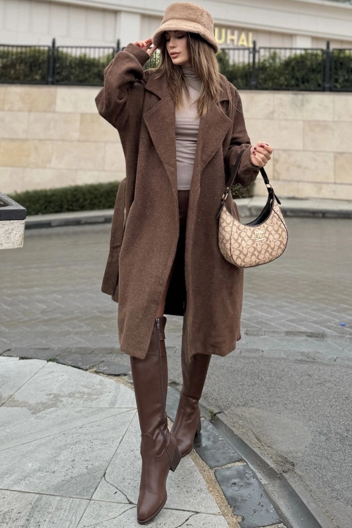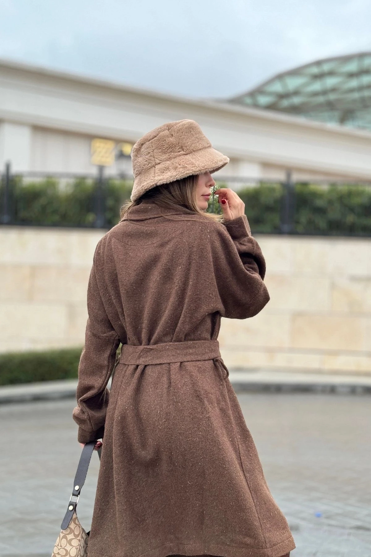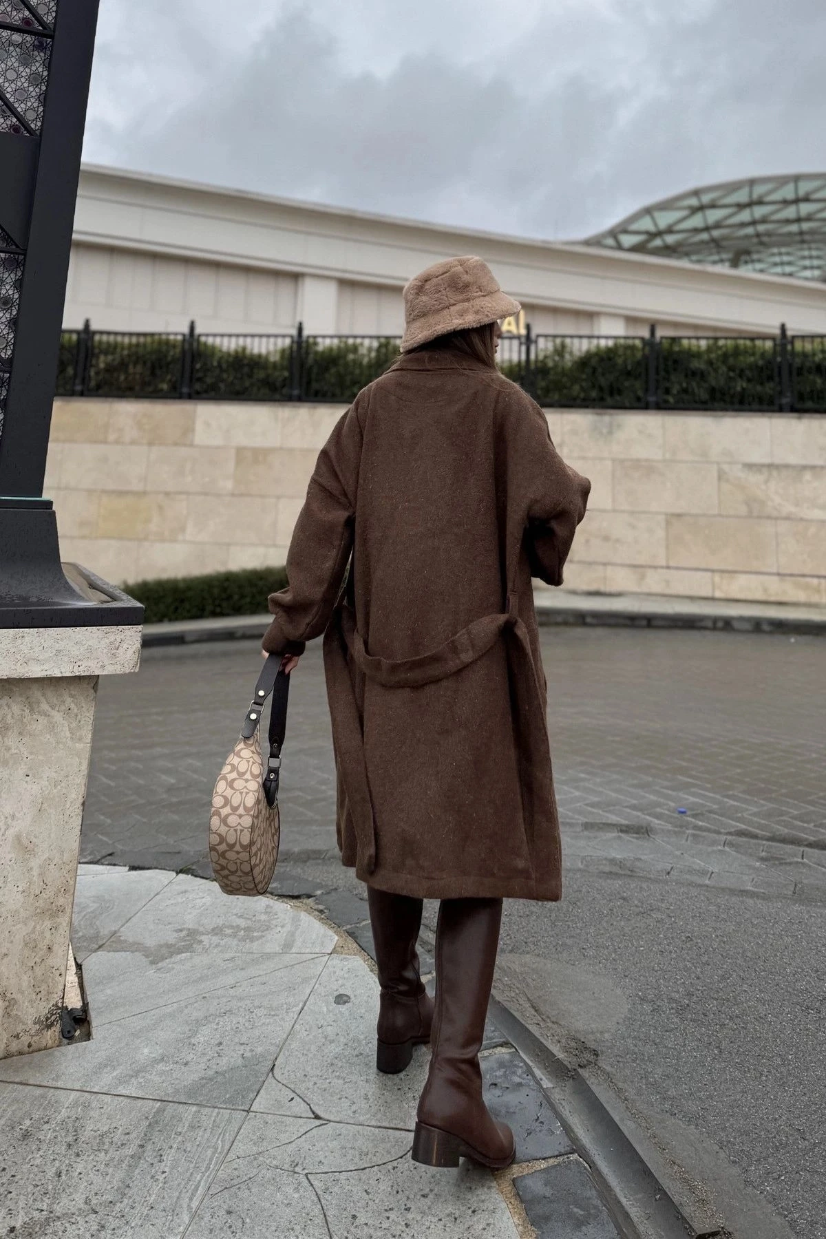 Kadın Kahve Balon Kol Beli Kemerli Midi Kaşe Ceket (Astarsız)