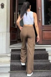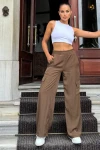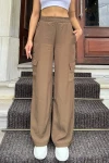 Kadın Kahve Beli Lastikli, Kargo Cepli, Bol Paça Kupra Kumaş Palazzo Pantolon - Tesettüre Uygun