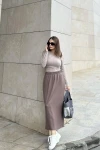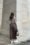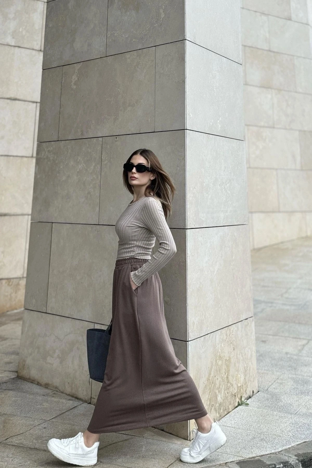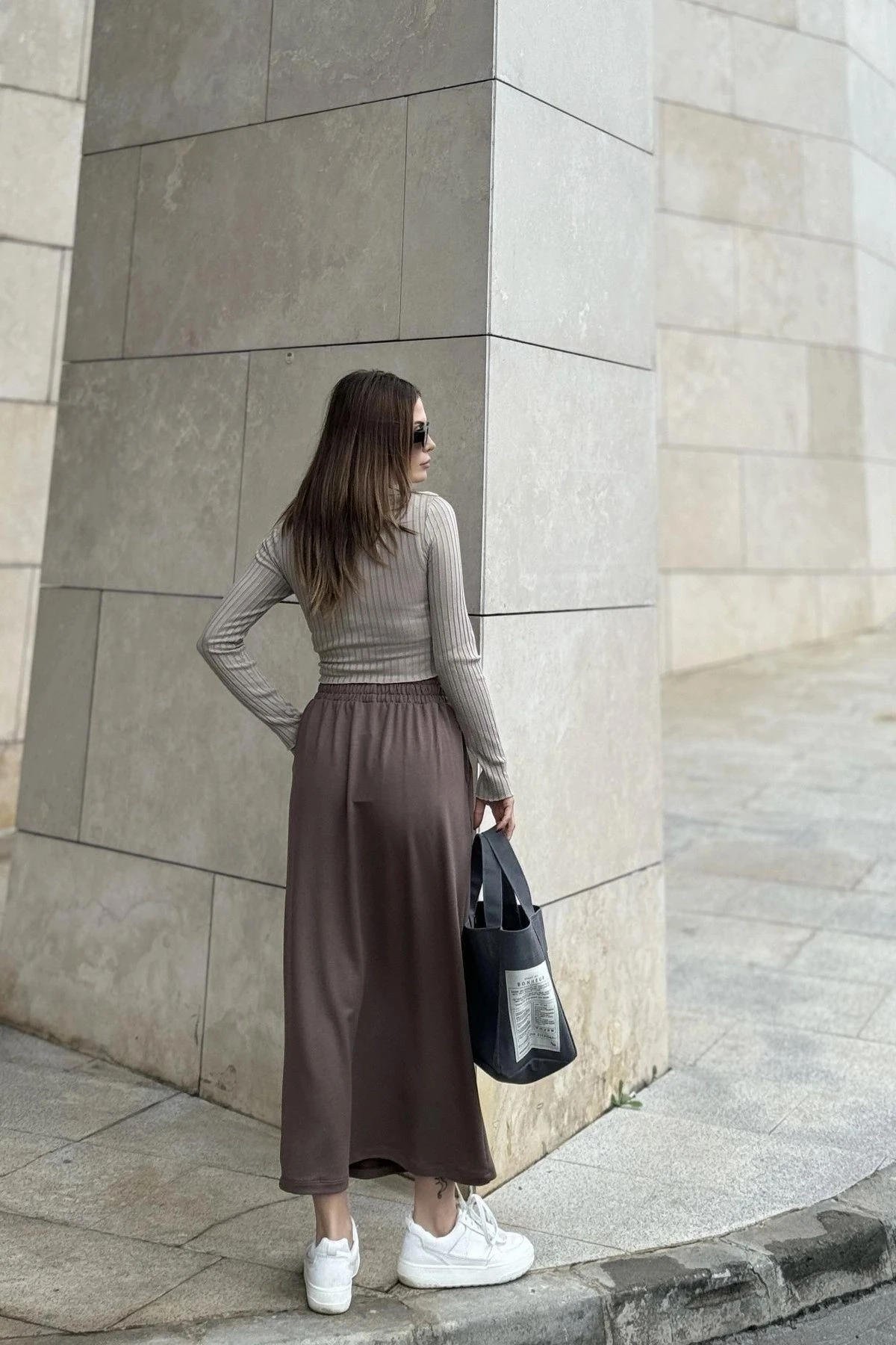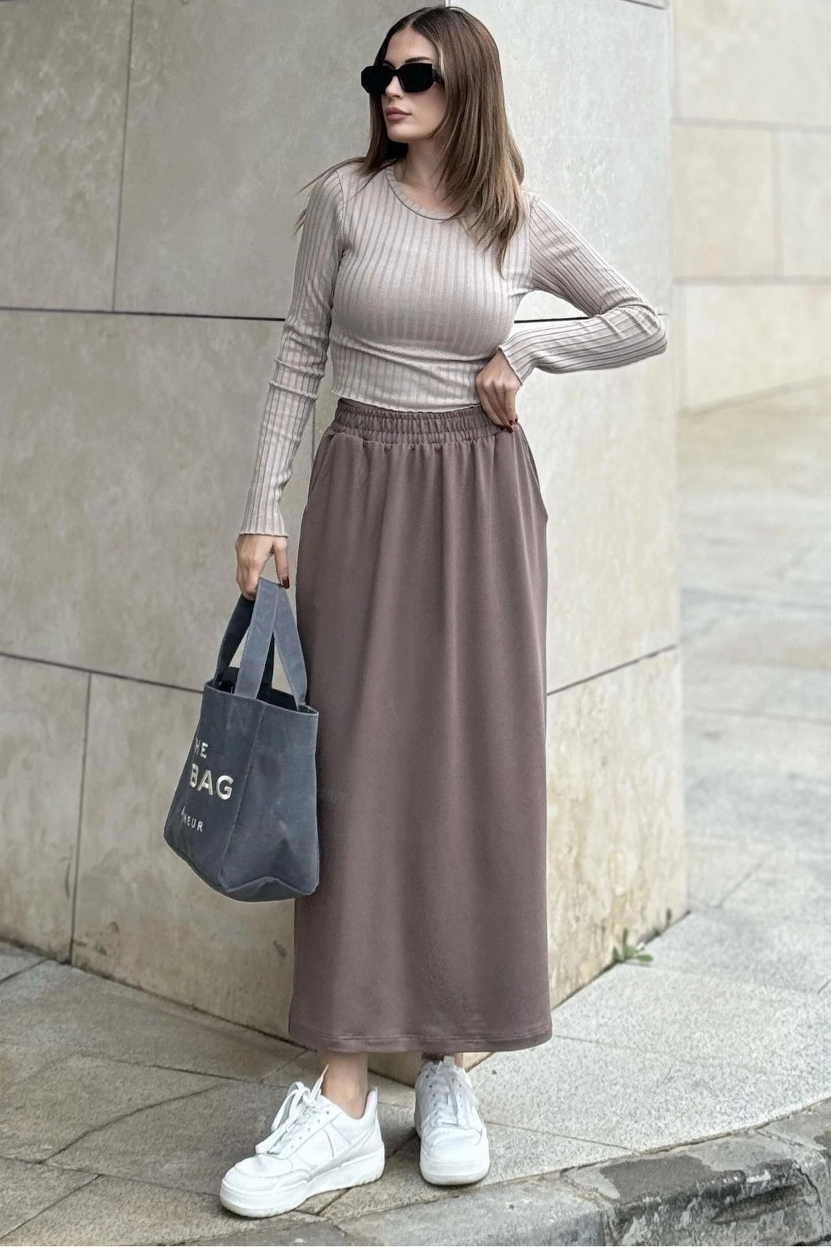 Kadın Kahve Beli Lastikli, Rahat Kalıp, Cepli Uzun Etek