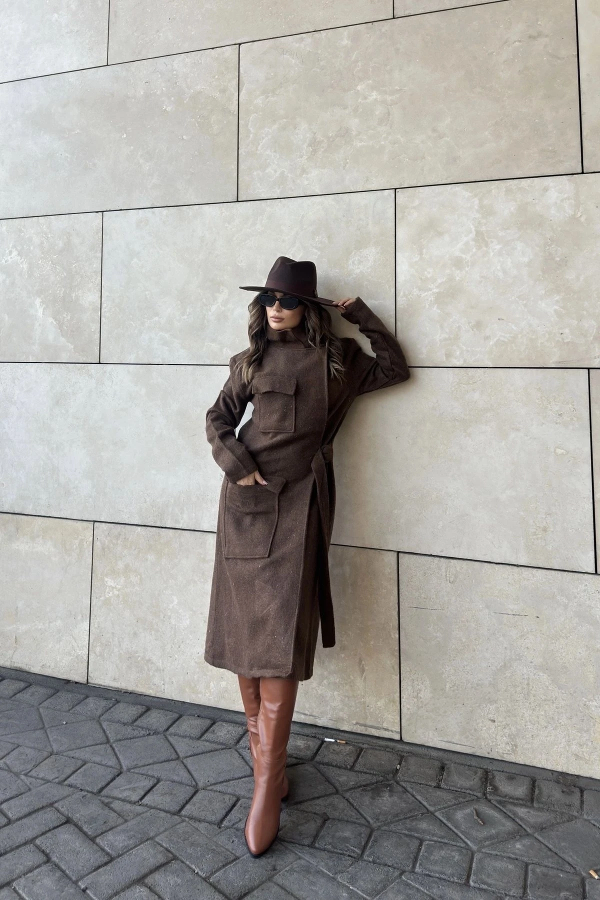 Kadın Kahve Cepli, Beli Kemerli, Kapalı Yaka, Cepli, Uzun Kaşe Kaban (ASTARSIZ)