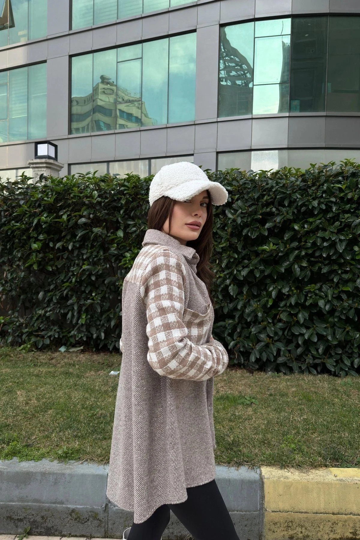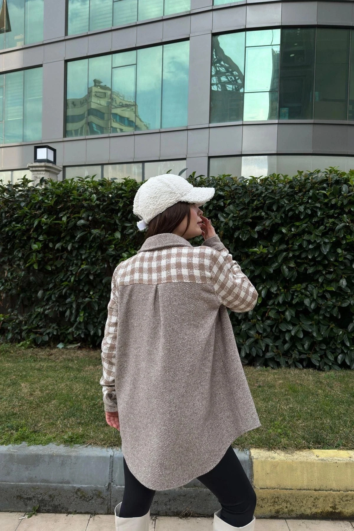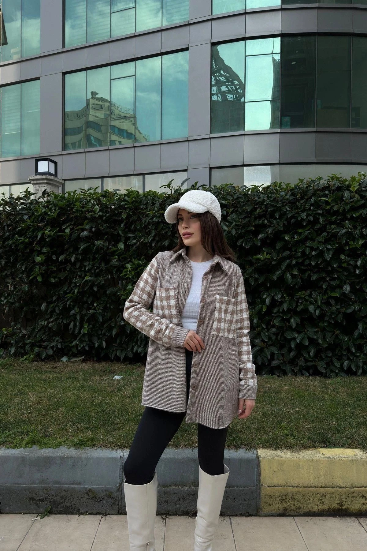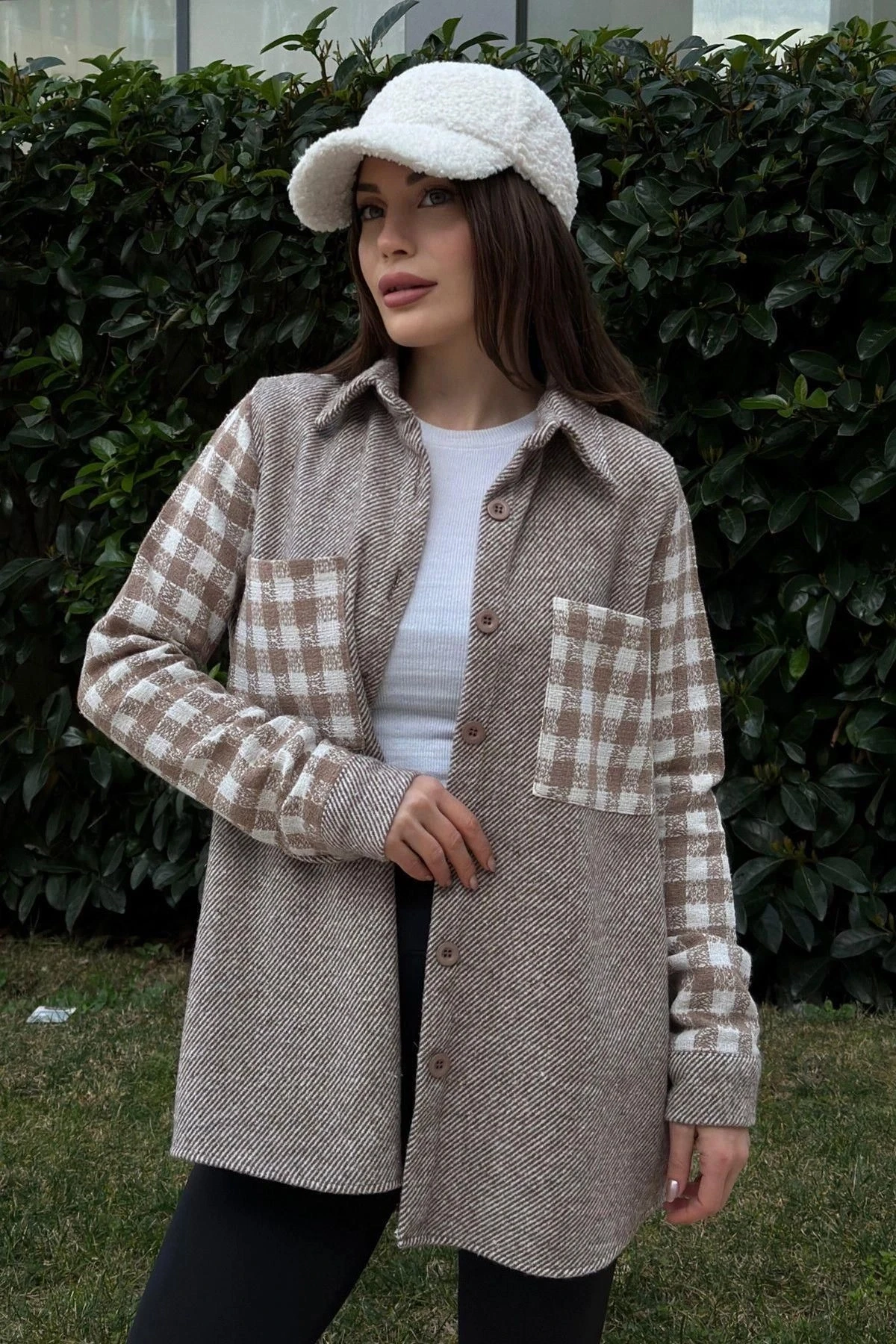 Kadın Kahve Çift Cepli, Ekose Patchwork Desenli, Rahat Kalıp, Kaşe Gömlek