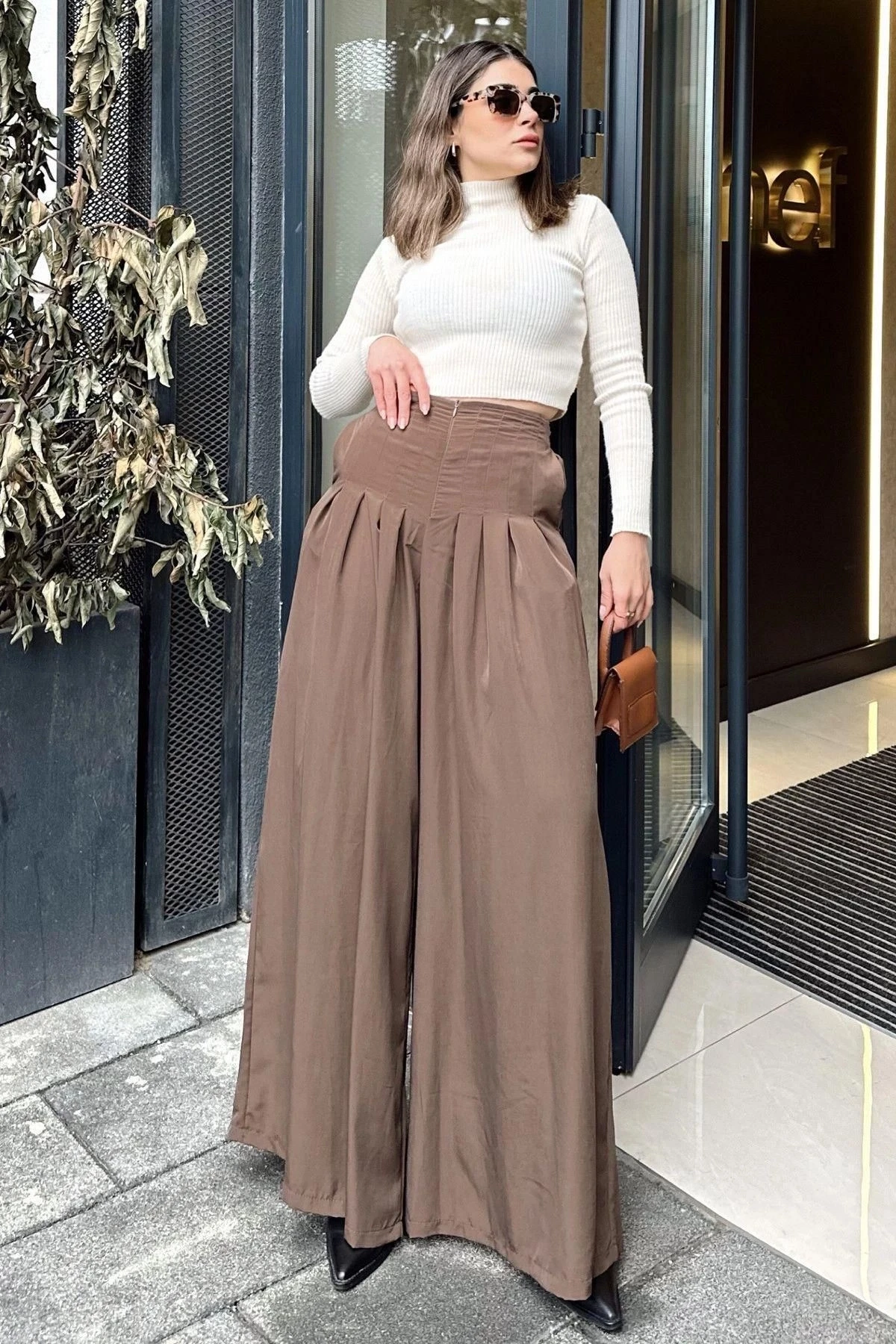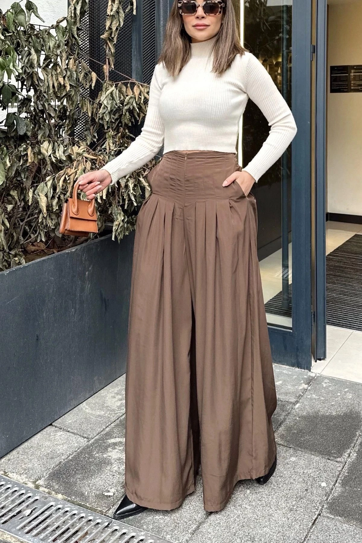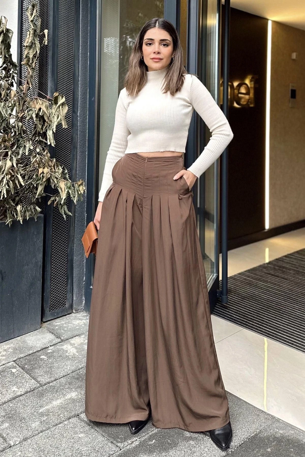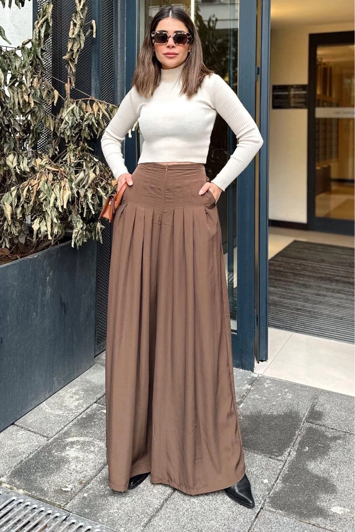 Kadın kahve Fermuar Kapamalı, Cepli, Pileli Bol Paça Etek Pantolon