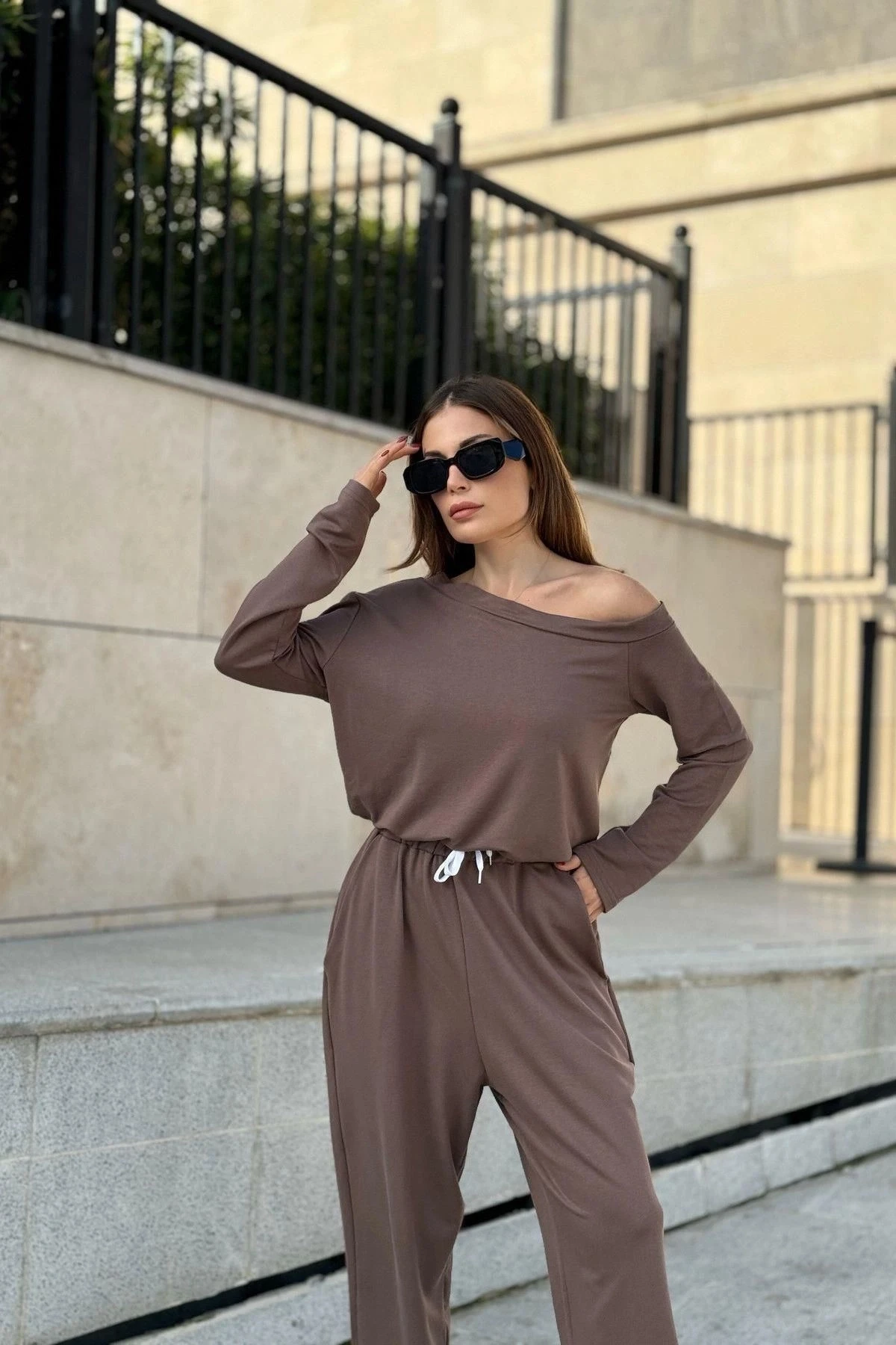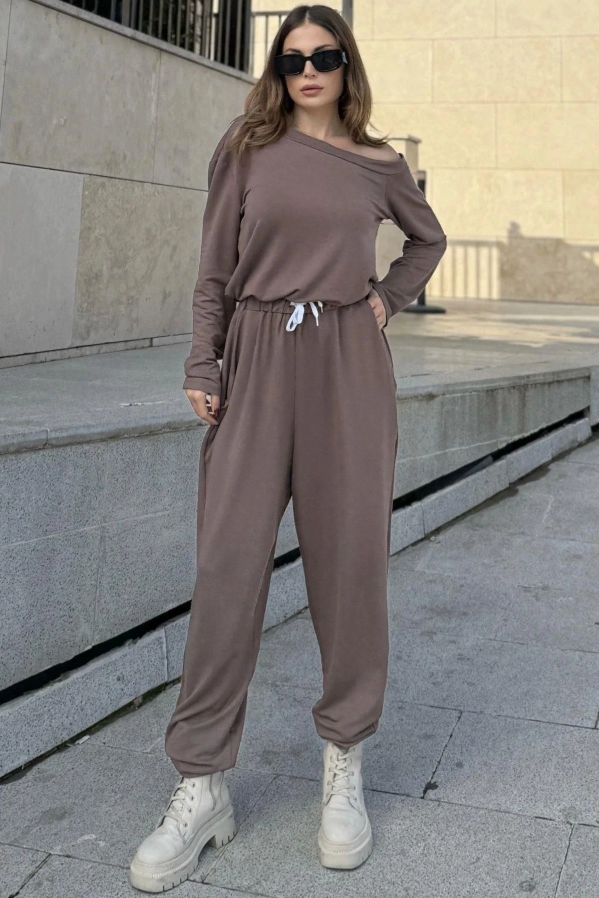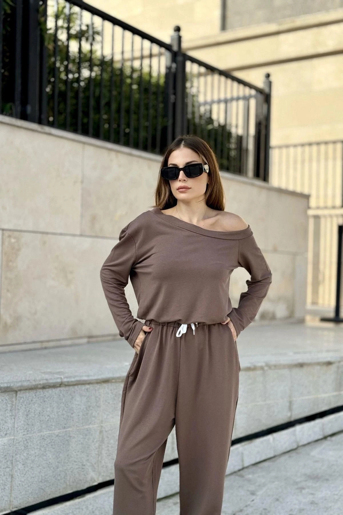 Kadın Kahve Geniş Yaka, Beli Bağcıklı, Paçaları Lastikli Uzun Kol Salaş Tulum