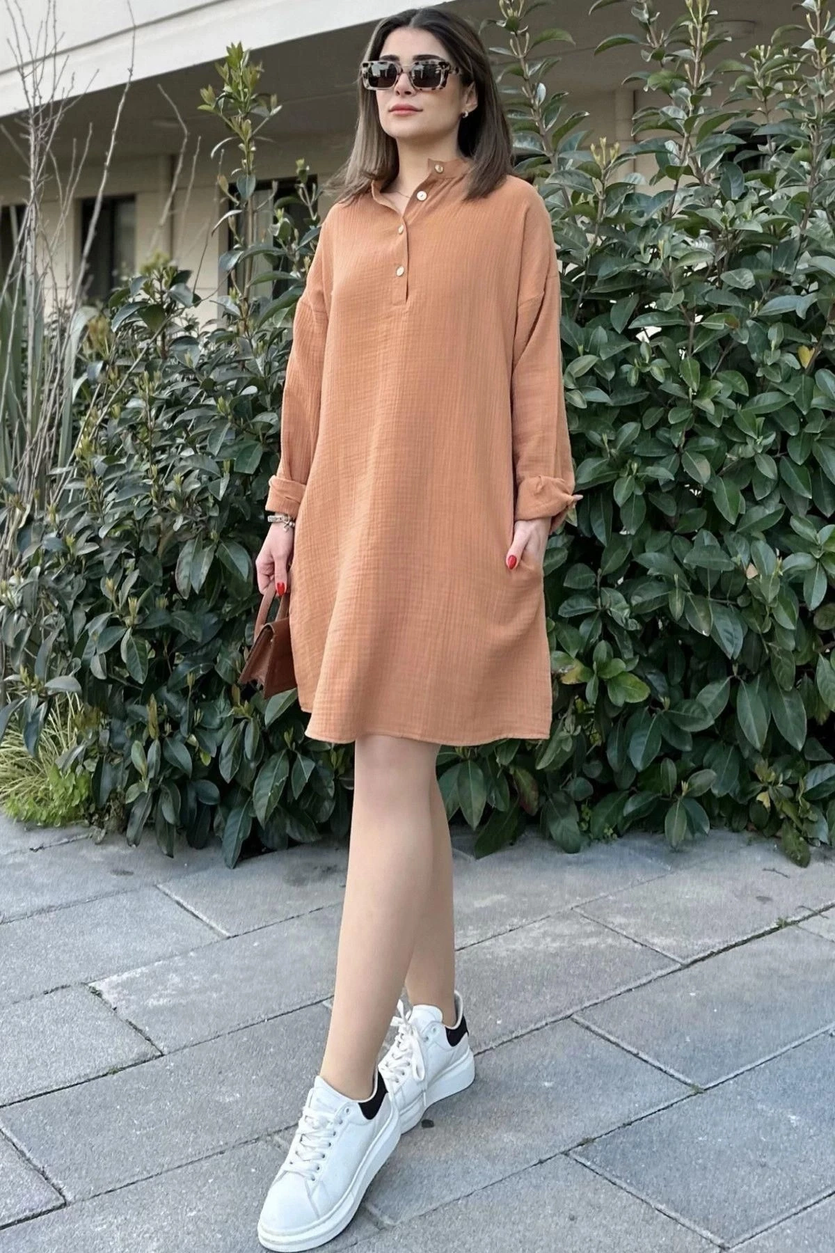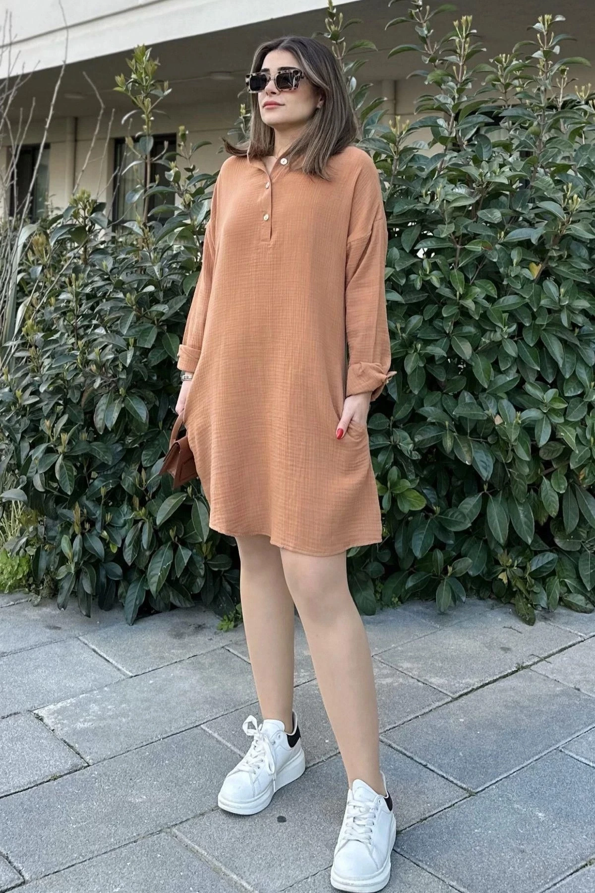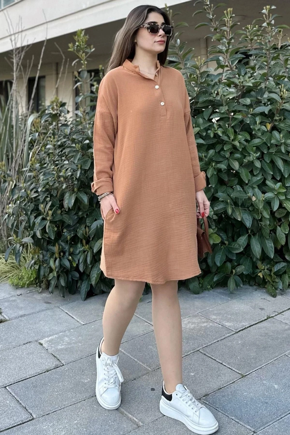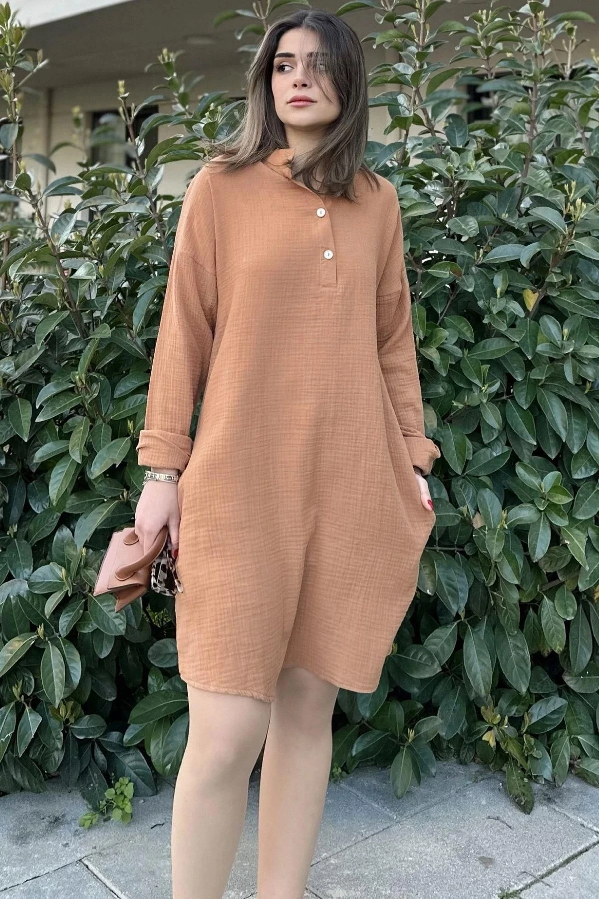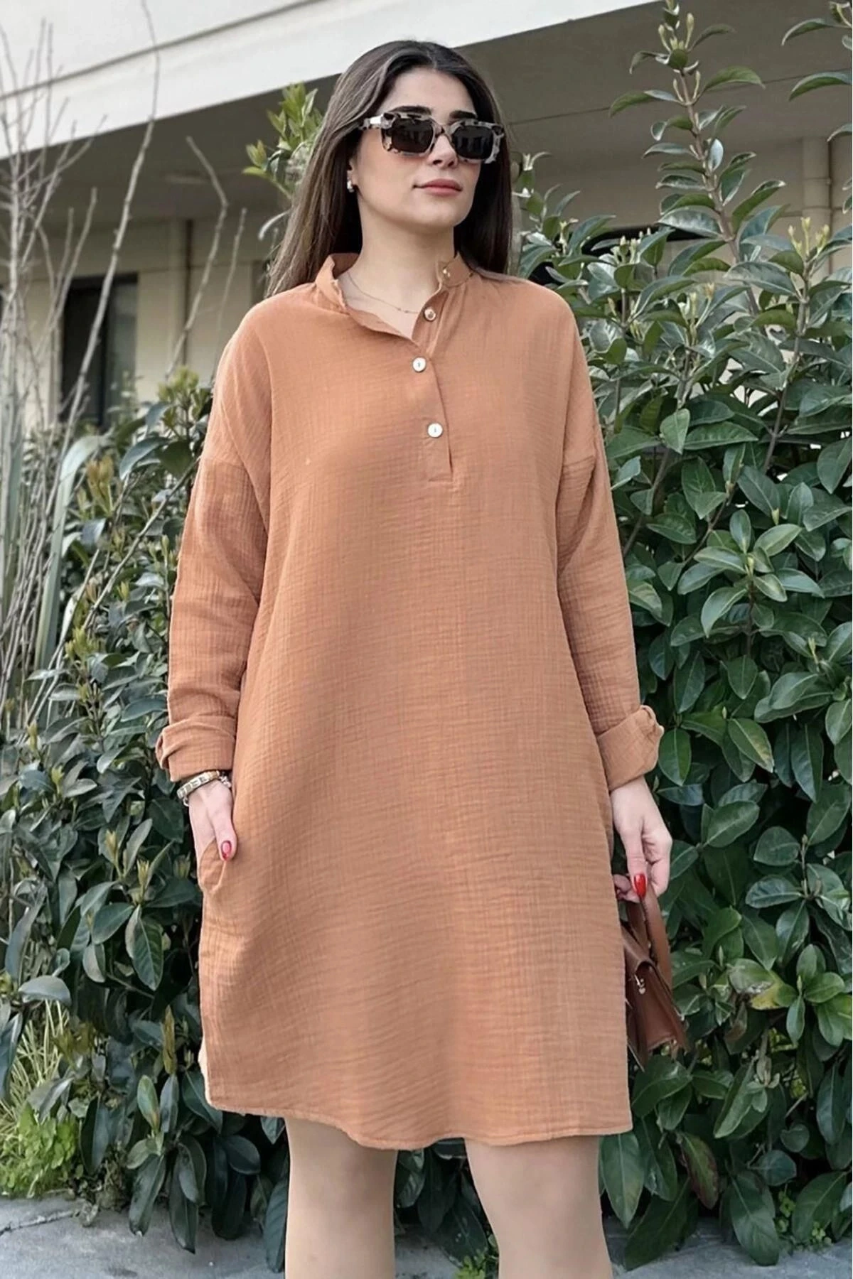 Kadın Kahve Hakim Yaka, Katlamalı Geniş Kol, Midi & Oversize Kesim, Salaş Müslin Elbise