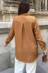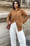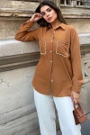 Kadın Kahve İnci Süslemeli, Çift Cep Detaylı, Arkası Pliseli, Terletmez, Kupra Kumaş, Salaş Gömlek
