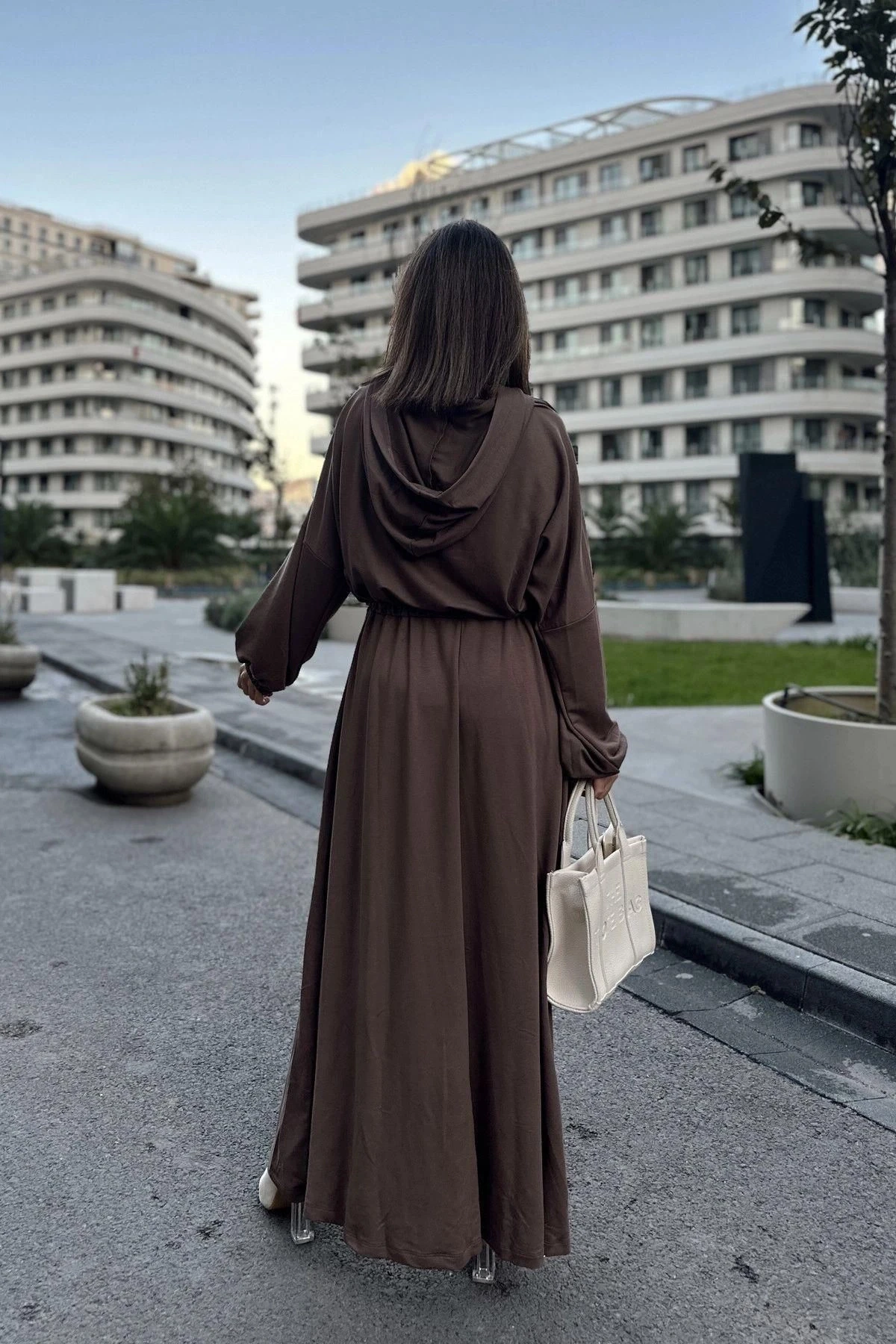 Kadın Kahve Kapüşonlu, Kanguru Cep Detaylı, Beli Lastikli, Salaş Uzun Elbise