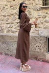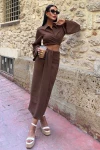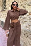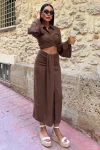 Kadın Kahve Keten Uzun Gömlek Yaka İkili Takım