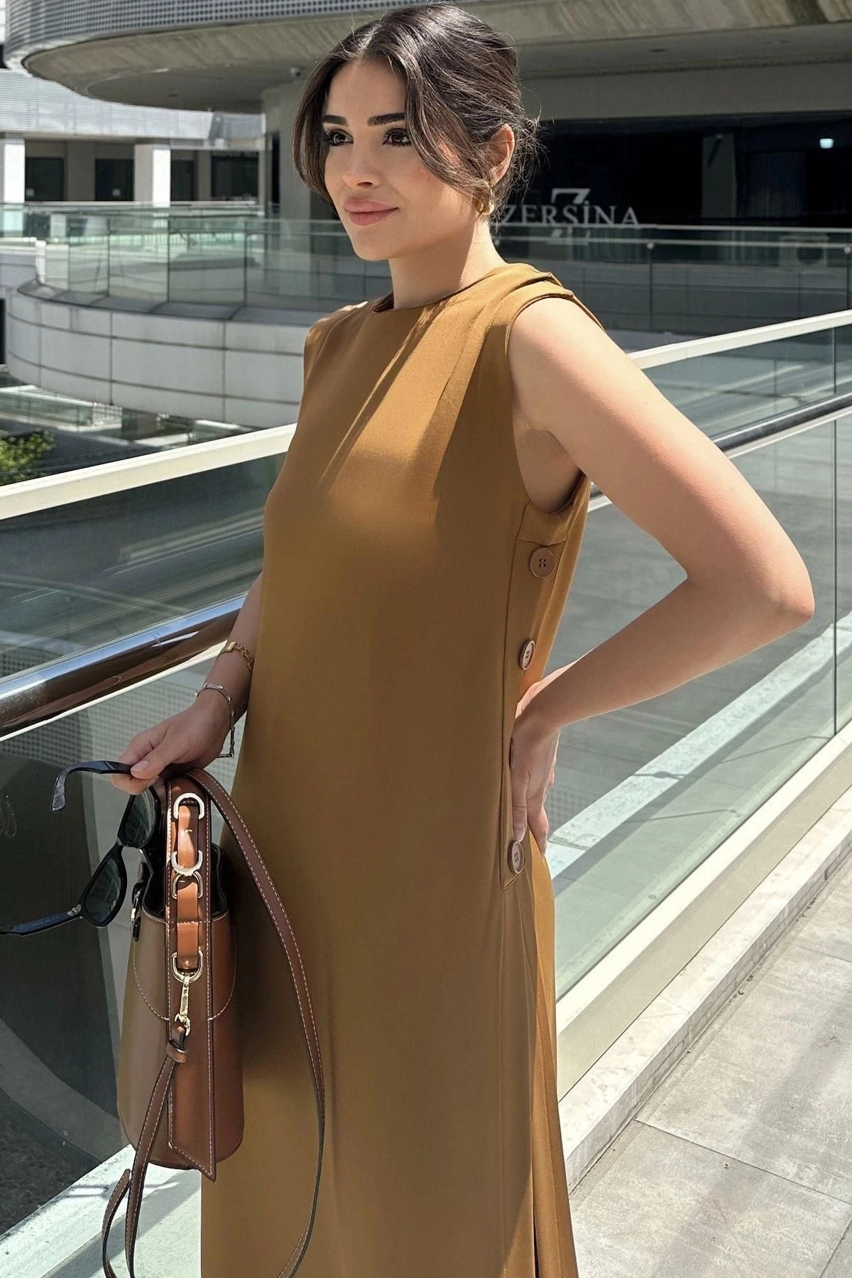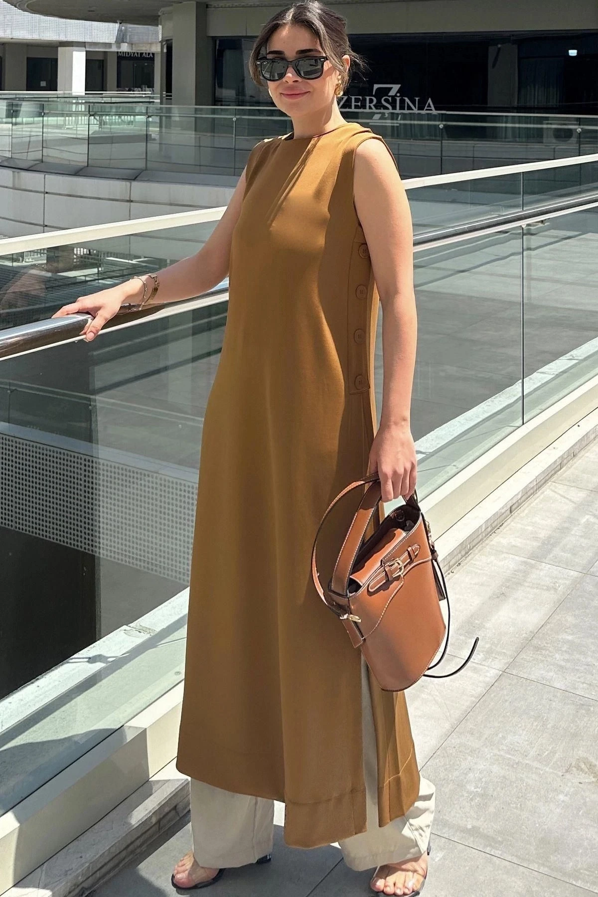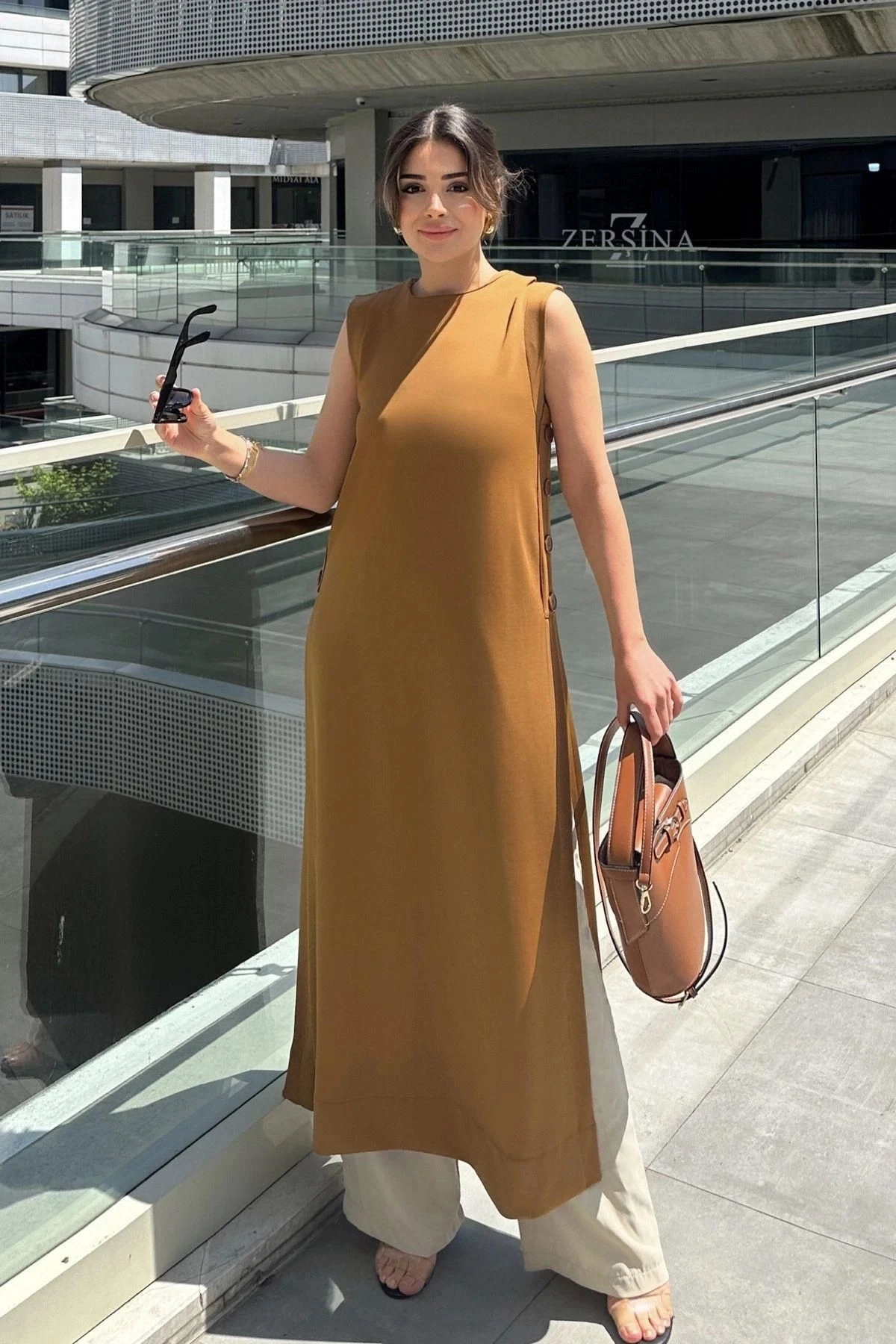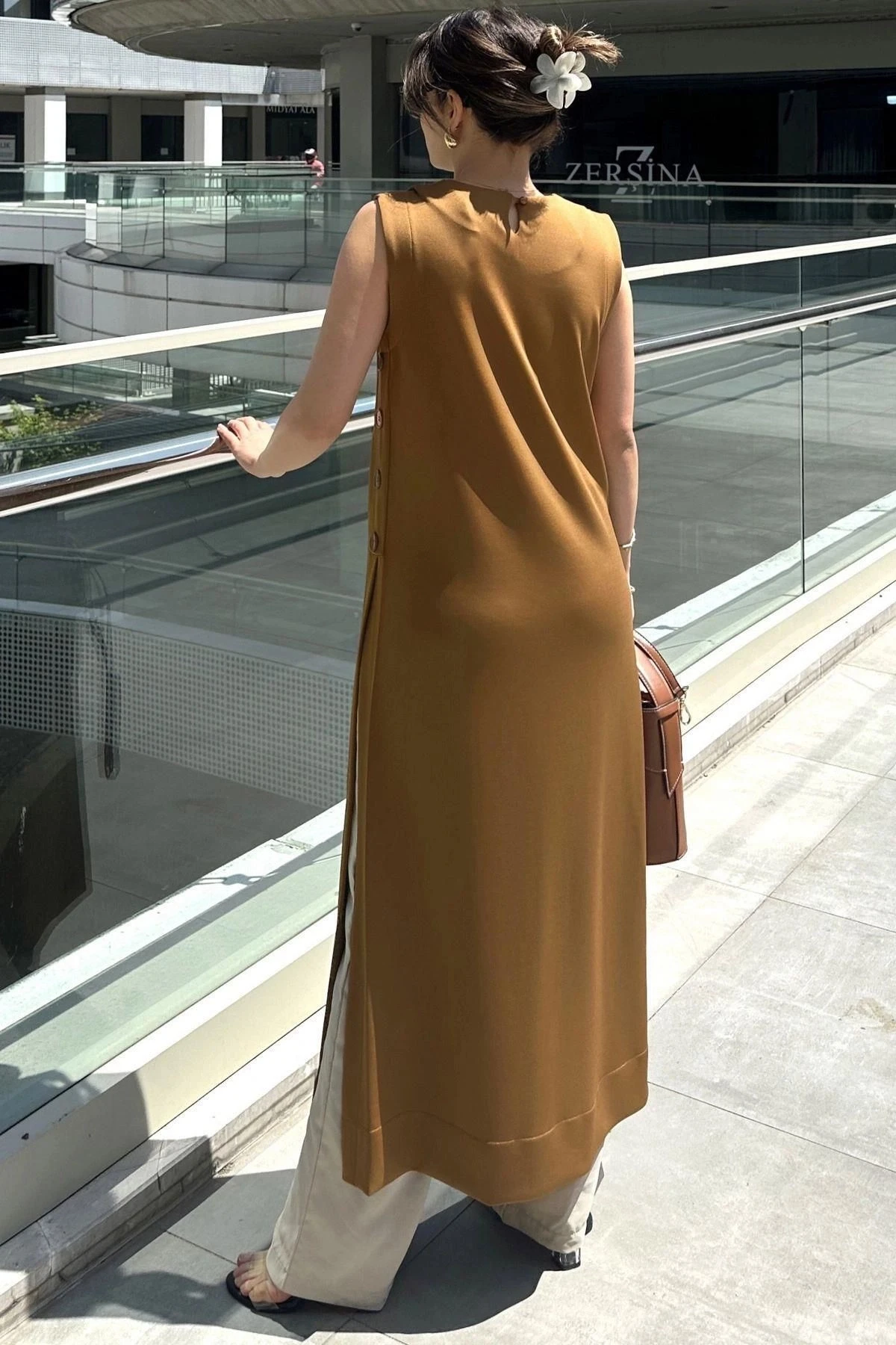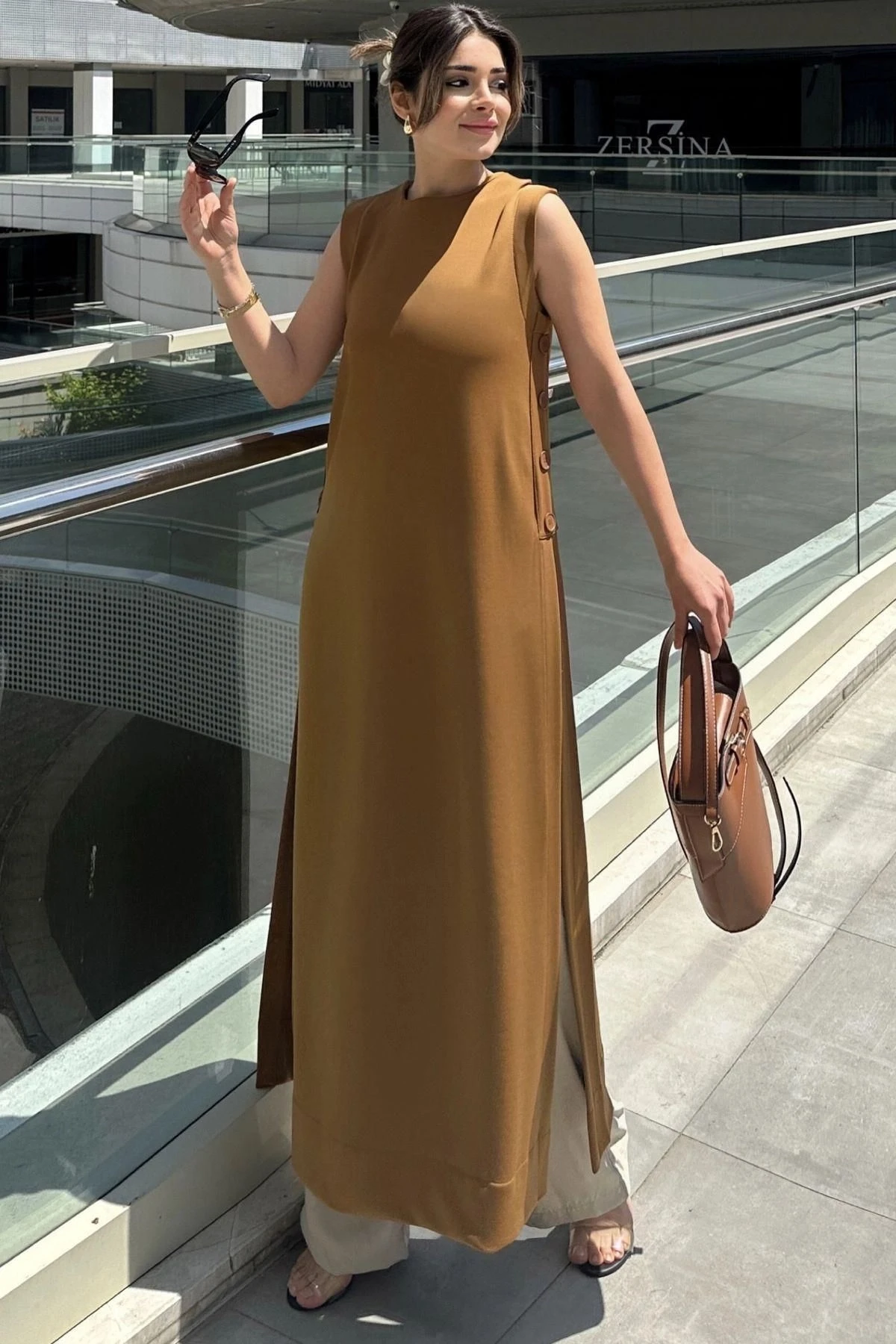 Kadın Kahve Kolsuz, Yuvarlak Yaka, Derin Yırtmaçlı, A Kesim Likralı Tunik Elbise