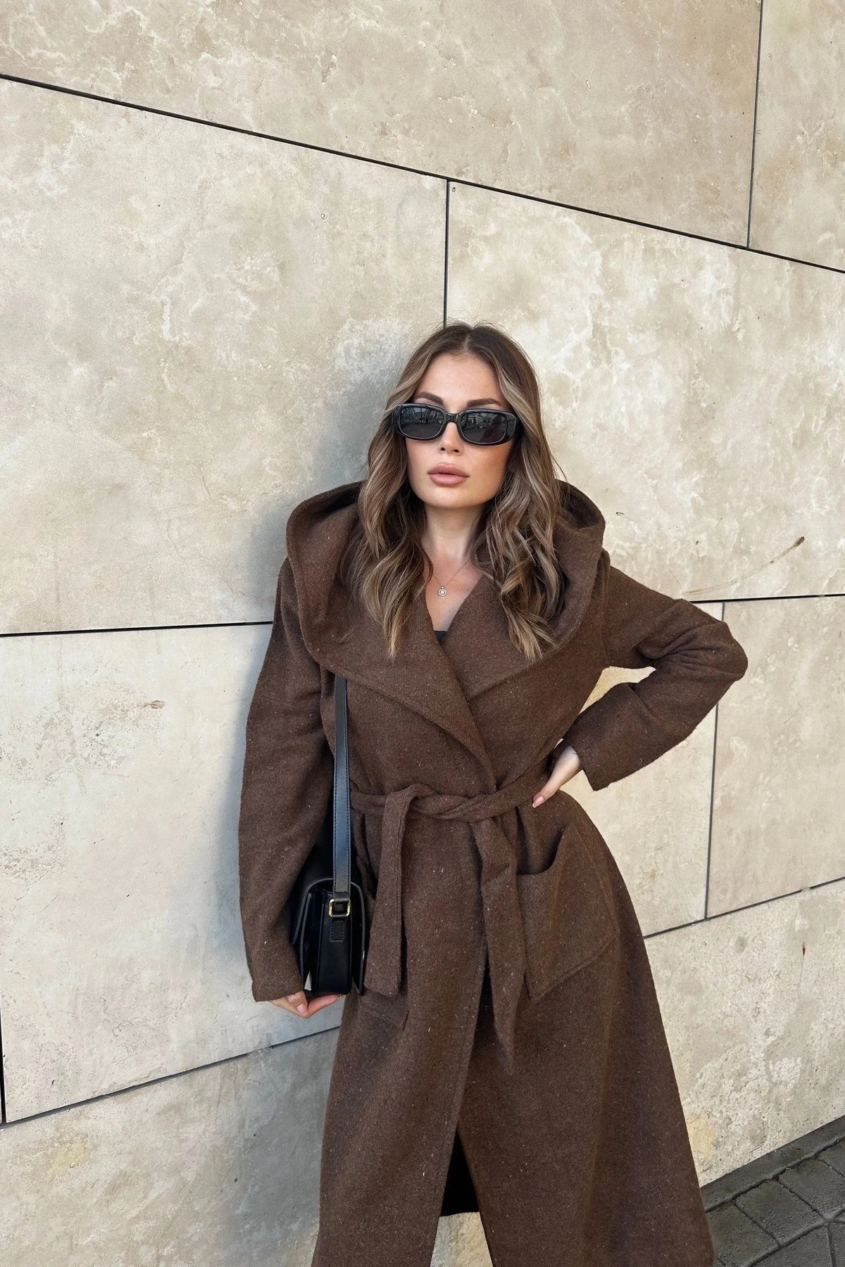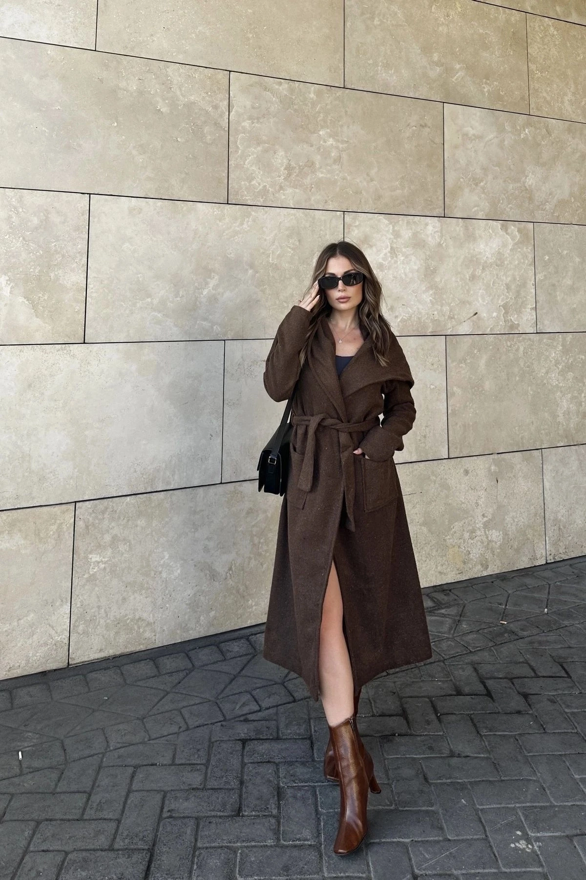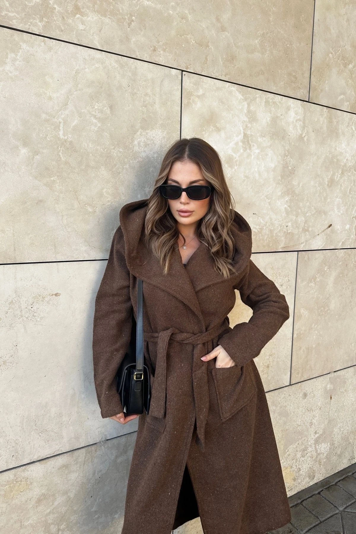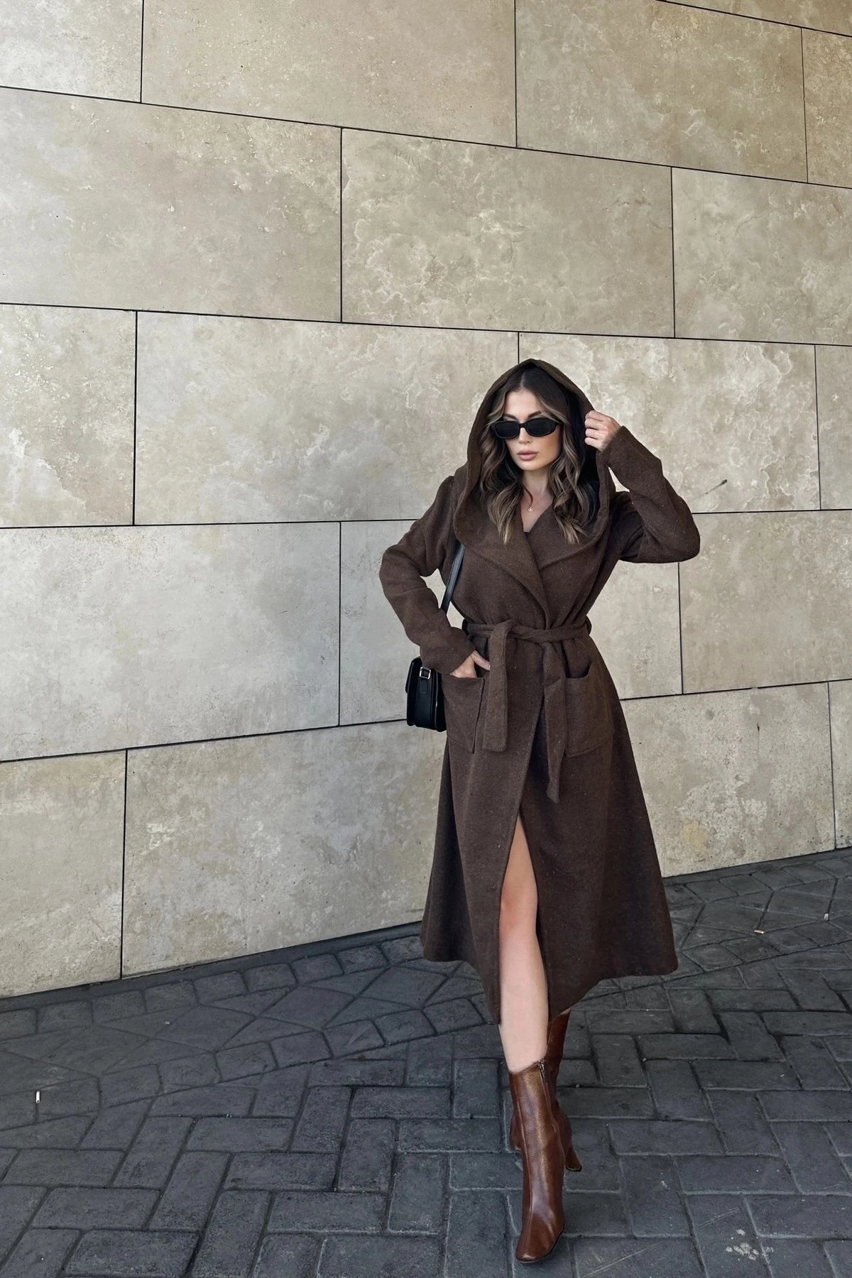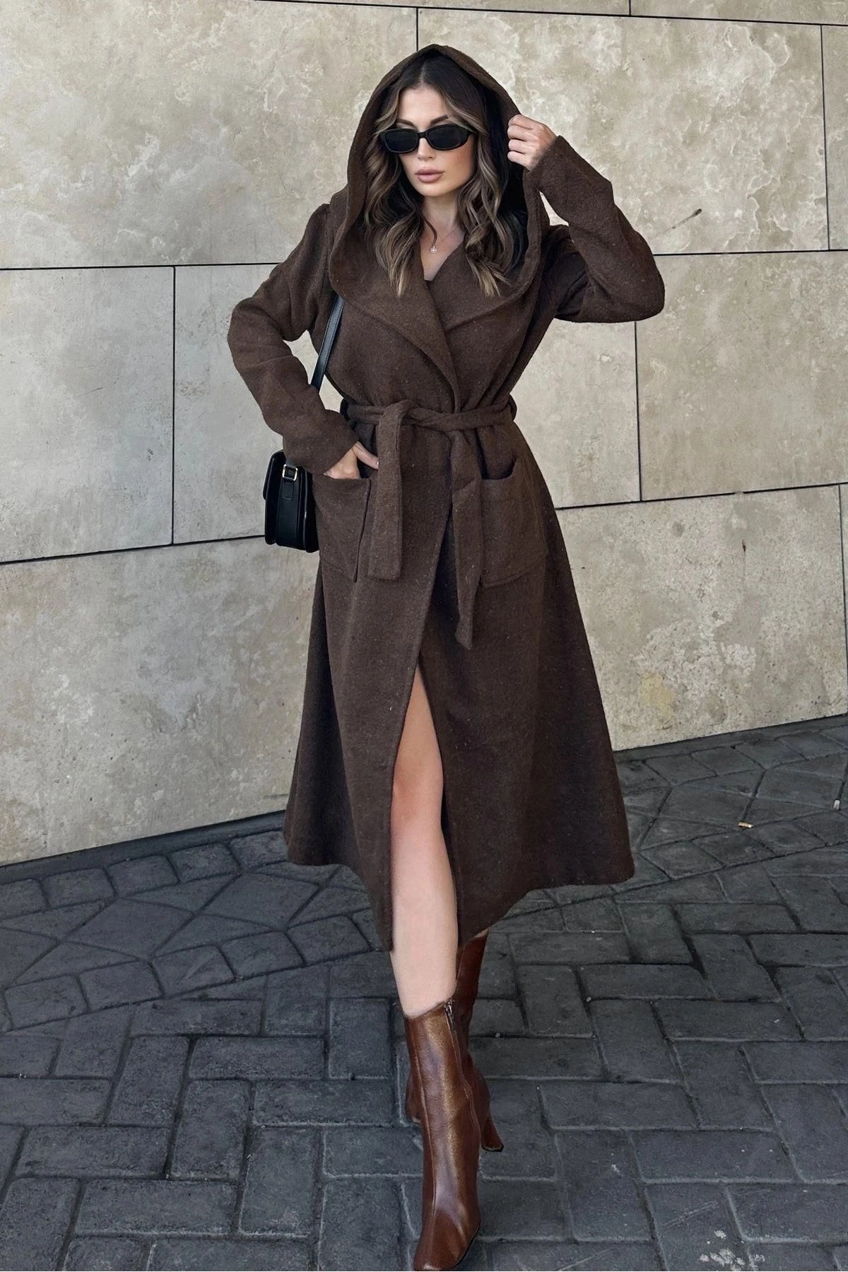 Kadın Kahve Kruvaze Yaka, Kapüşonlu, Çift Cepli, Beli Kemerli, Uzun Kaşe Kaban (ASTARSIZ)