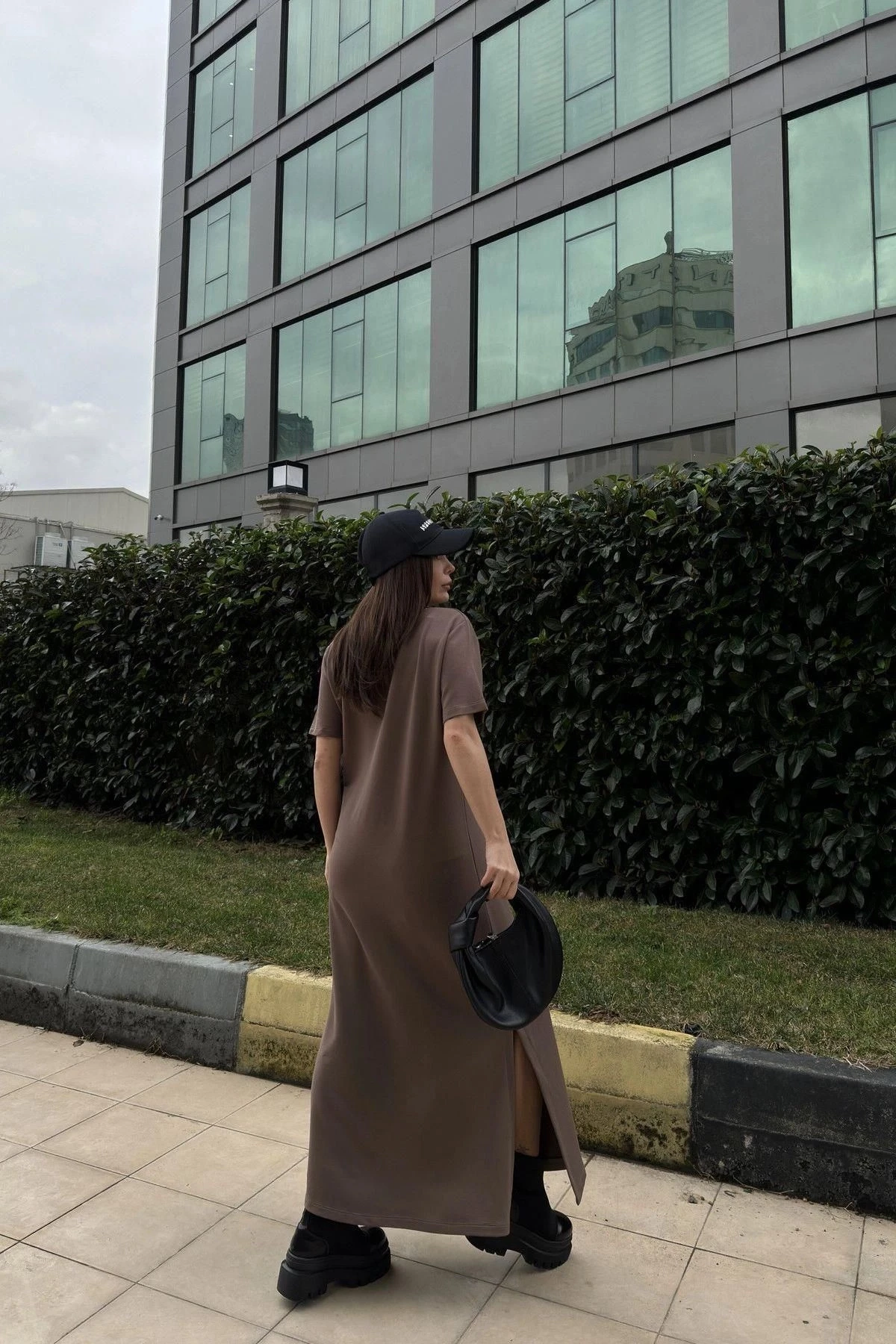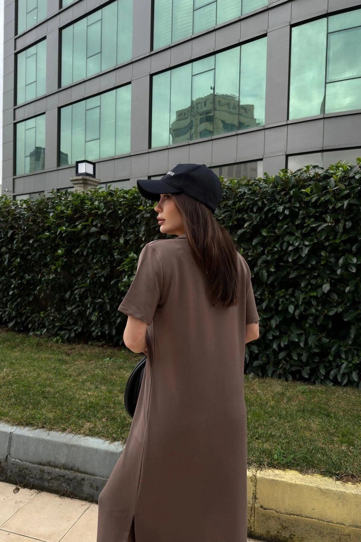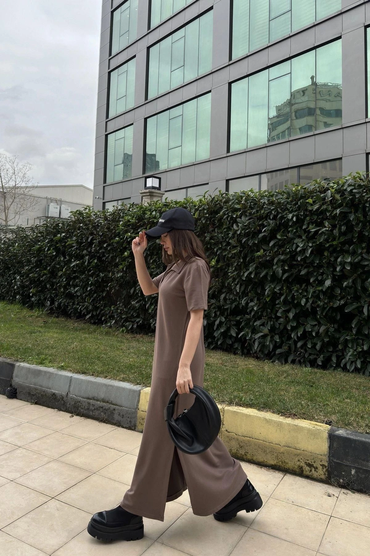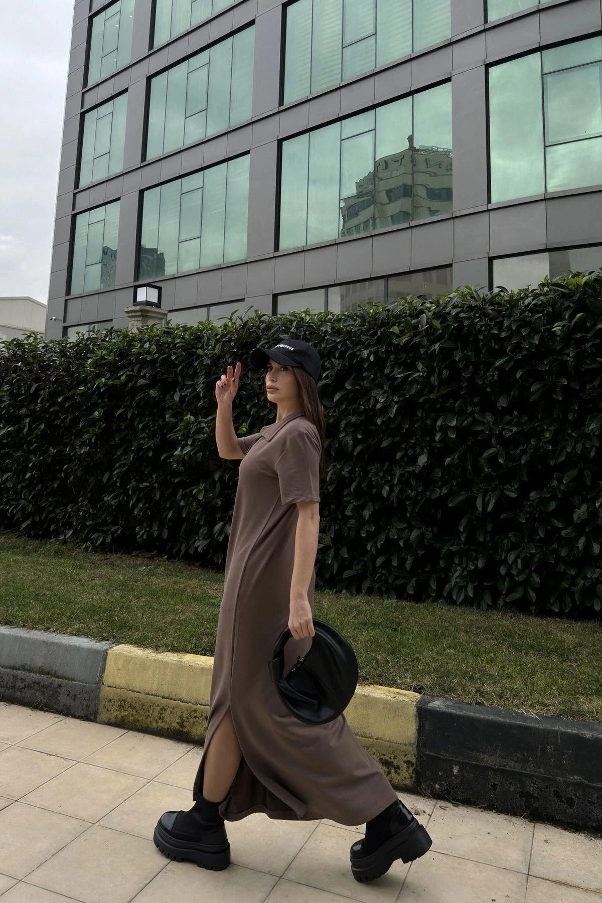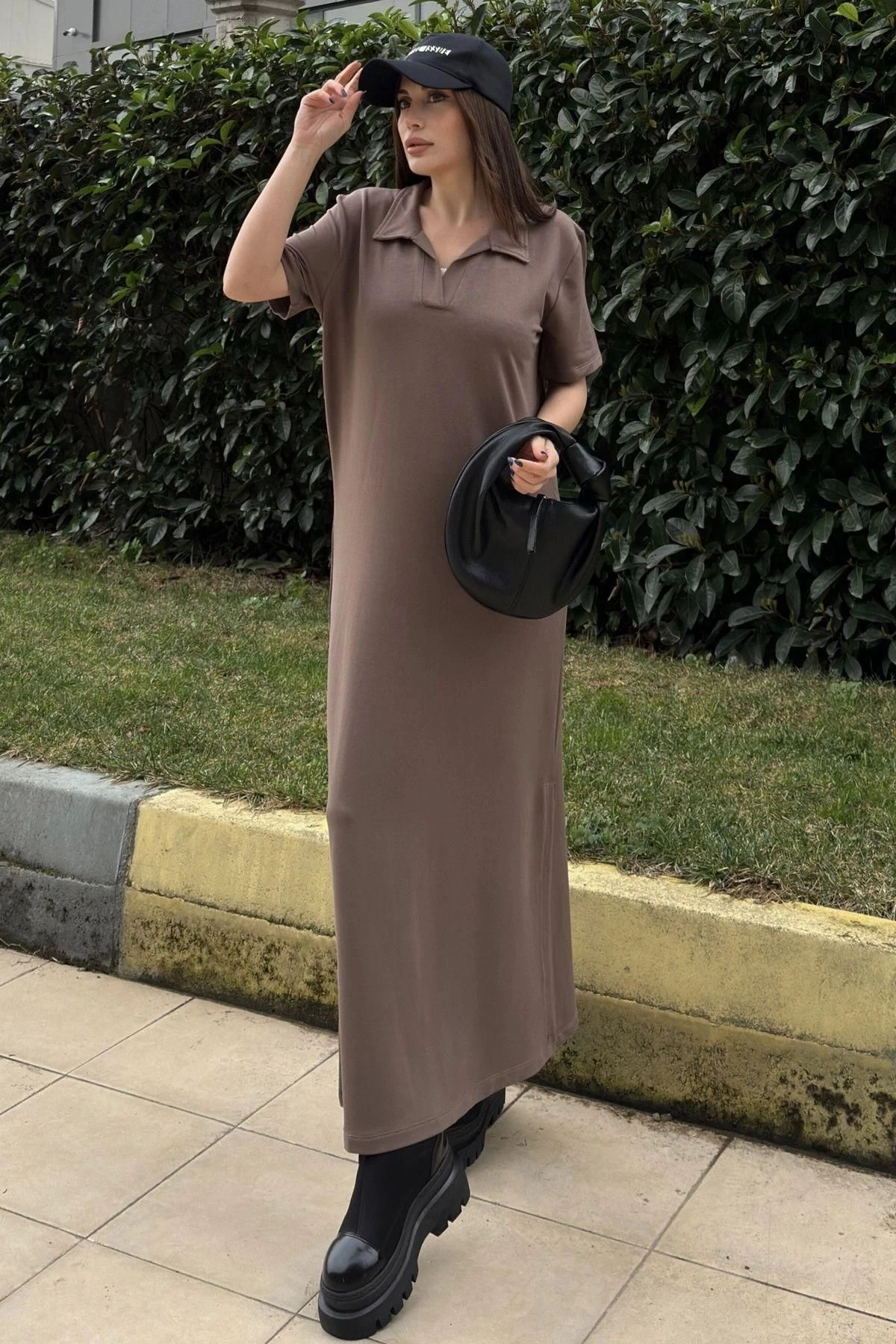 Kadın Kahve Polo Yaka, Kısa Kol, Yırtmaçlı, Basic Model, Uzun Salaş Elbise